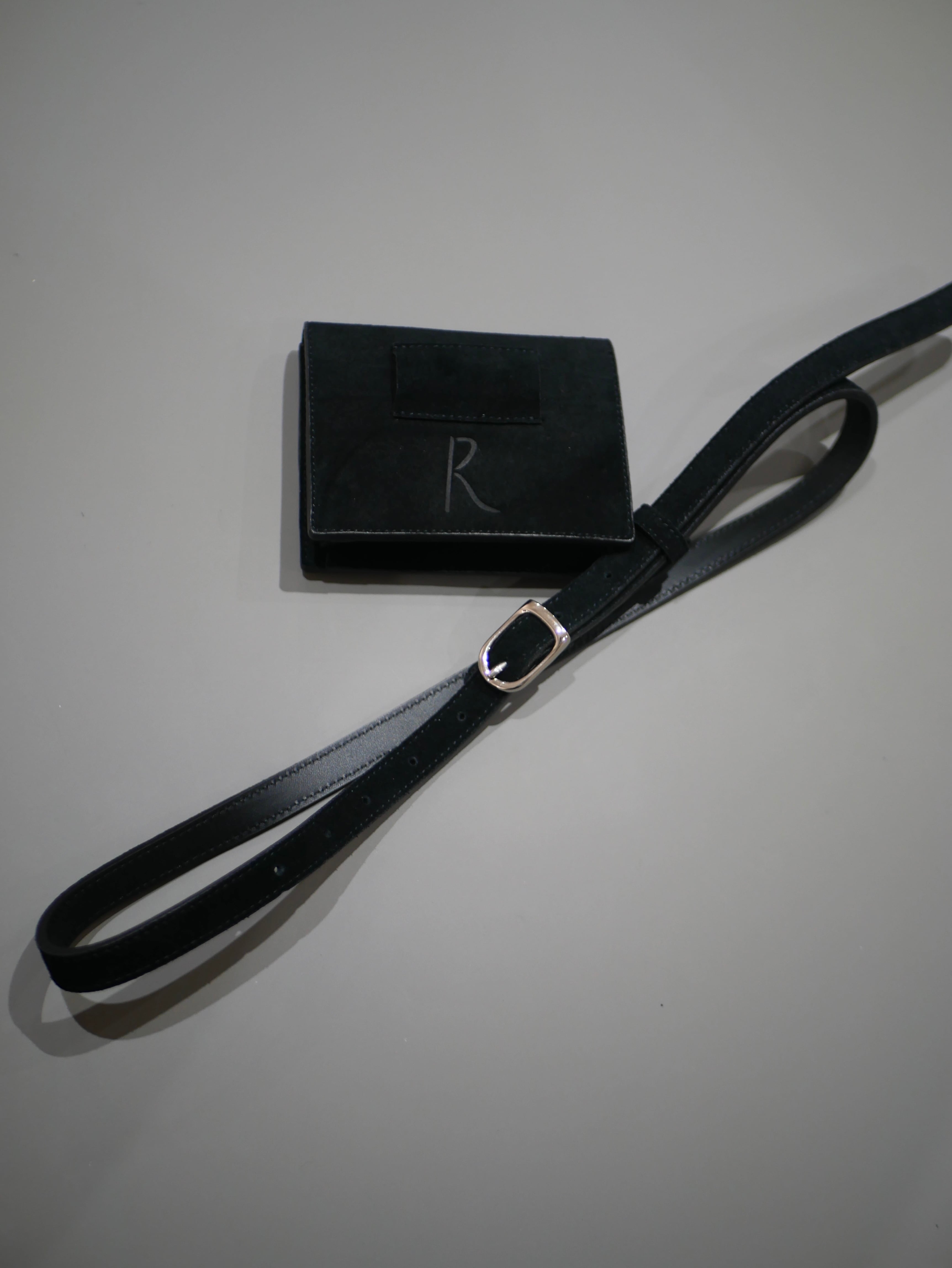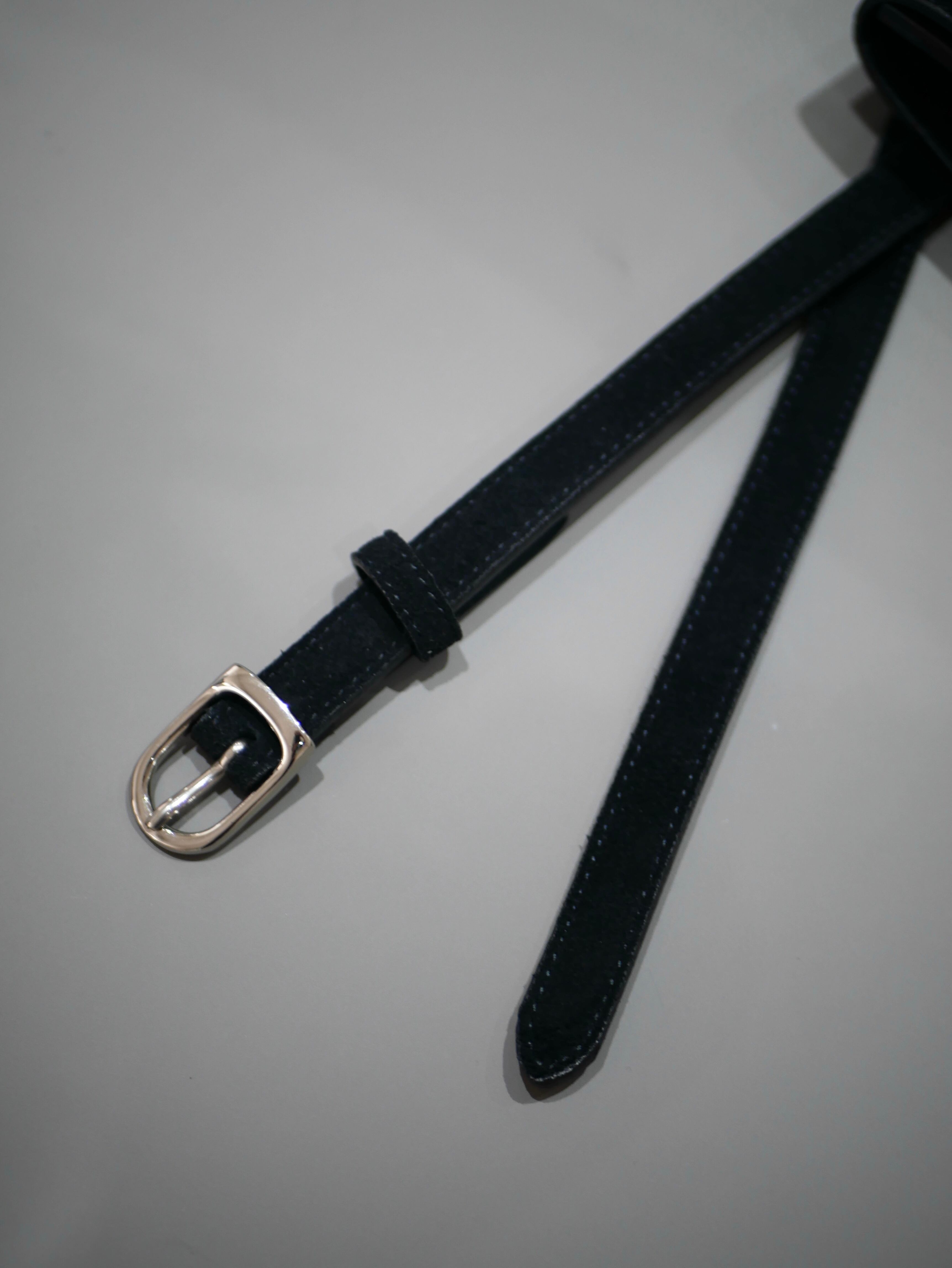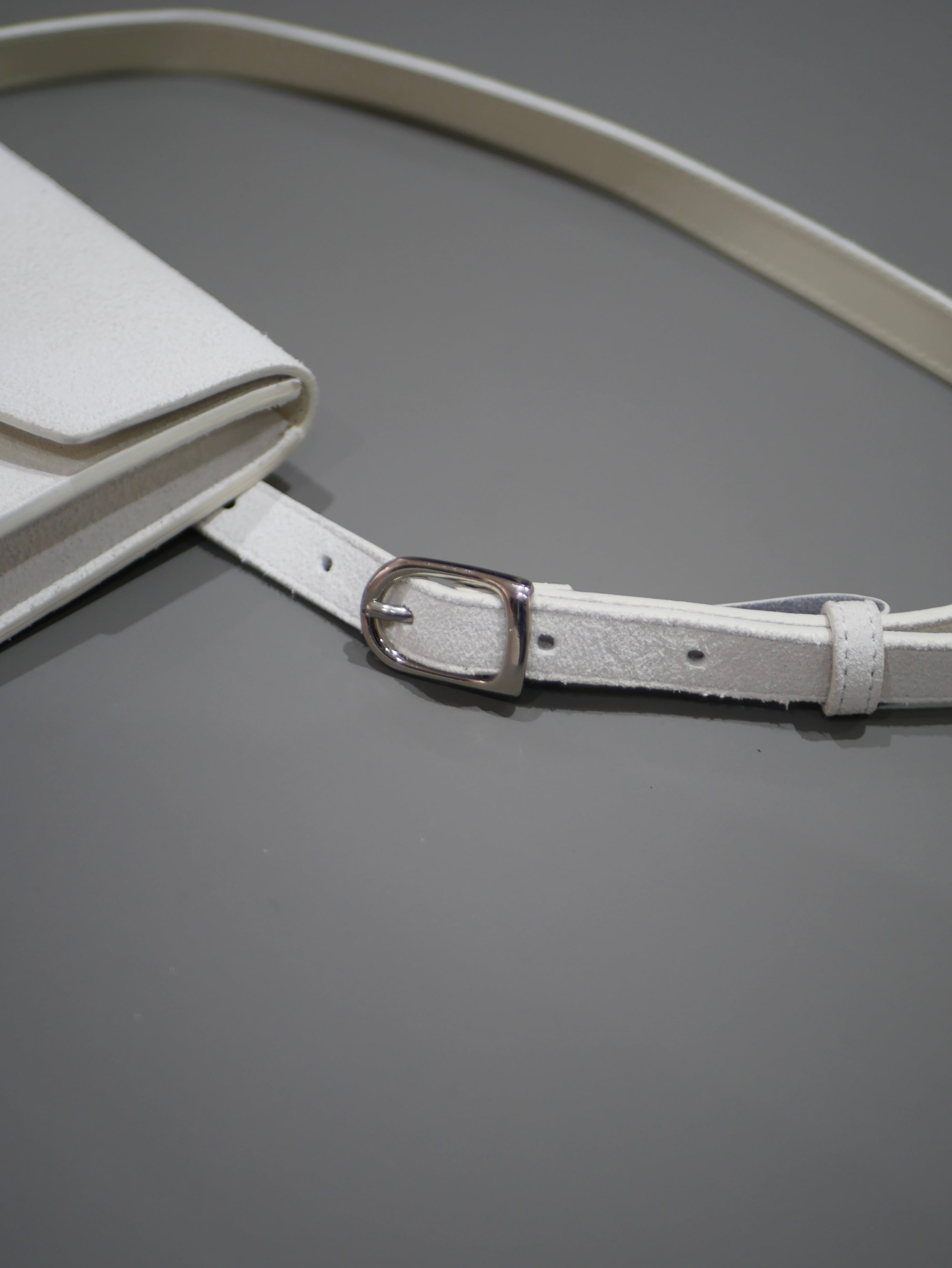 ヌバックレザーを使用した、取り外し可能なポーチ付きレザーベルト。ワンピースやアウターの上からアクセントとして巻くのはもちろん、ポーチを外してミニマルなウエストベルトとしても活躍。小さな収納と装飾の間を行き来するような、静かな存在感を持ったアイテムです。