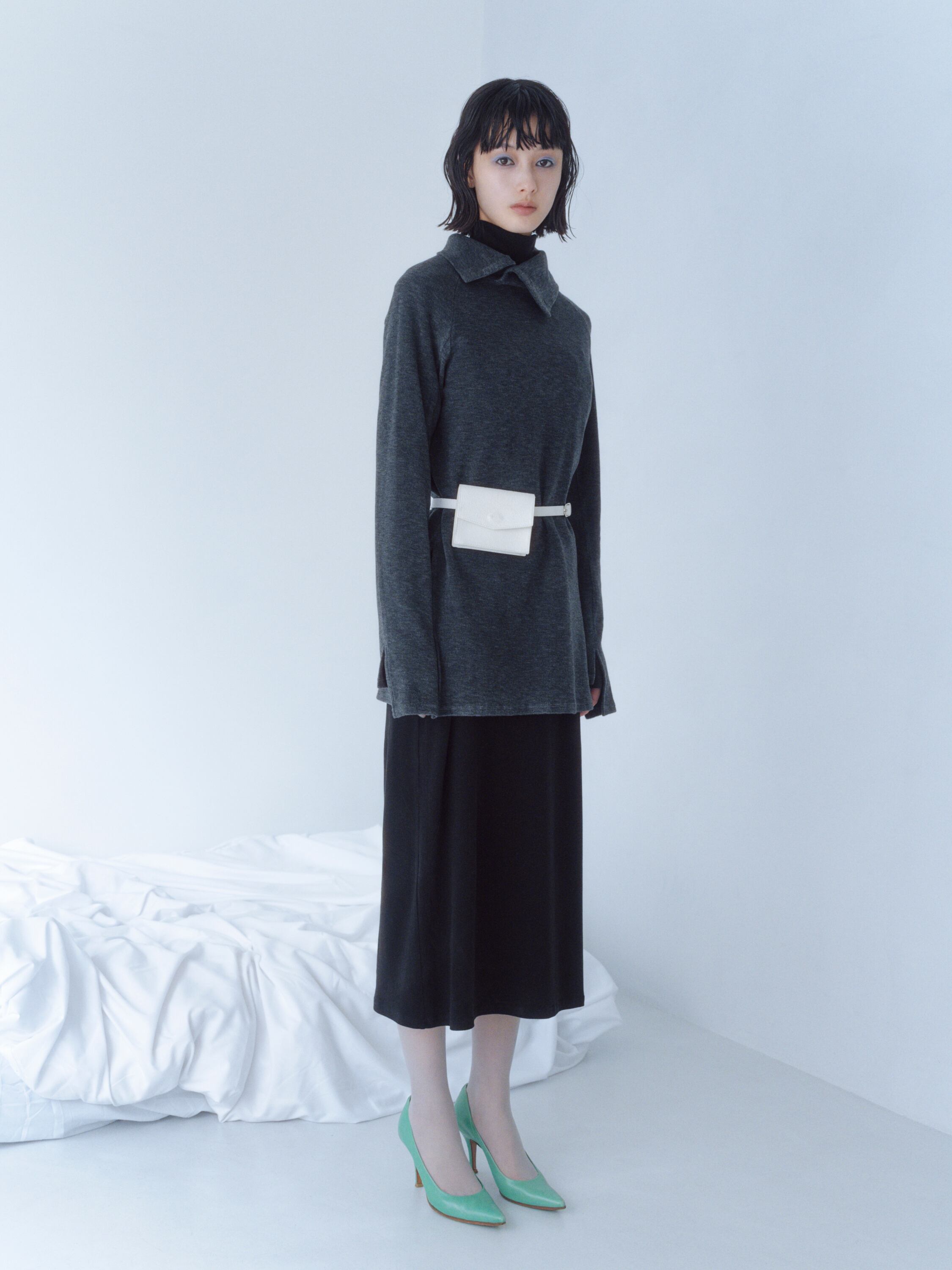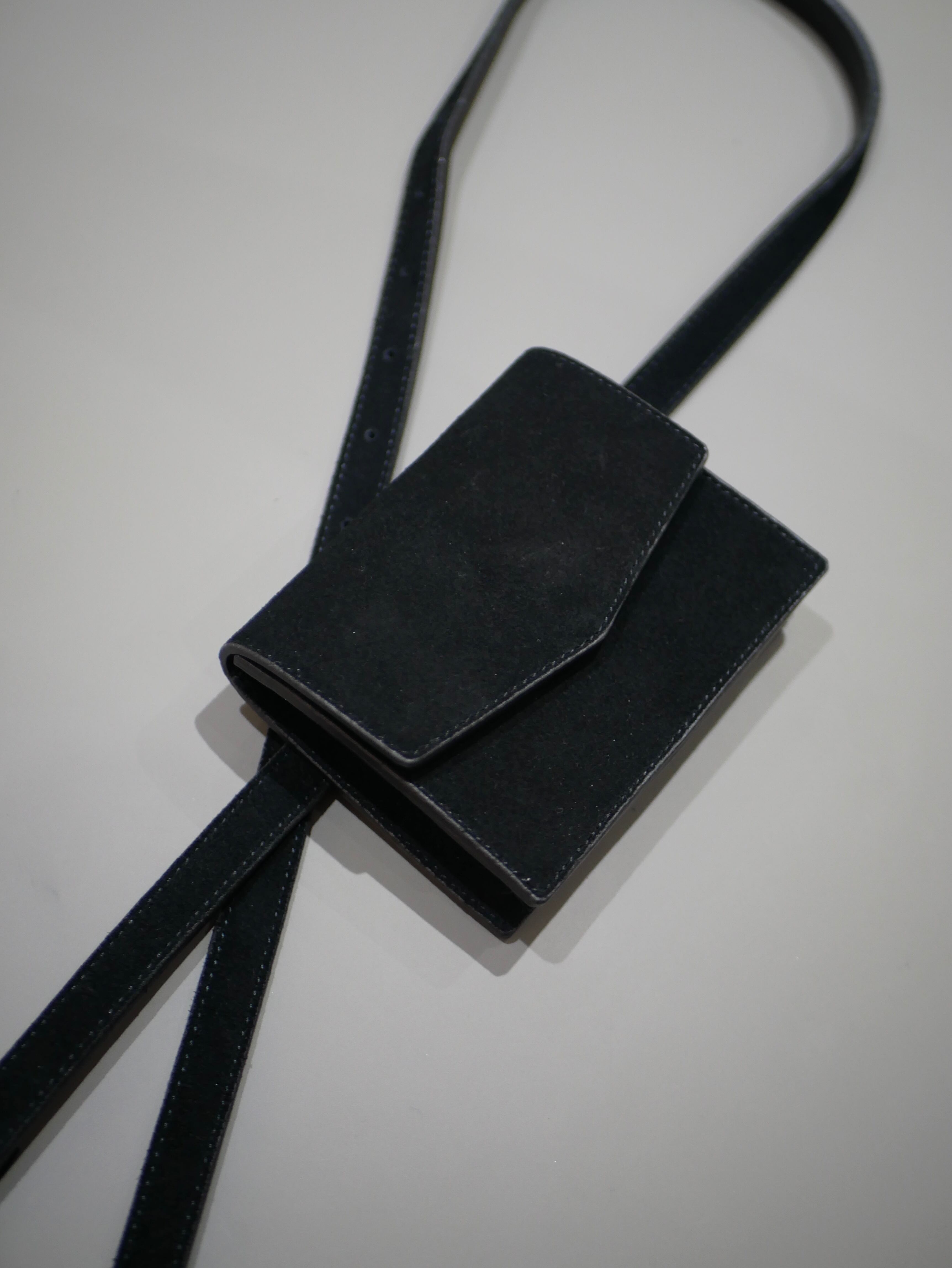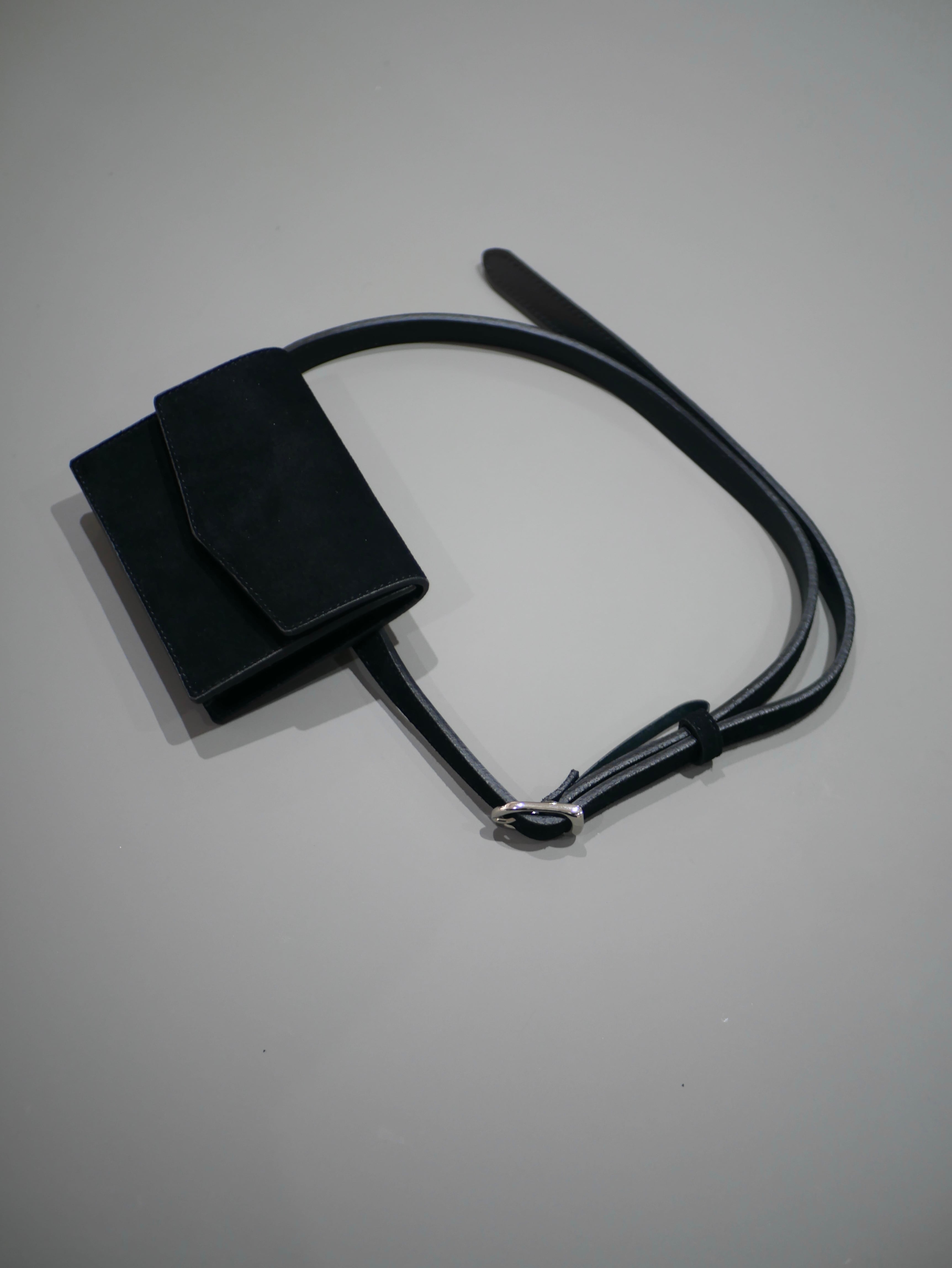 ヌバックレザーを使用した、取り外し可能なポーチ付きレザーベルト。ワンピースやアウターの上からアクセントとして巻くのはもちろん、ポーチを外してミニマルなウエストベルトとしても活躍。小さな収納と装飾の間を行き来するような、静かな存在感を持ったアイテムです。