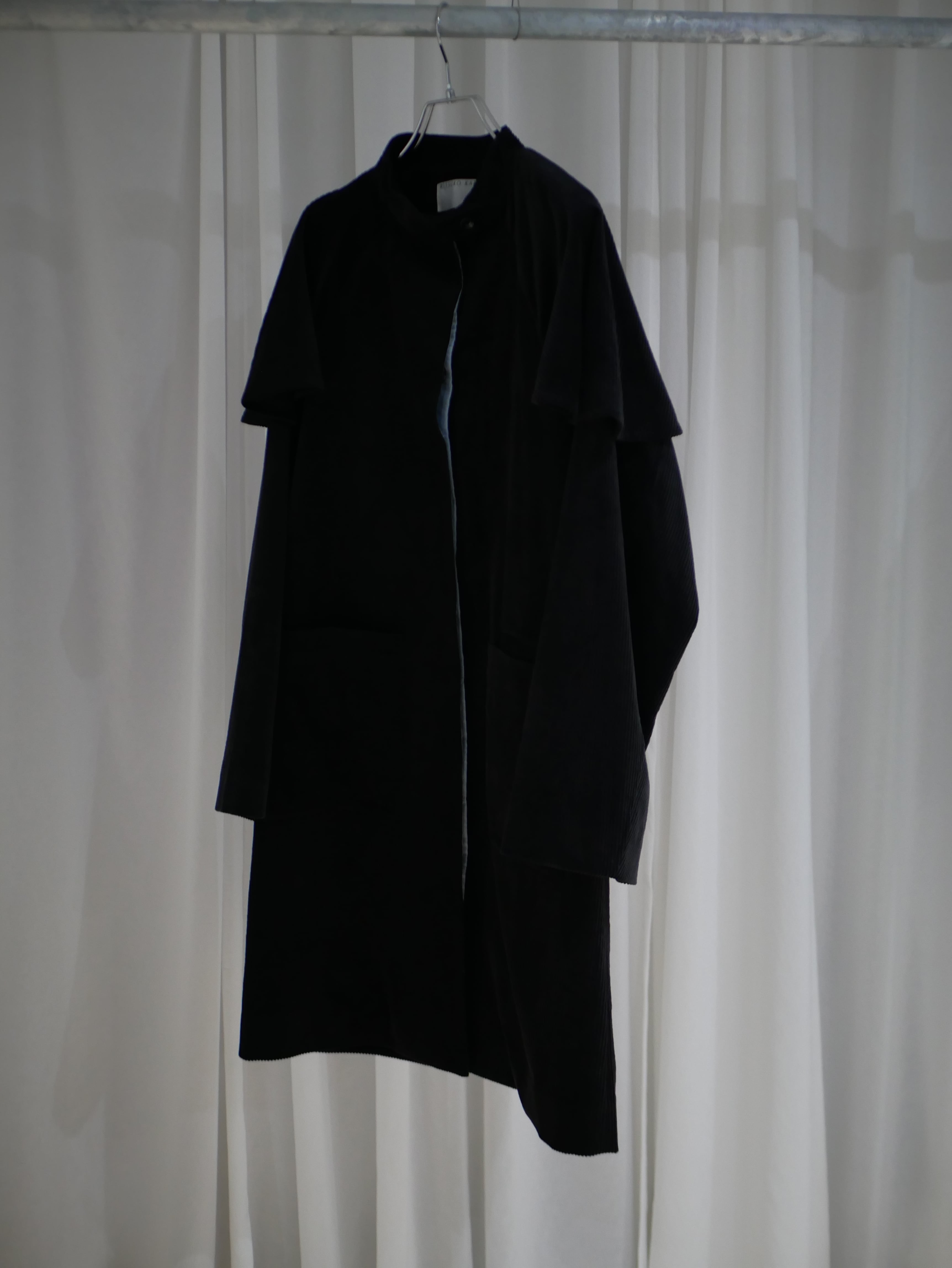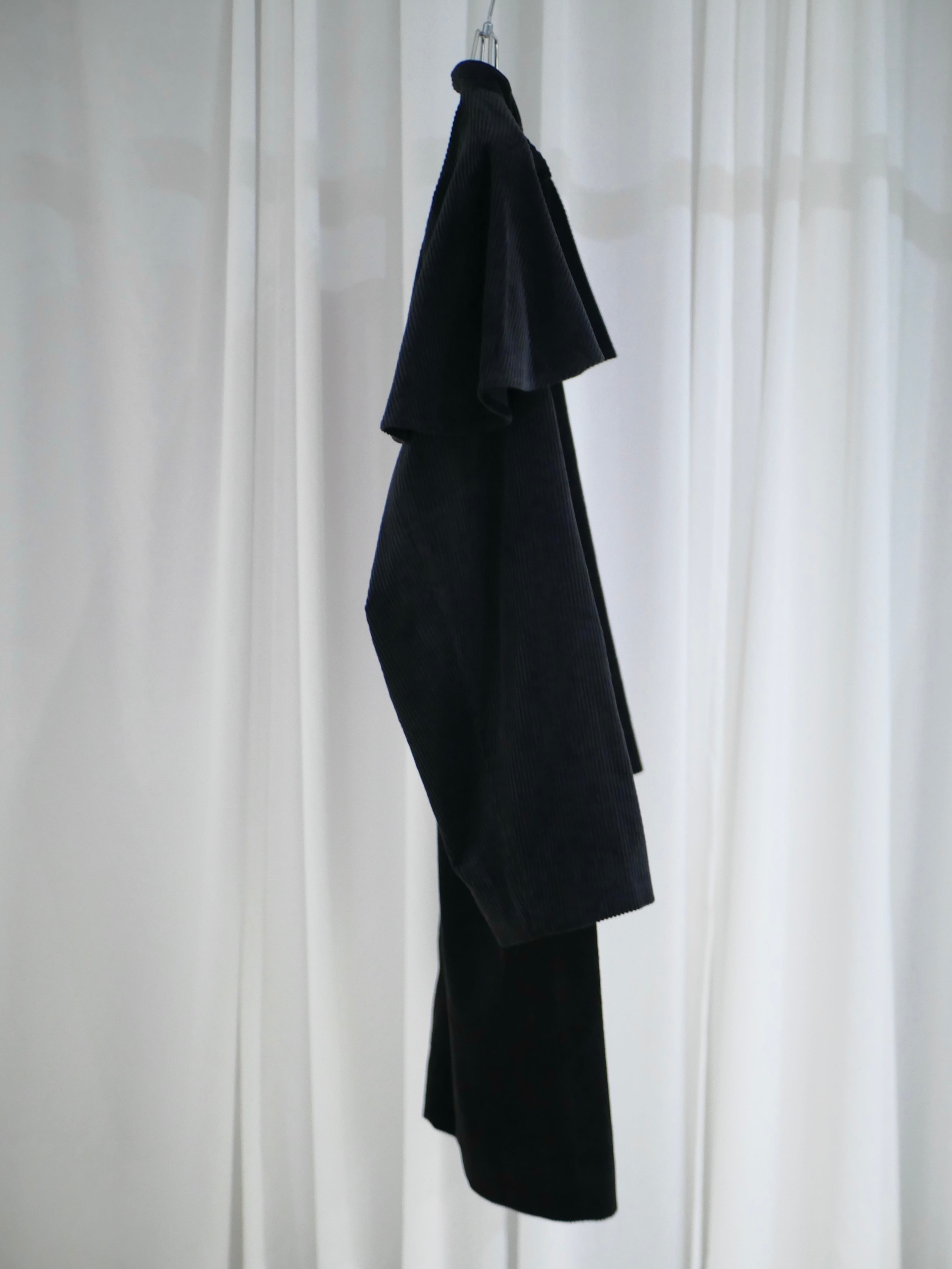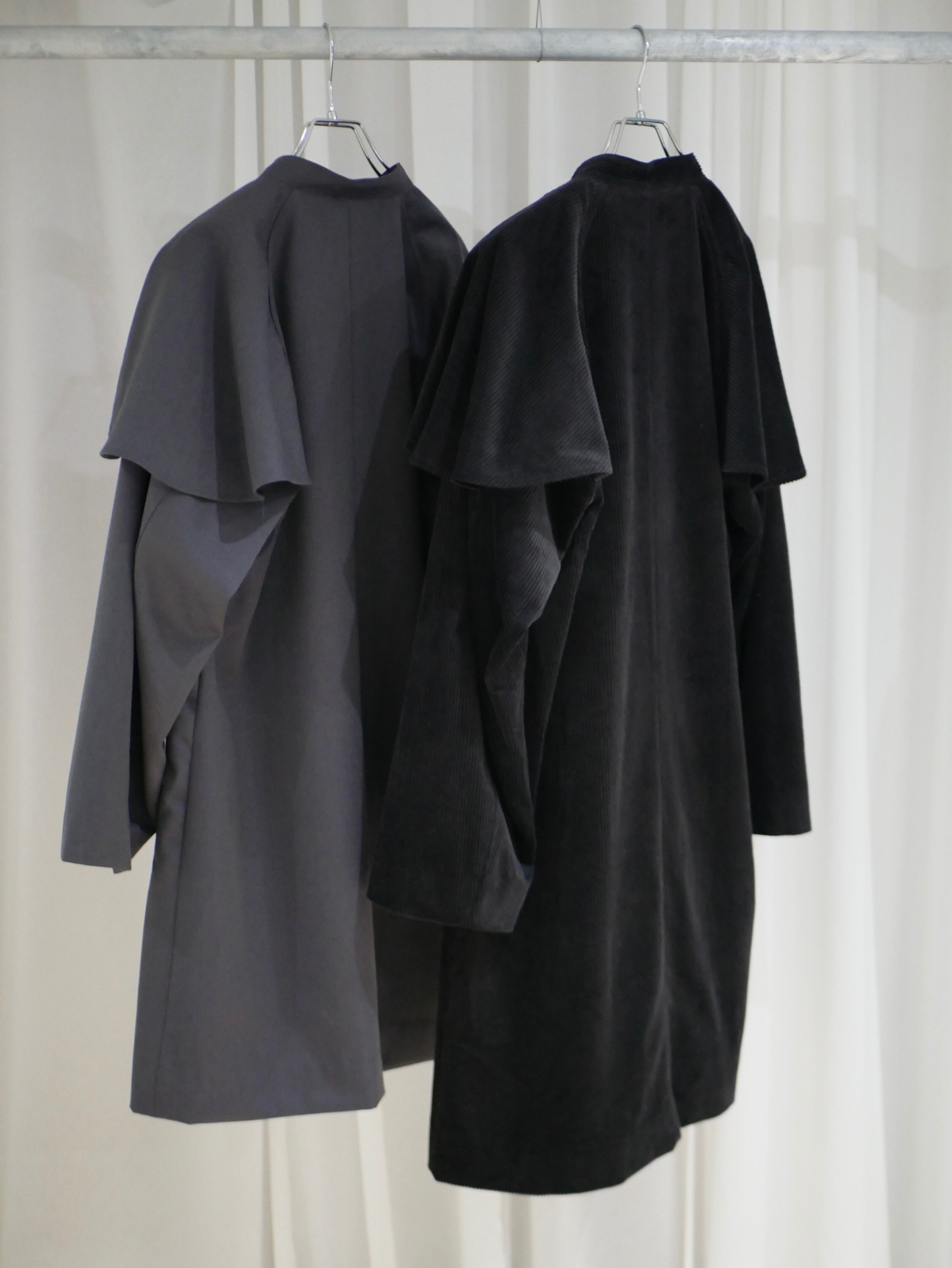 ワンピースのようなシルエットに、肩のフレアが印象的なコンパクトアウター。ボタンやポケット、素材感にはメンズライクな要素を取り入れています。パープルグレーはオリジナルウール、ブラックはコーデュロイ。