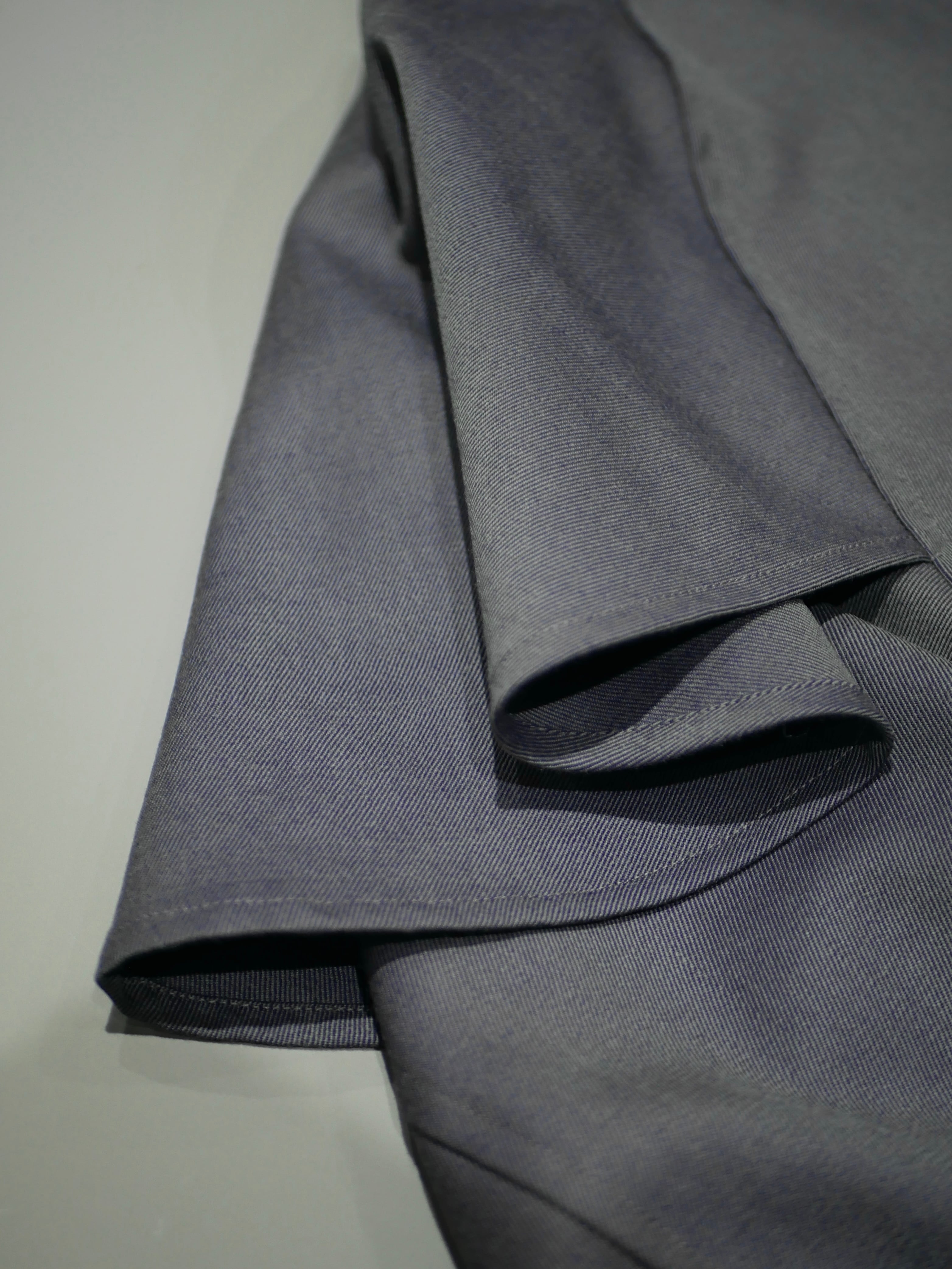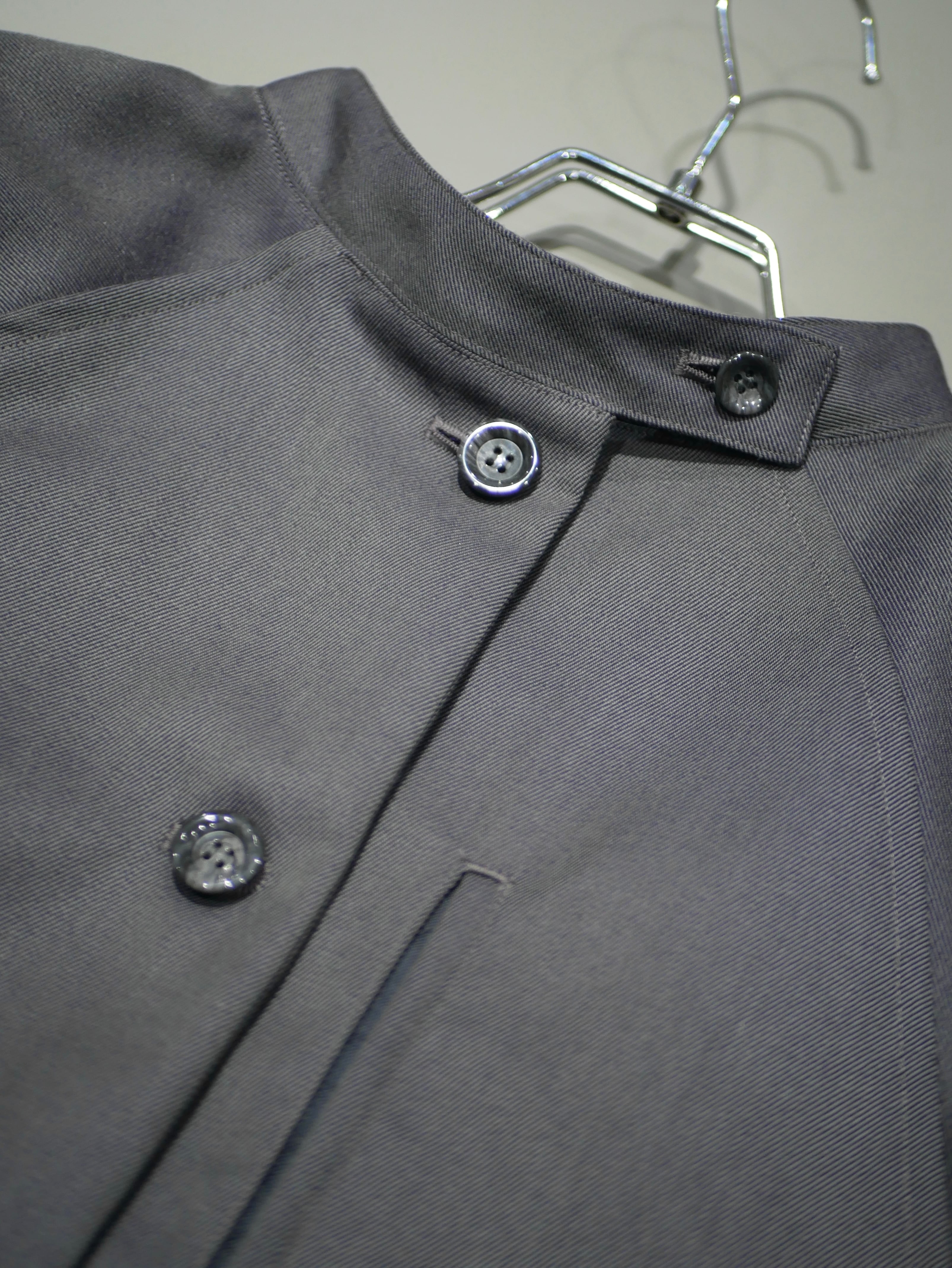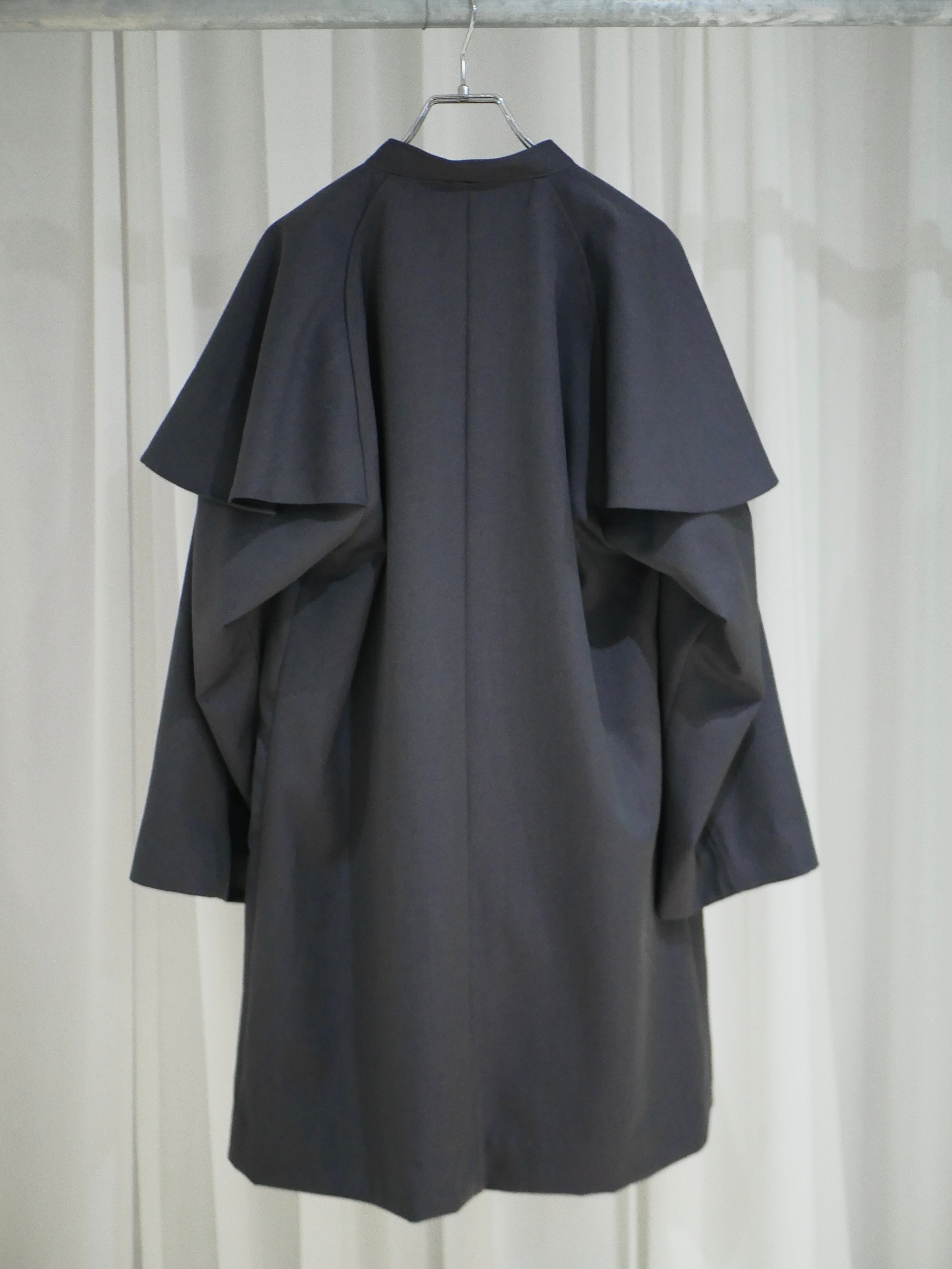 ワンピースのようなシルエットに、肩のフレアが印象的なコンパクトアウター。ボタンやポケット、素材感にはメンズライクな要素を取り入れています。パープルグレーはオリジナルウール、ブラックはコーデュロイ。