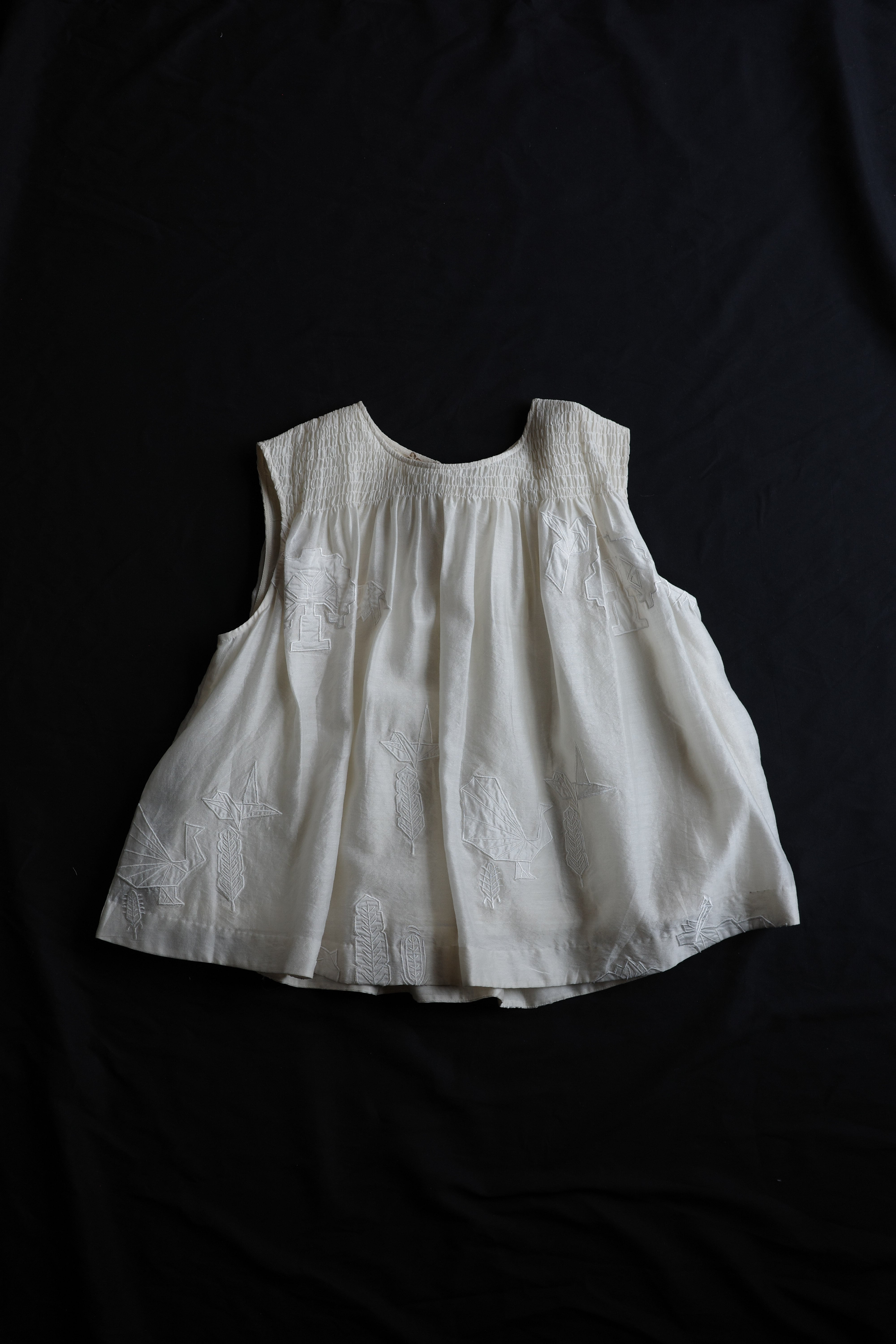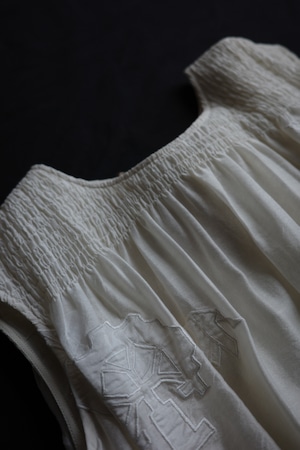 アップリケ、ギャザー、タック、プリーツ、スクリーンプリントなどの技法が用いられています。
