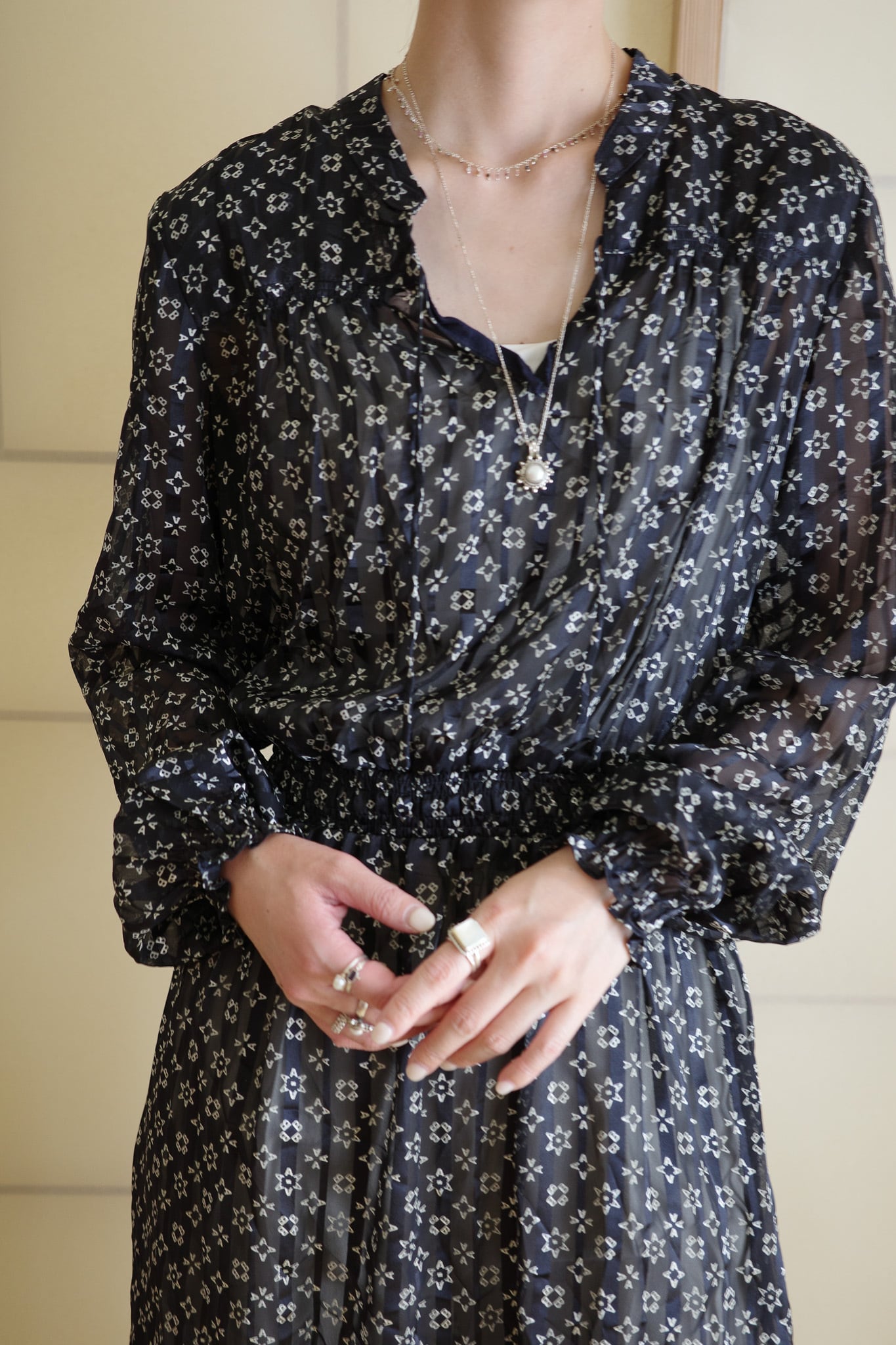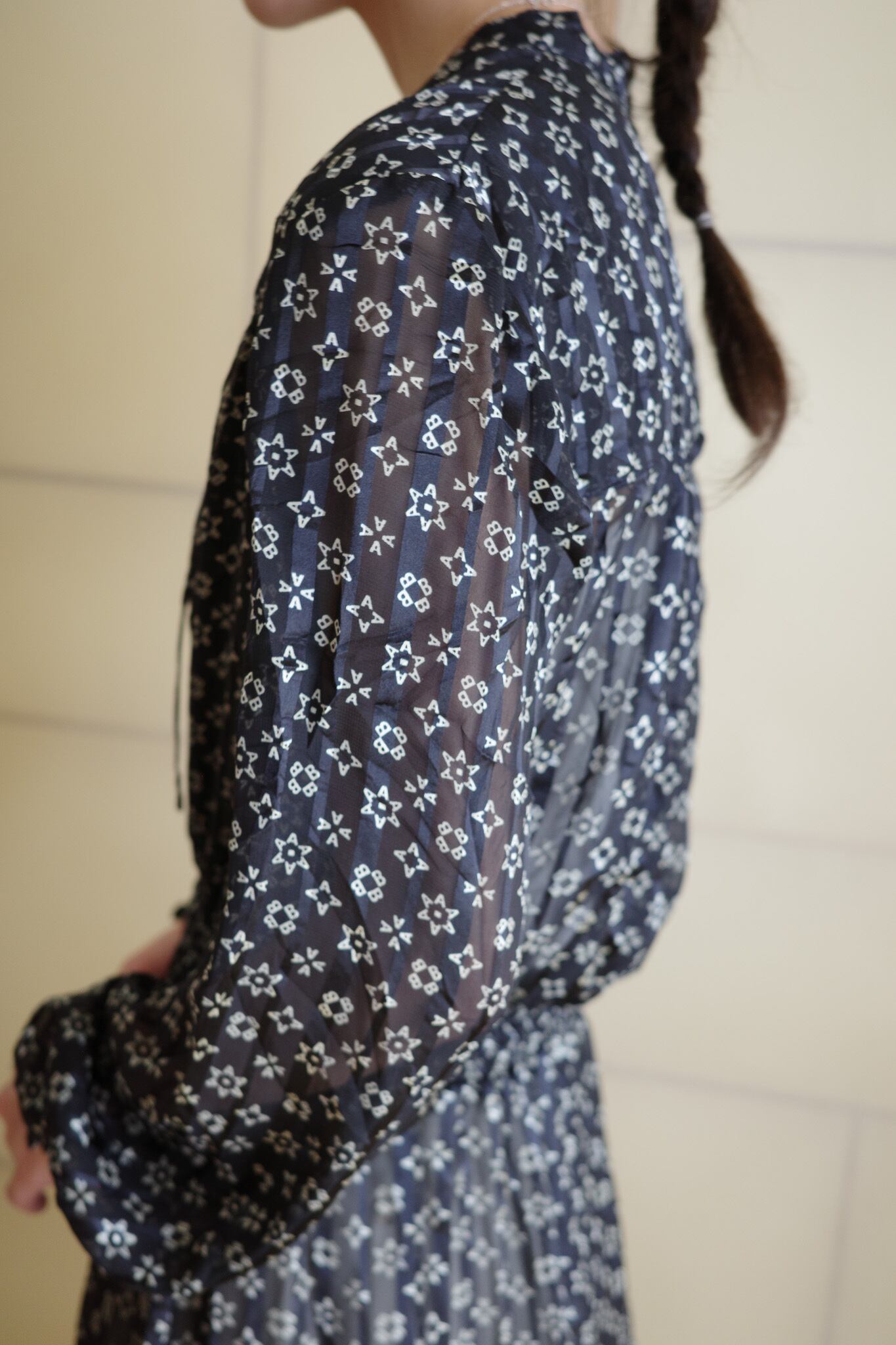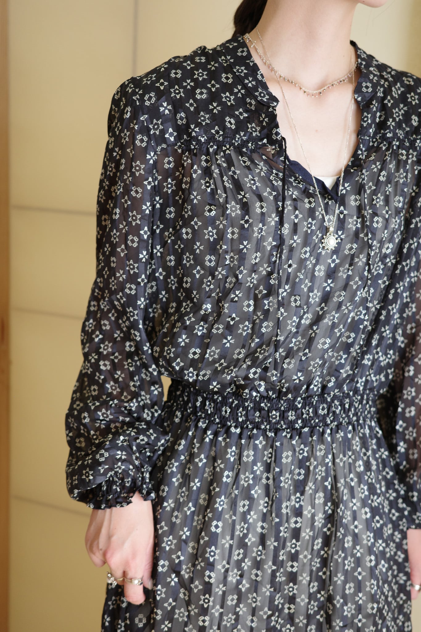 幾何学模様が印象的な、透け感のあるシアーブラウス。