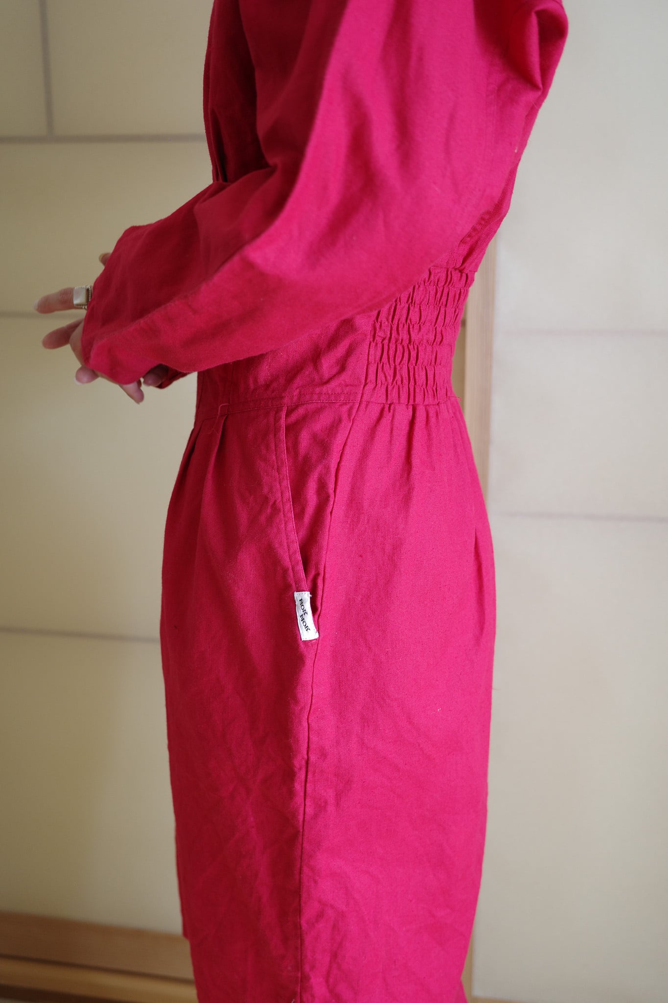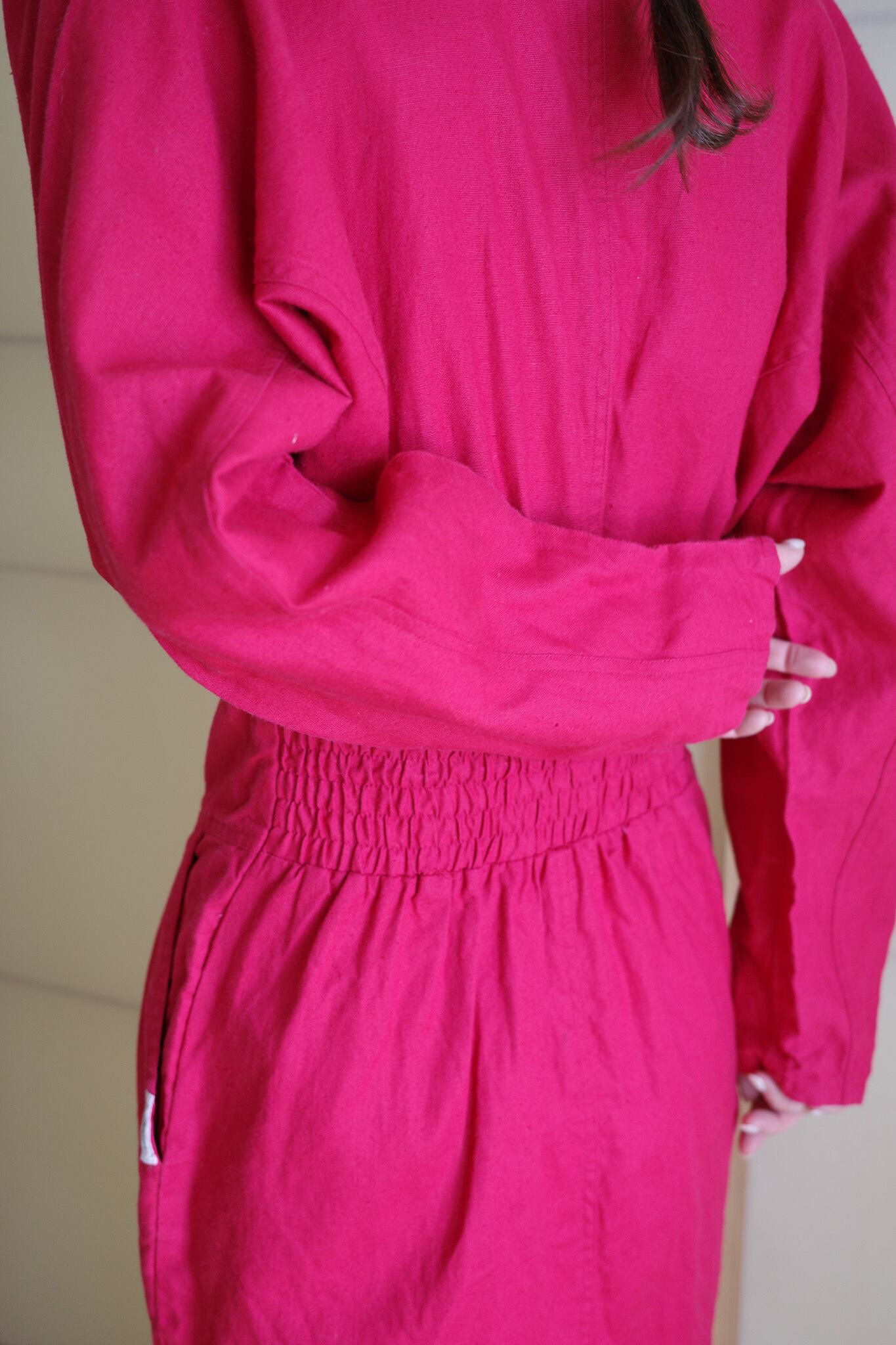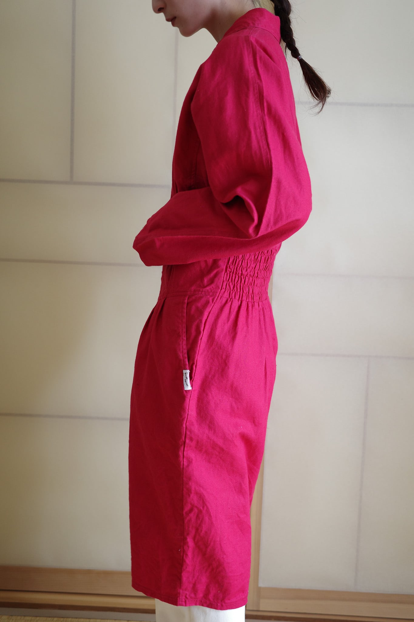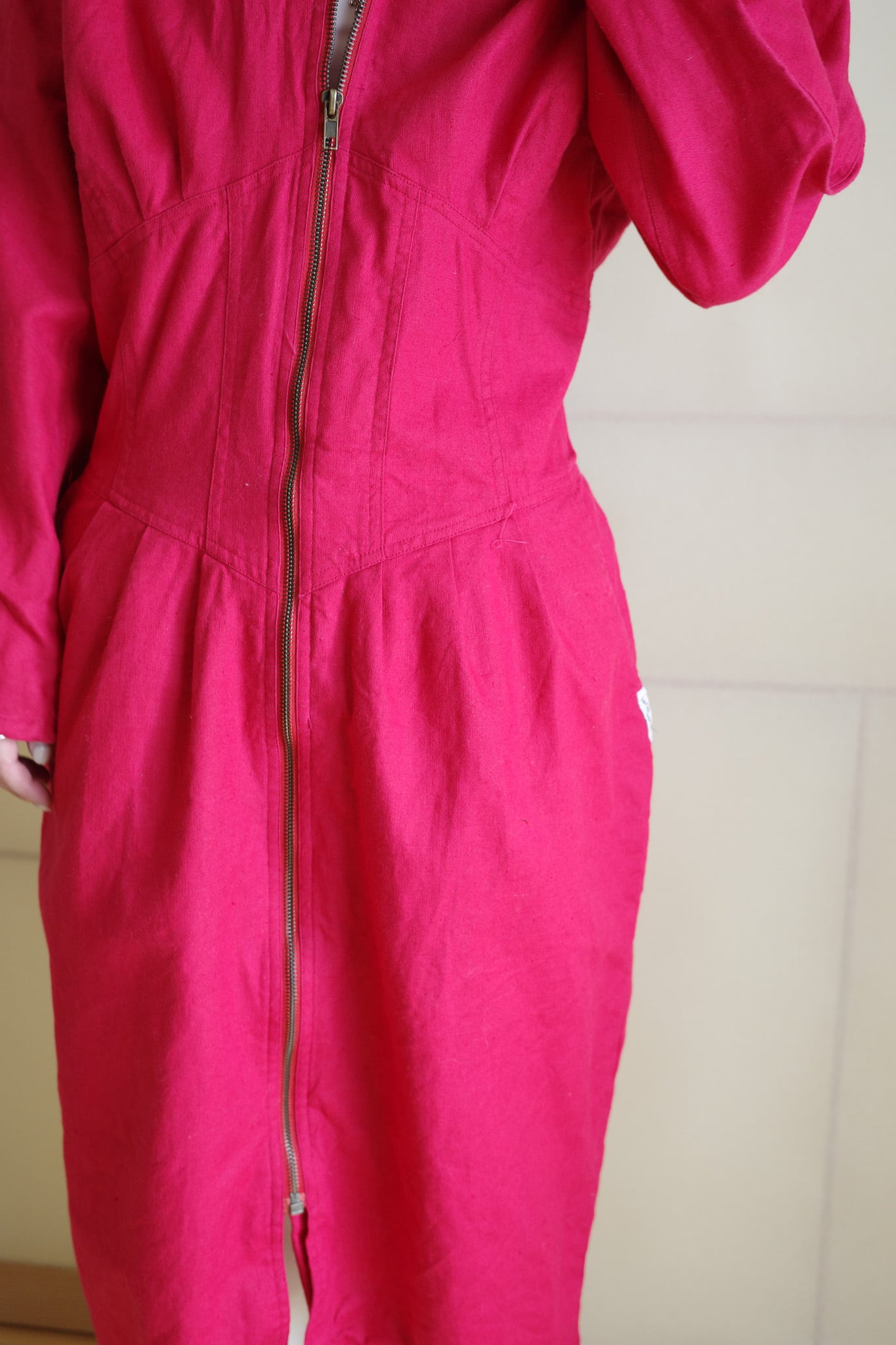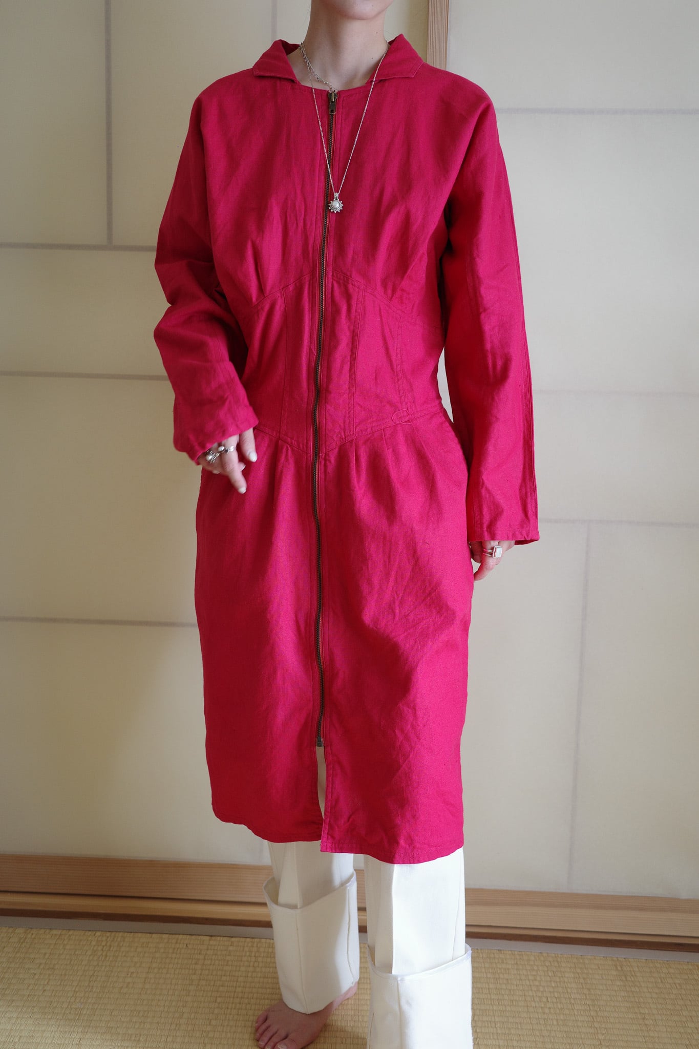 鮮やかなマゼンタ色が目を引く、フルジップアップの長袖ワンピース。
