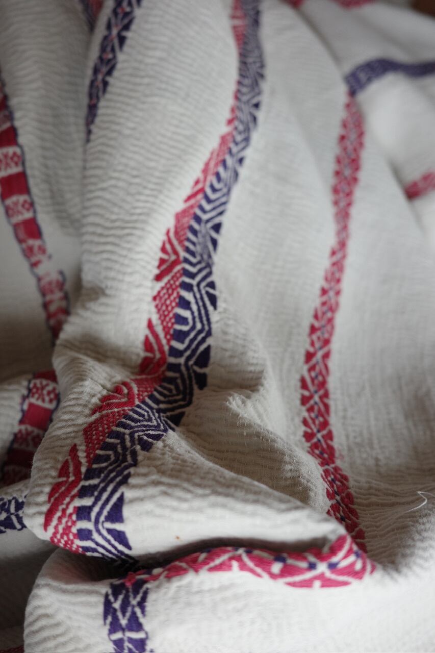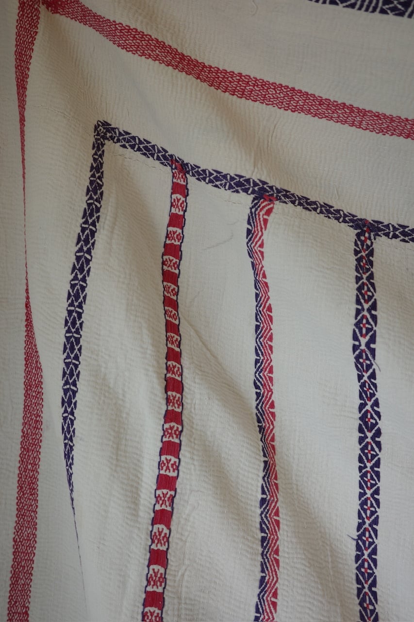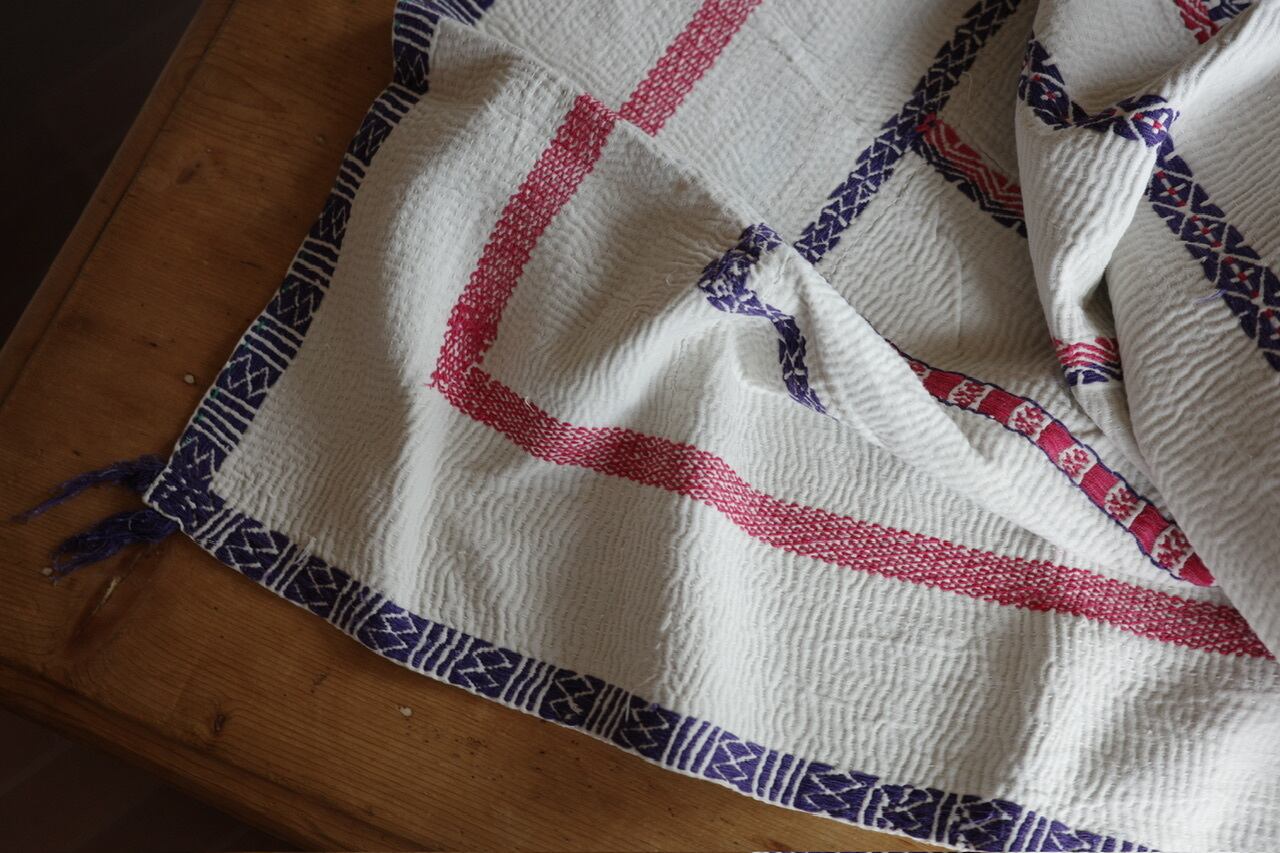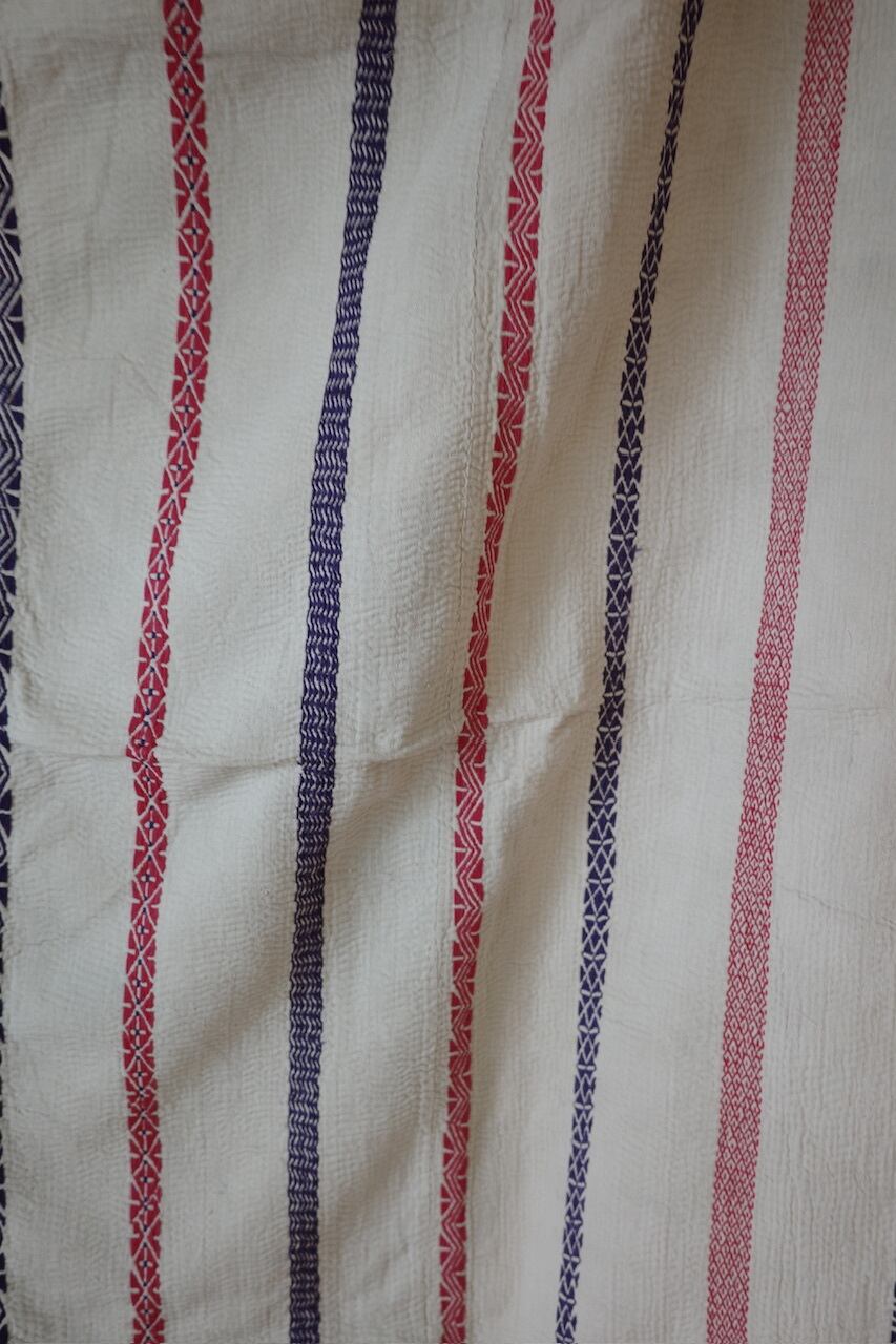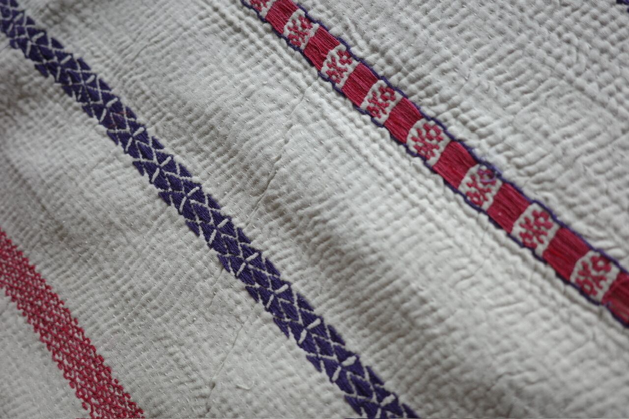 ヴィンテージ カンタキルトは、数十年前に作られたもので、布が貴重だった時代に使い古した布を集め、幾重にも重ね、さまざまなモチーフで刺し子や刺繍を施し家族のためのもの。近代ではカラフルな布に刺し子や刺繍を施したものが多く、家庭用だけではなく商業用に製作された物も多く見られます。
