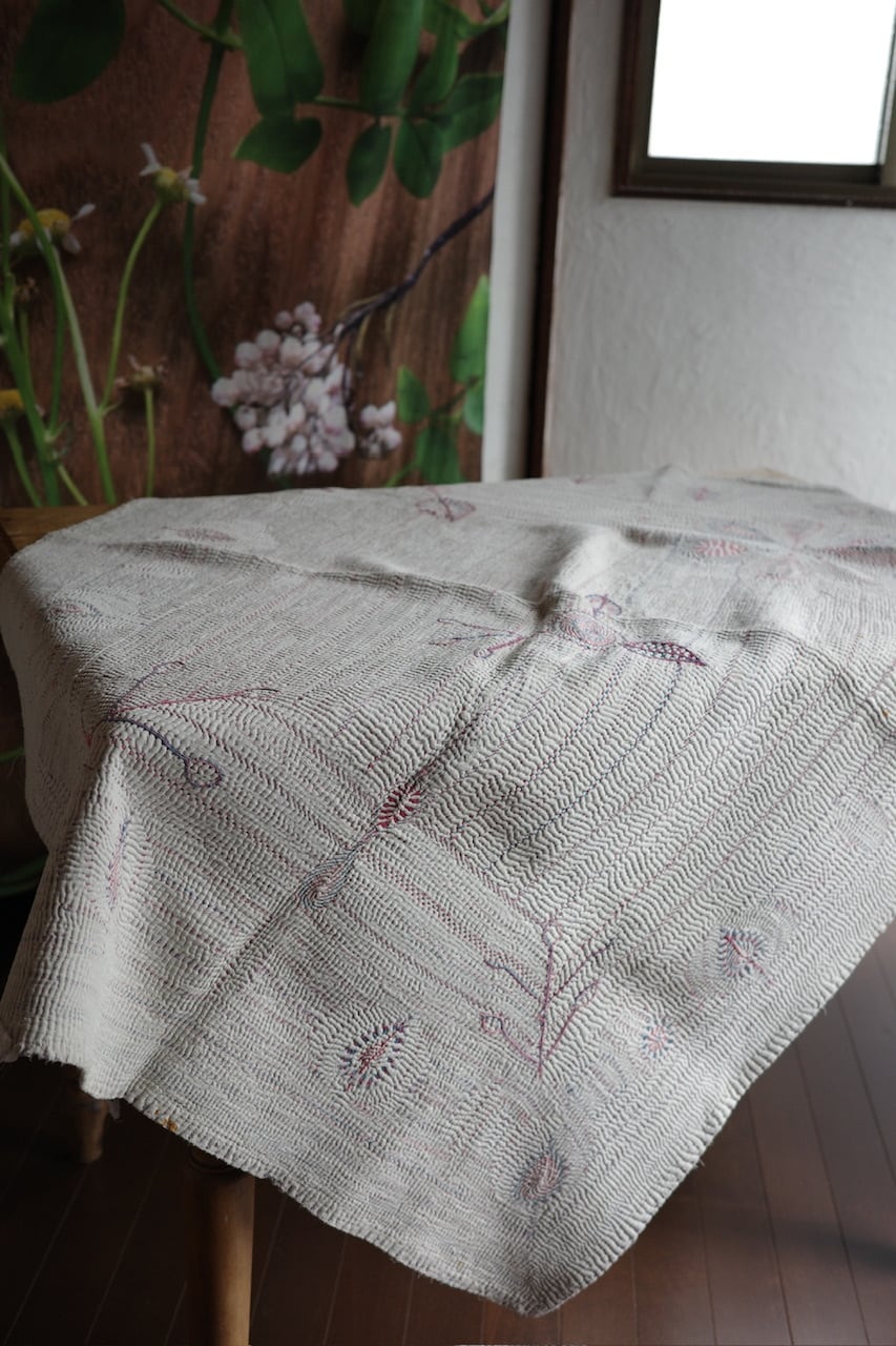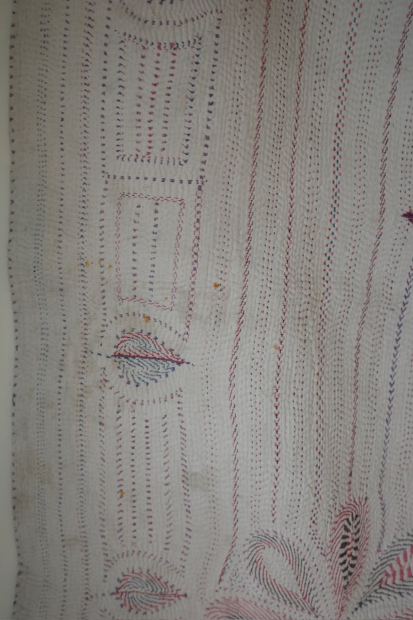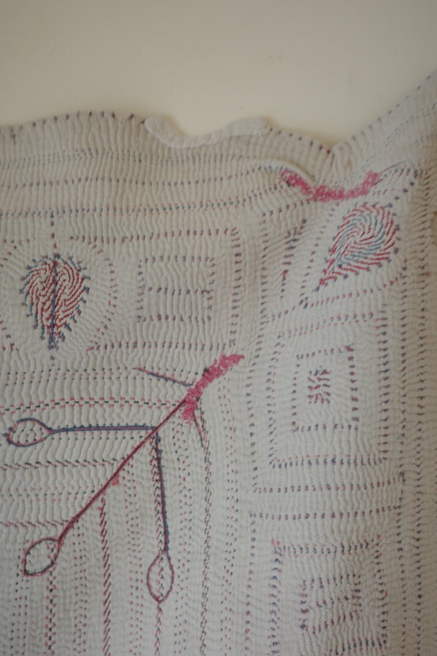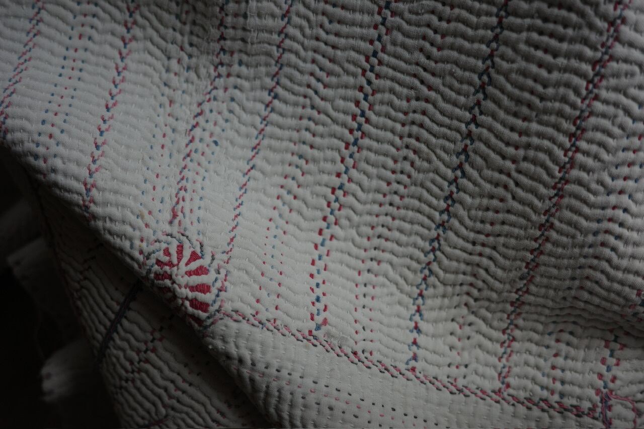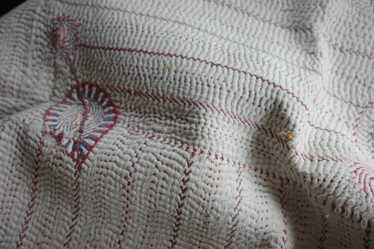 ヴィンテージ カンタキルトは、数十年前に作られたもので、布が貴重だった時代に使い古した布を集め、幾重にも重ね、さまざまなモチーフで刺し子や刺繍を施し家族のためのもの。近代ではカラフルな布に刺し子や刺繍を施したものが多く、家庭用だけではなく商業用に製作された物も多く見られます。