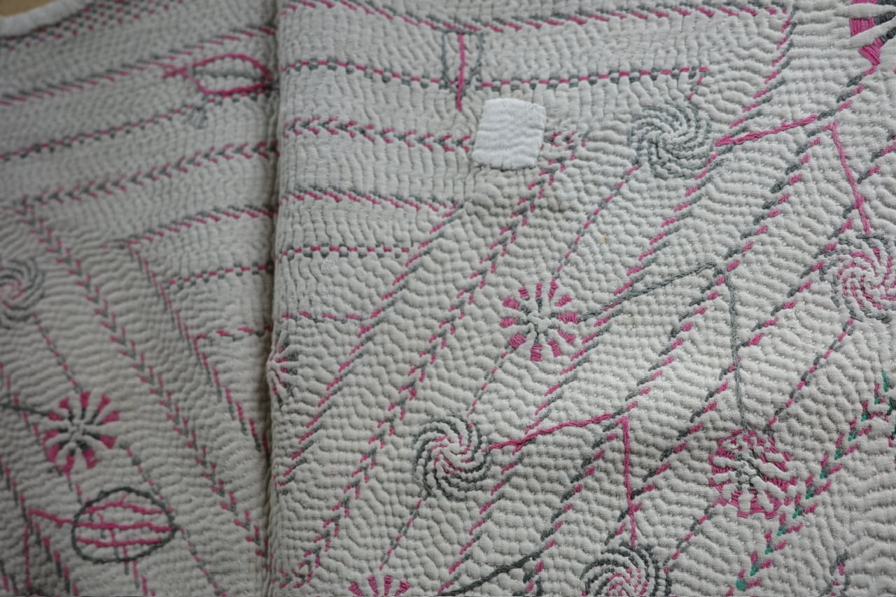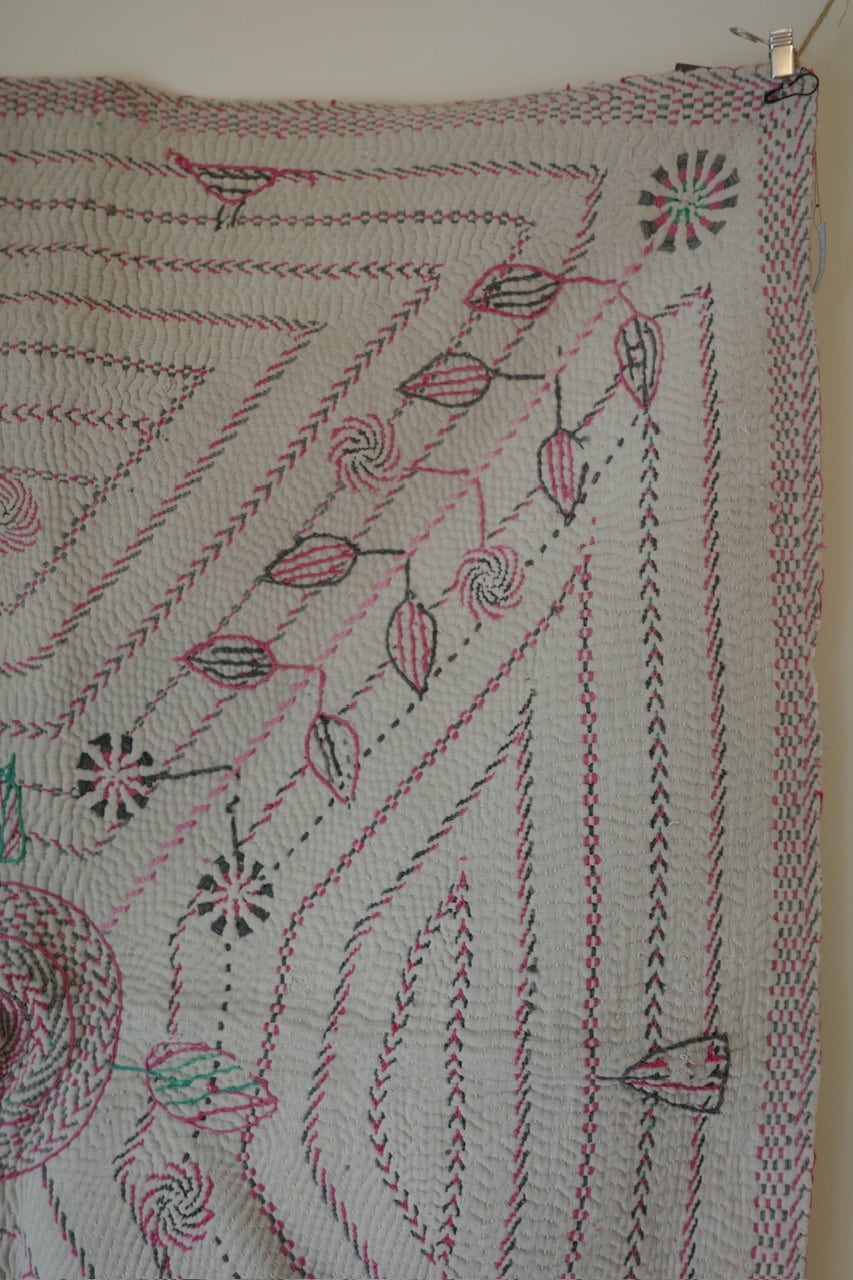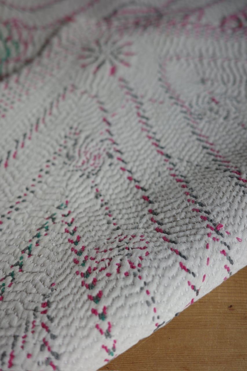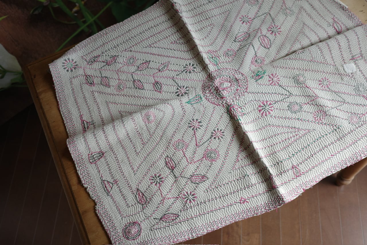 ヴィンテージ カンタキルトは、数十年前に作られたもので、布が貴重だった時代に使い古した布を集め、幾重にも重ね、さまざまなモチーフで刺し子や刺繍を施し家族のためのもの。近代ではカラフルな布に刺し子や刺繍を施したものが多く、家庭用だけではなく商業用に製作された物も多く見られます。