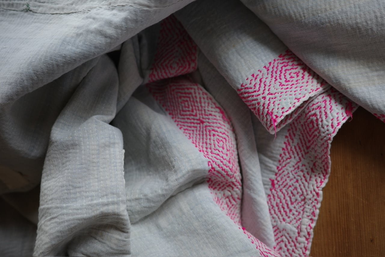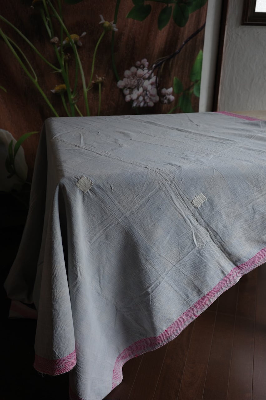 ヴィンテージ カンタキルトは、数十年前に作られたもので、布が貴重だった時代に使い古した布を集め、幾重にも重ね、さまざまなモチーフで刺し子や刺繍を施し家族のためのもの。近代ではカラフルな布に刺し子や刺繍を施したものが多く、家庭用だけではなく商業用に製作された物も多く見られます。