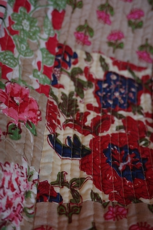 様々なお花の柄のテキスタイルのパッチワークに裏面はストライプのテキスタイル。