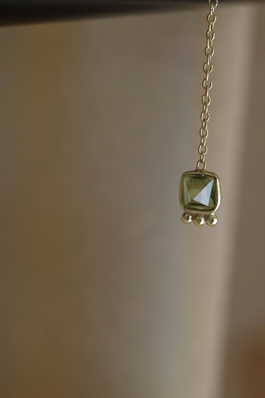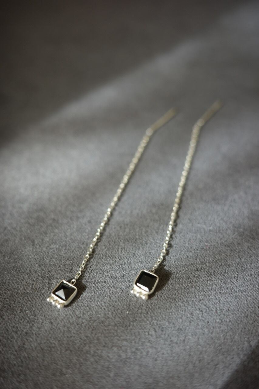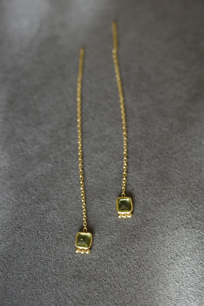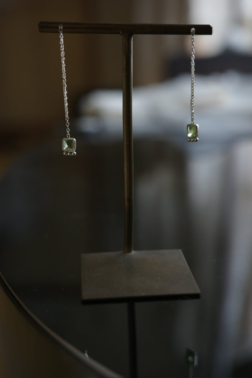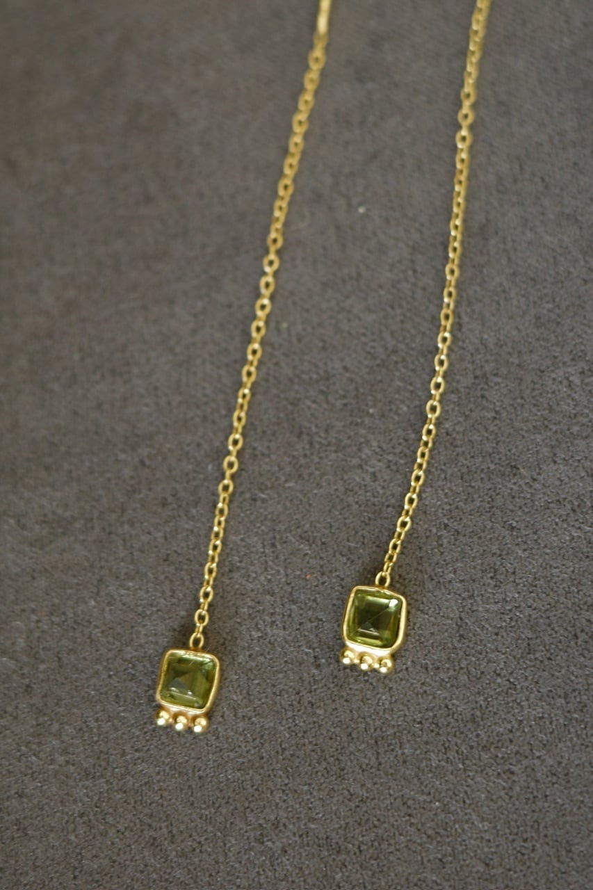 繊細なシルバーチェーンに、透明感のあるグリーンストーンをあしらったピアス。