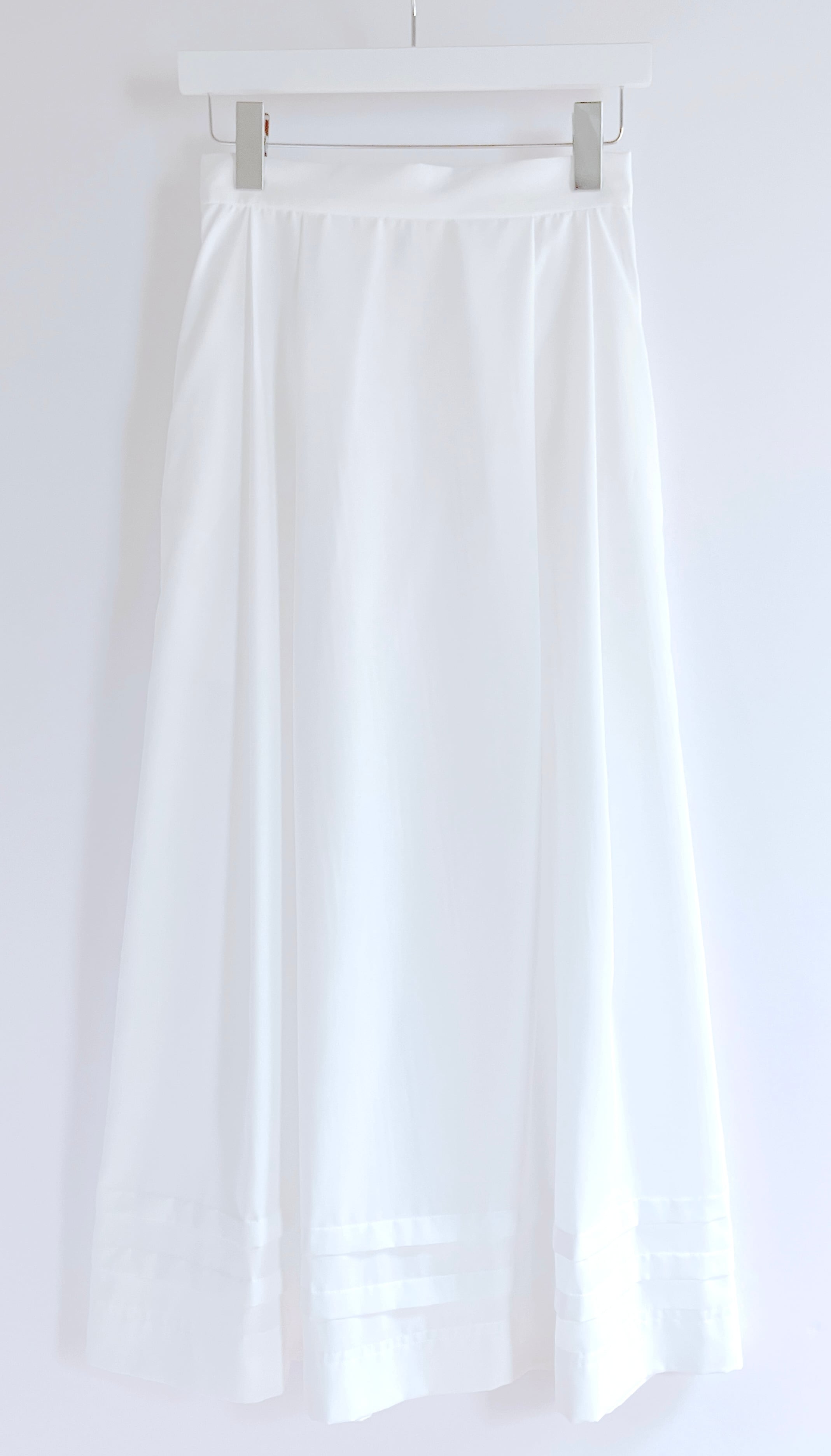 Aラインのワイドタックスカート。なめらかな生地でシワになりにくく、つるんとした見え感。