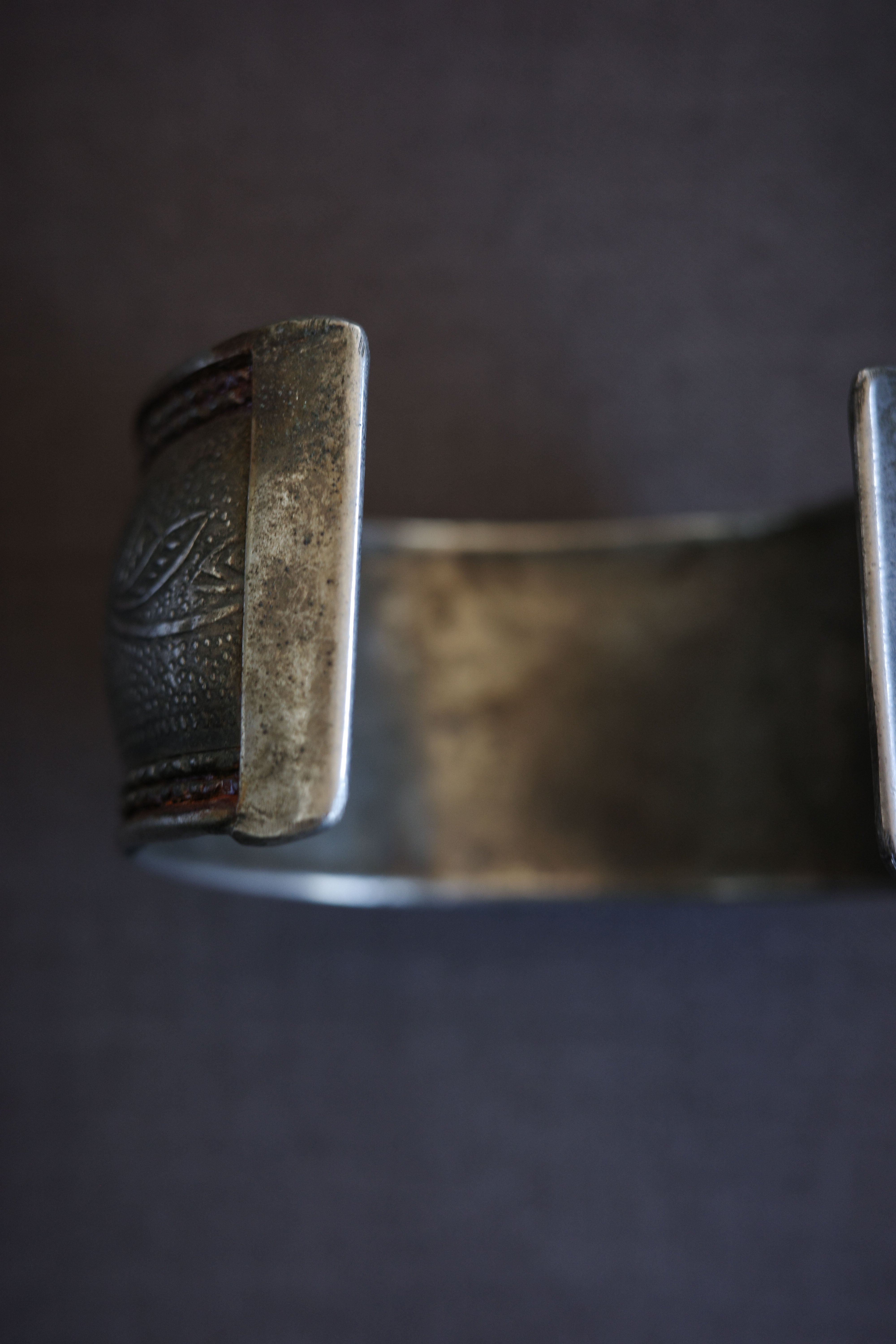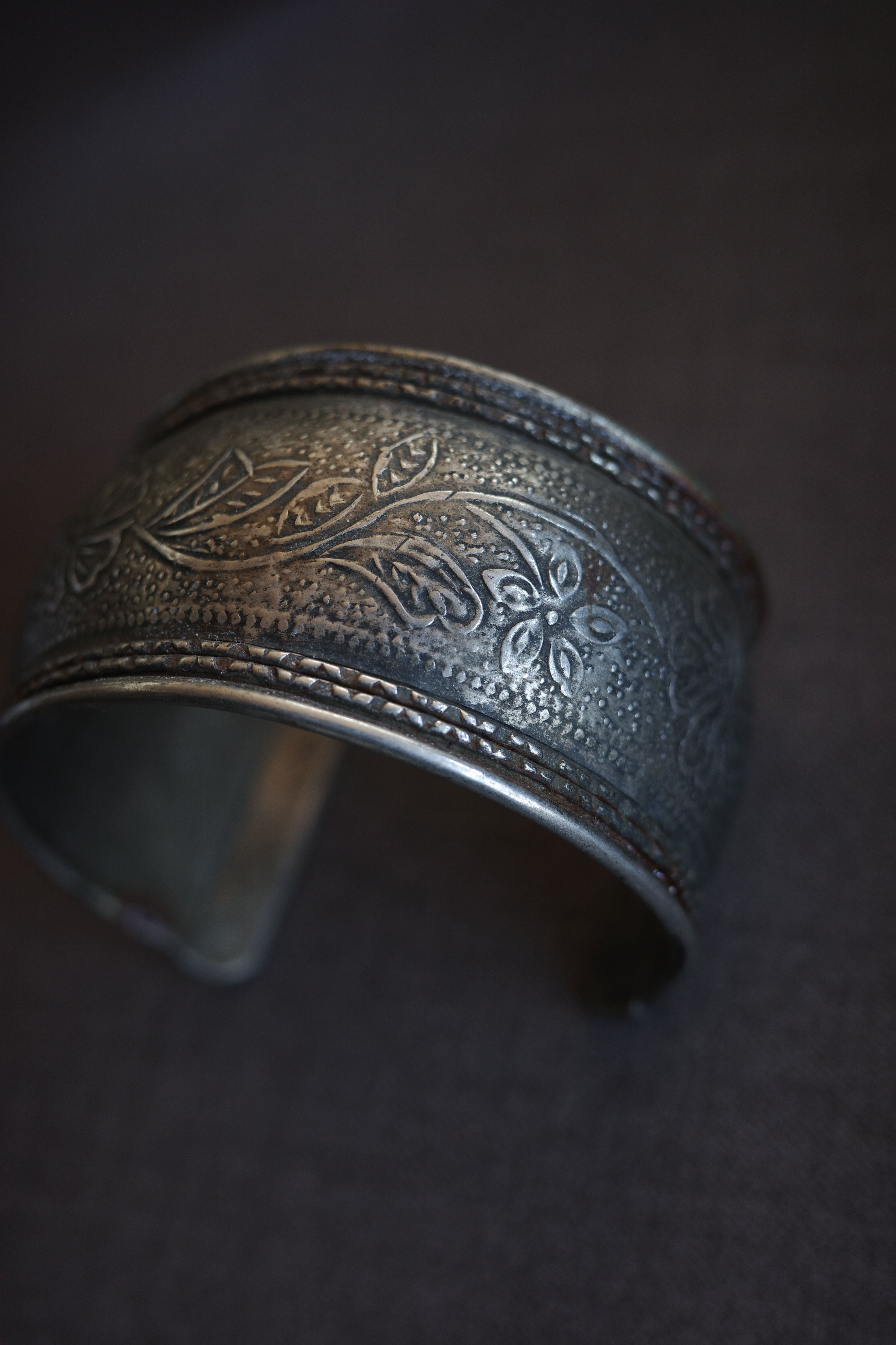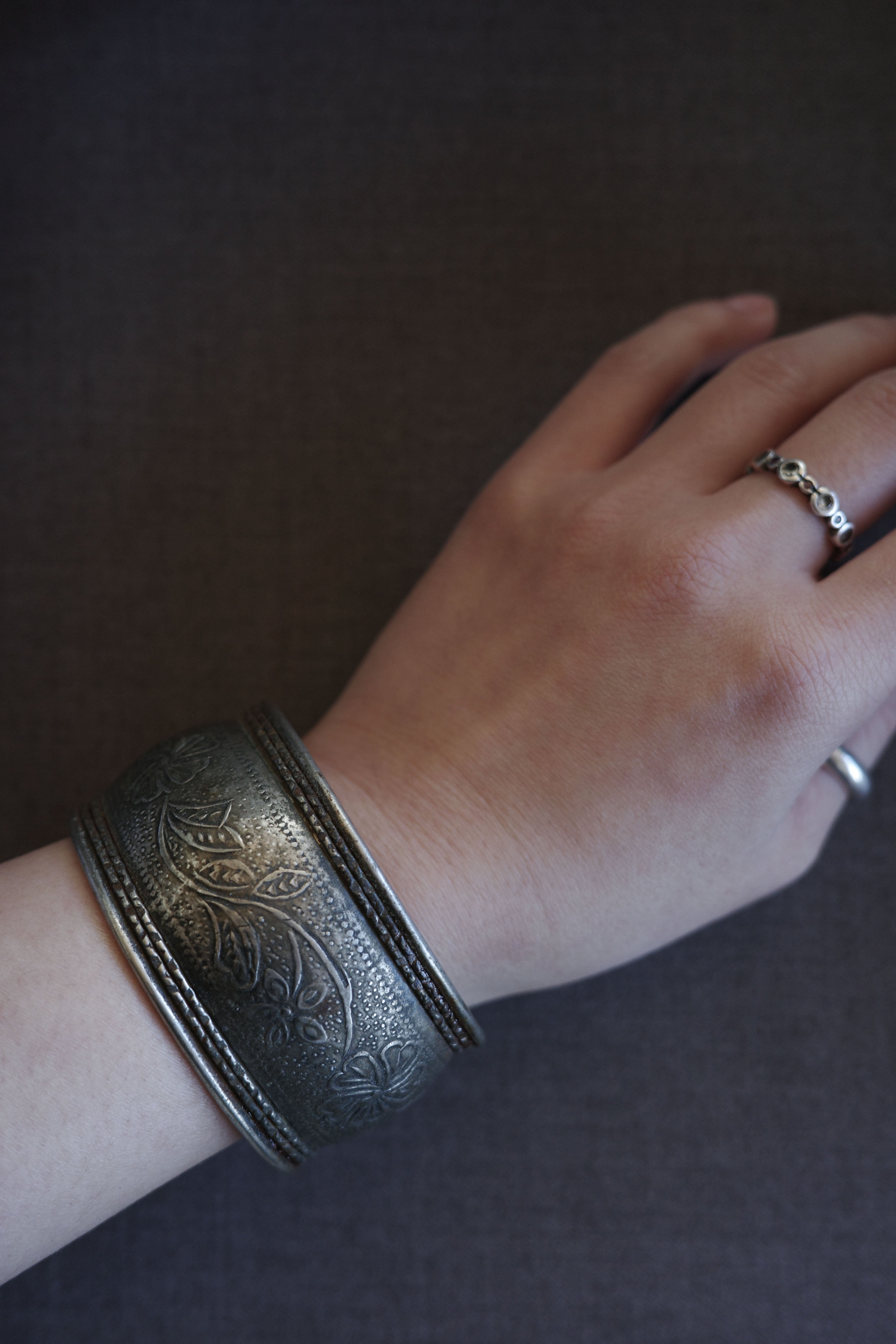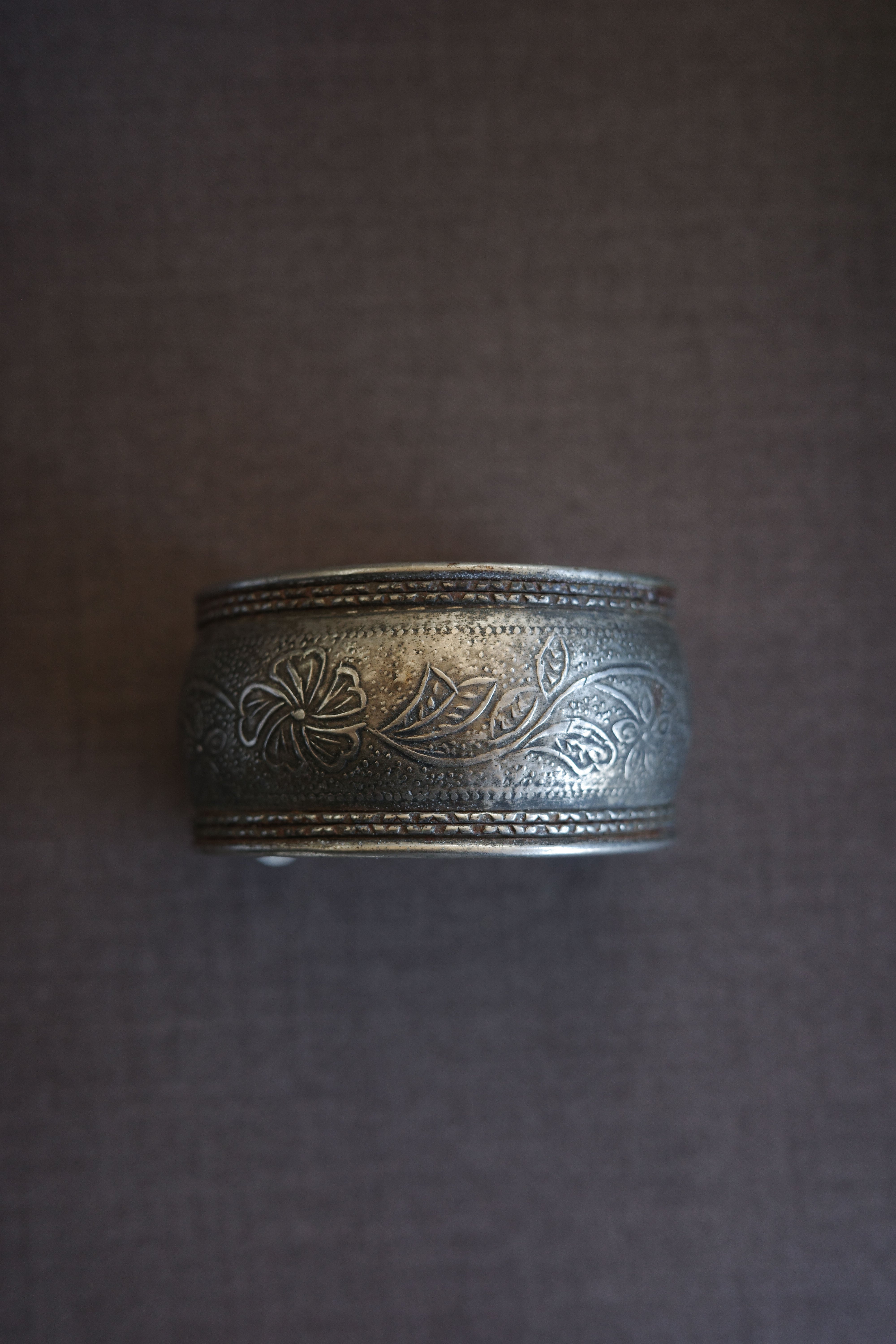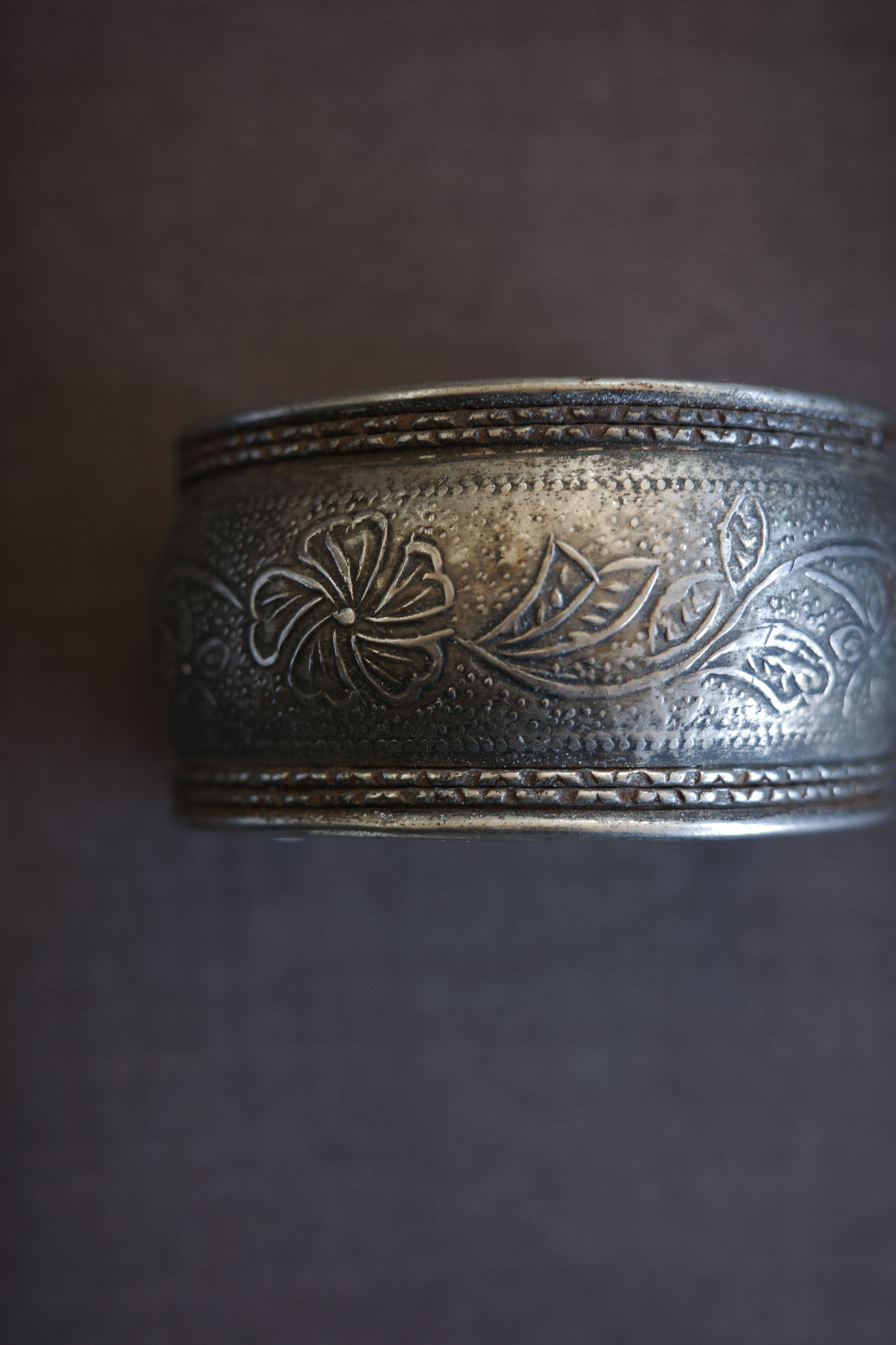 素朴な槌目模様の上に、花や葉をモチーフにした繊細な彫刻がほどこされ、時間を経た銀特有のくすみが、より一層深い表情を添えています。