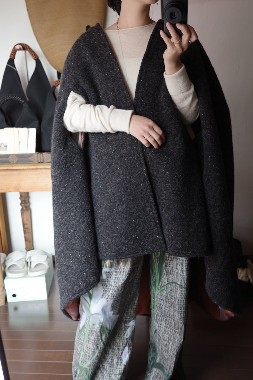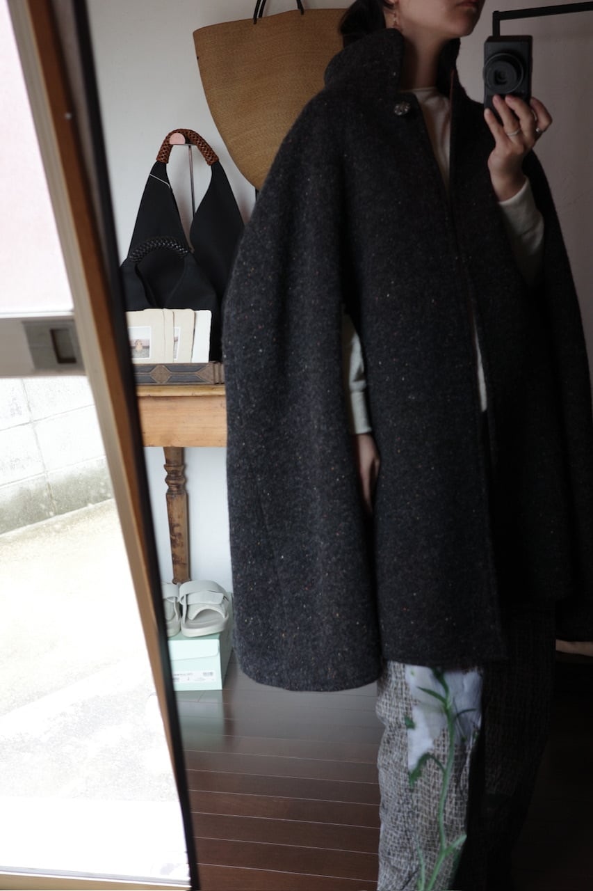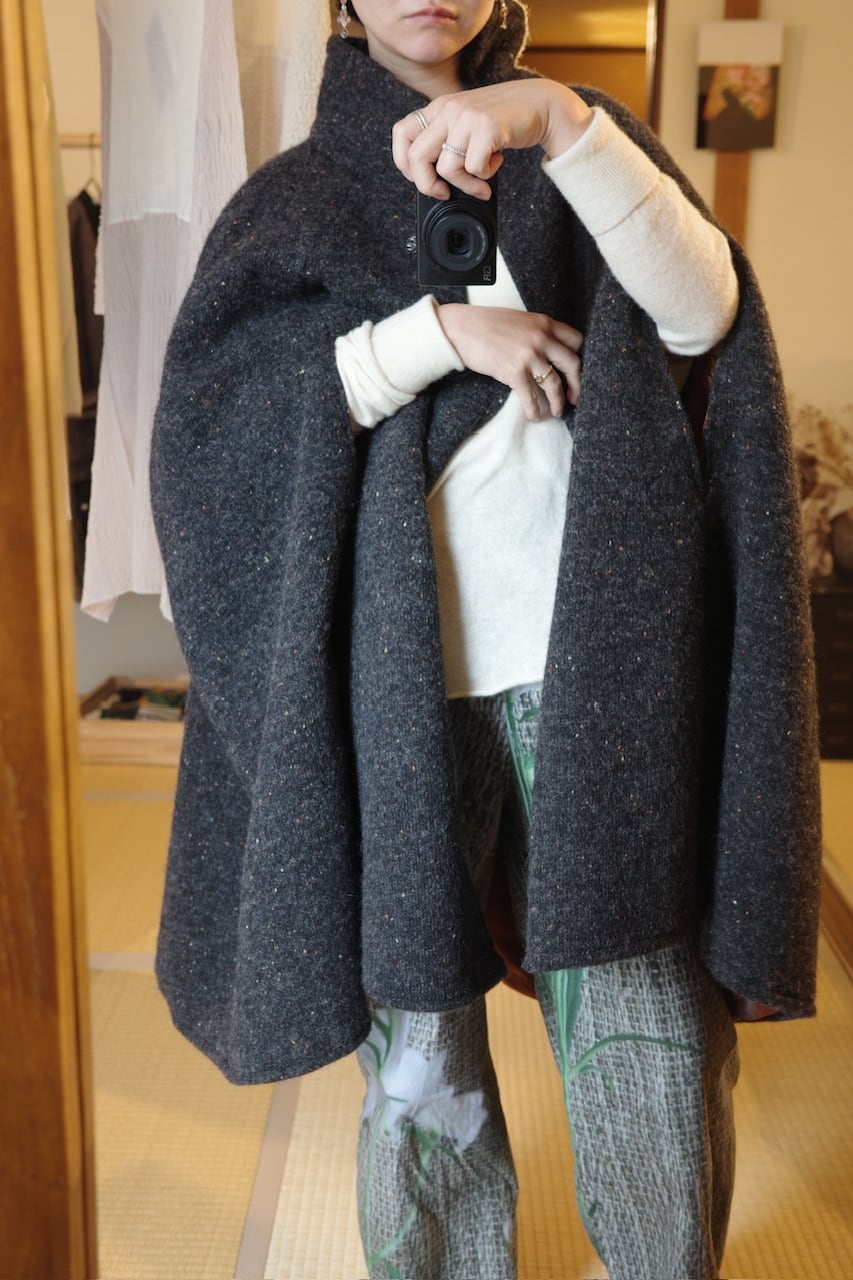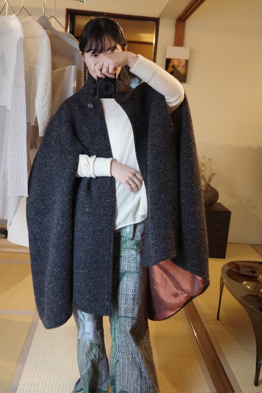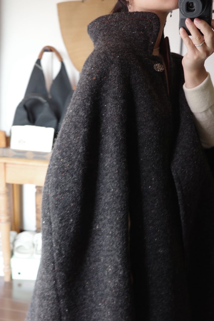 チャコールグレーのネップウールで仕立てたたっぷりシルエットのケープコート。