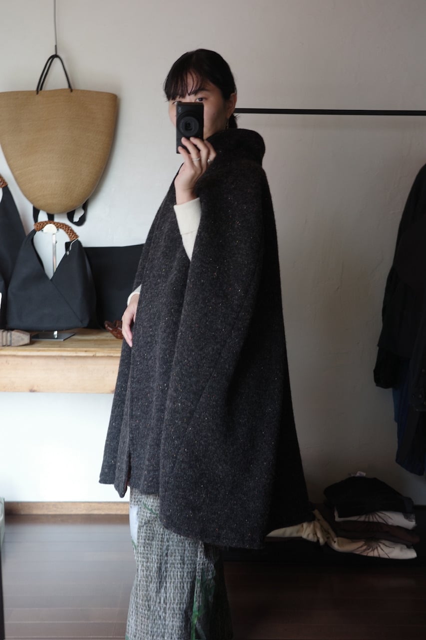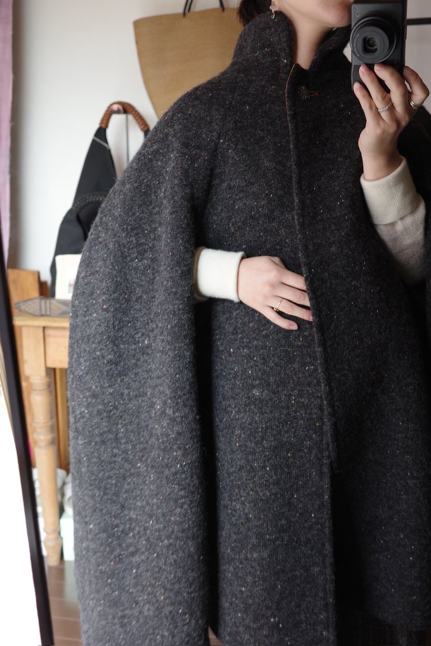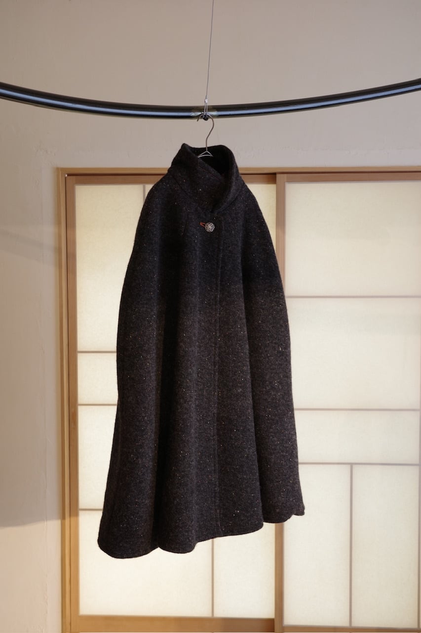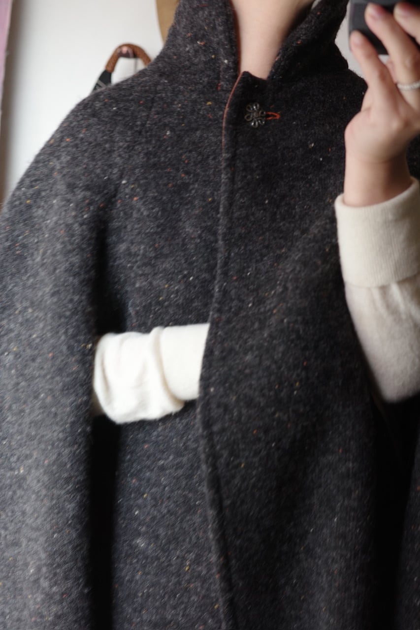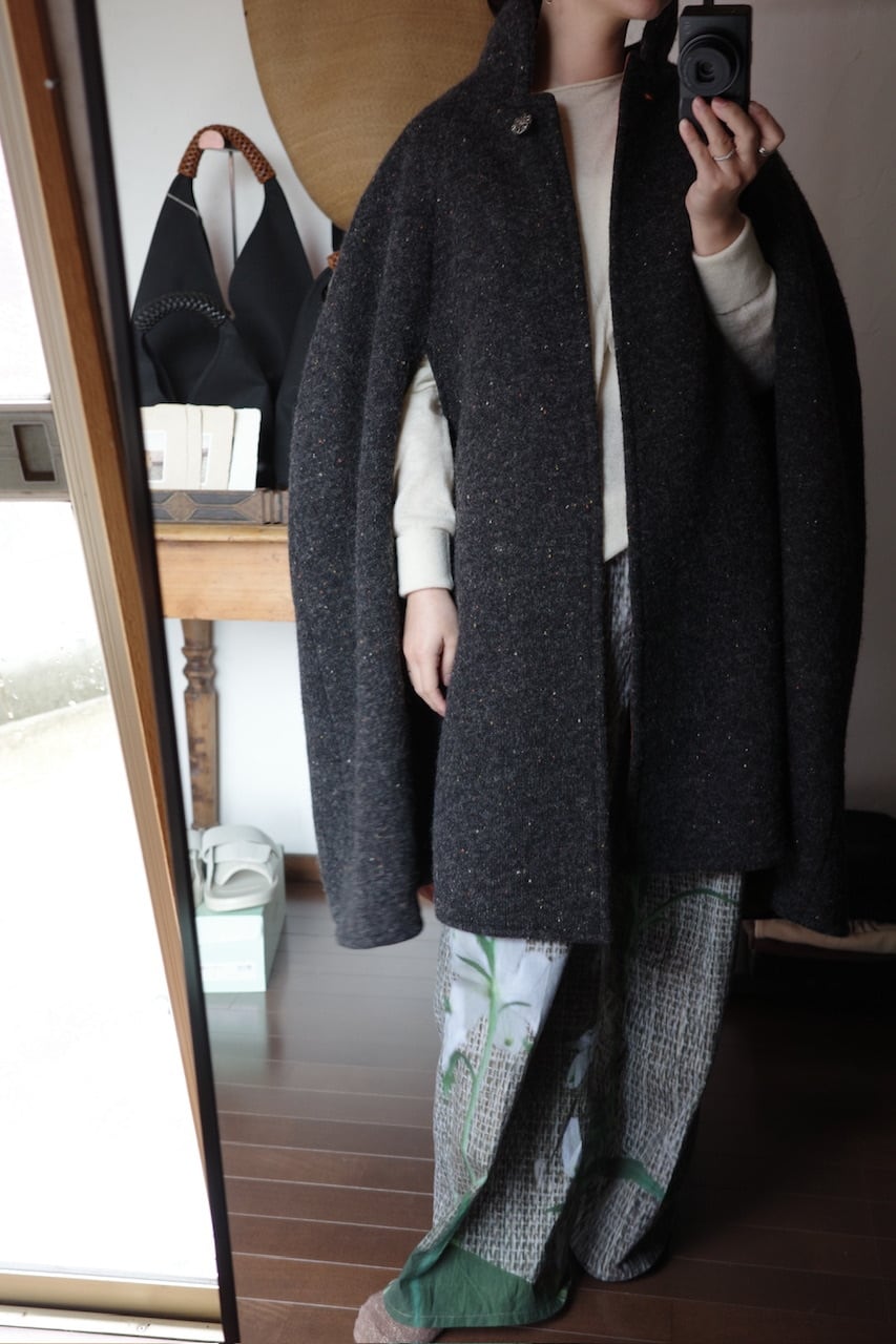 チャコールグレーのネップウールで仕立てたたっぷりシルエットのケープコート。