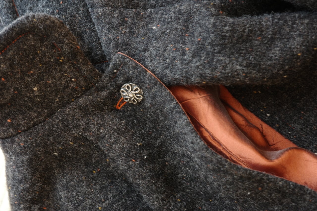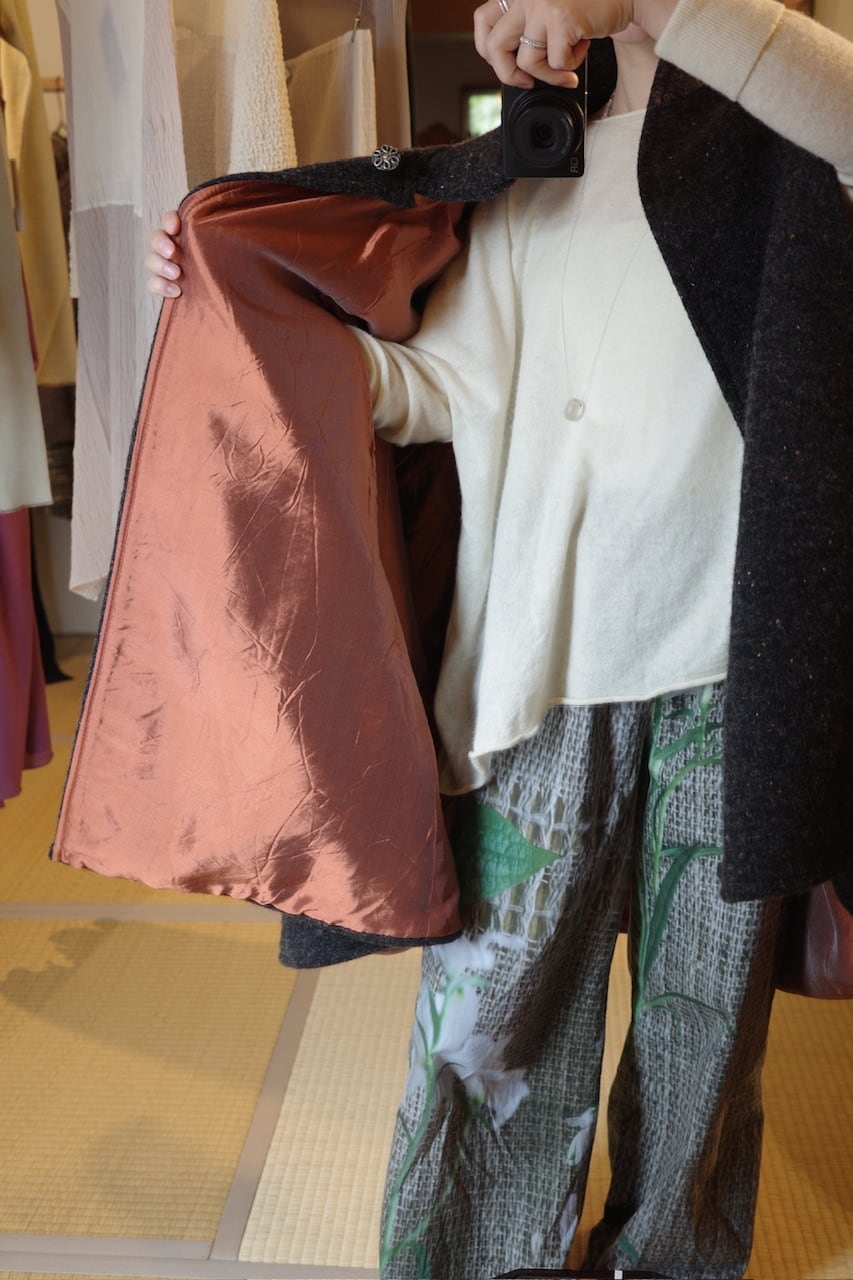 首元の小さなメタルボタンと、歩くたびにのぞく錆びた銅色の裏地がさりげないポイントです。