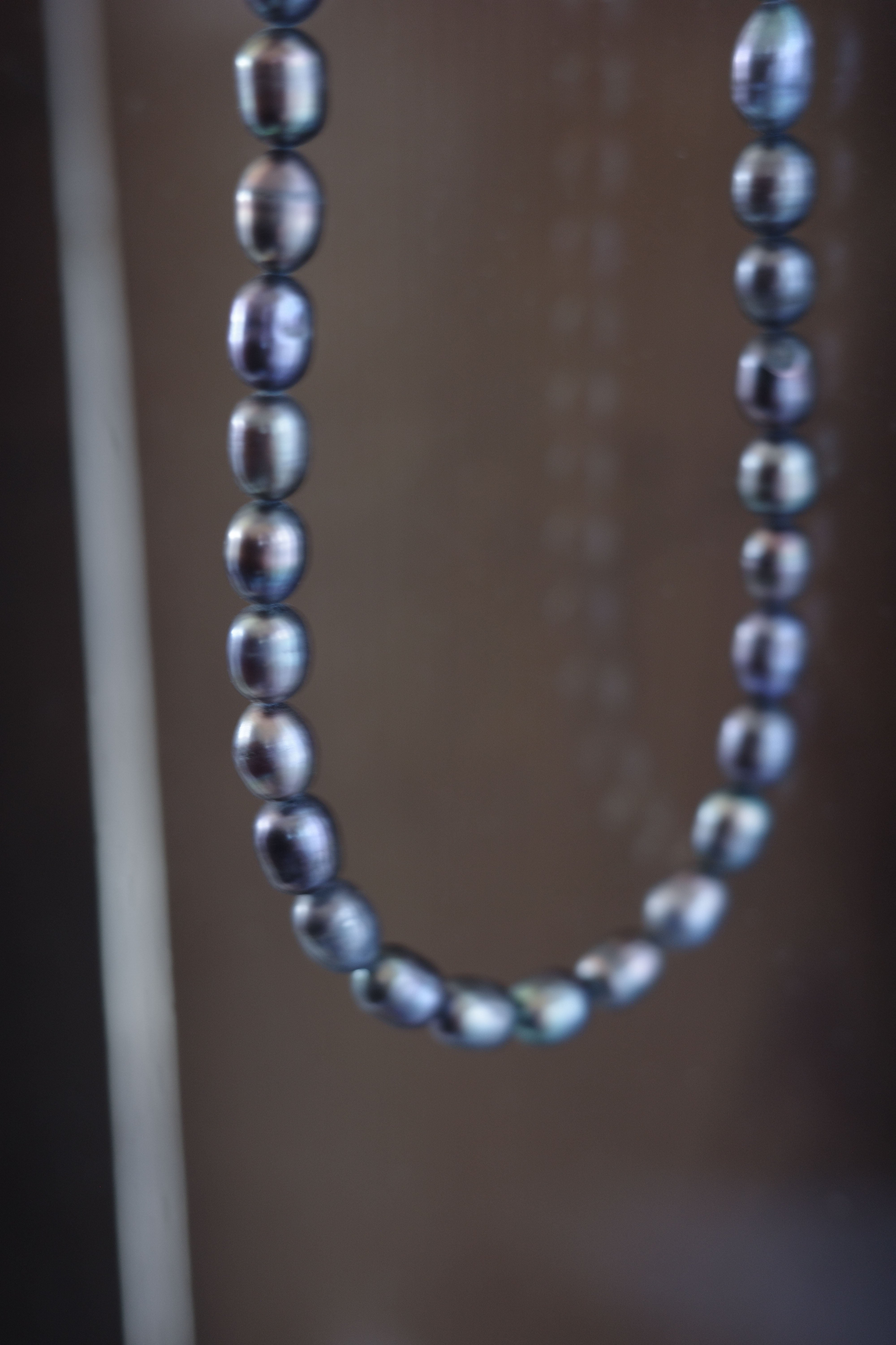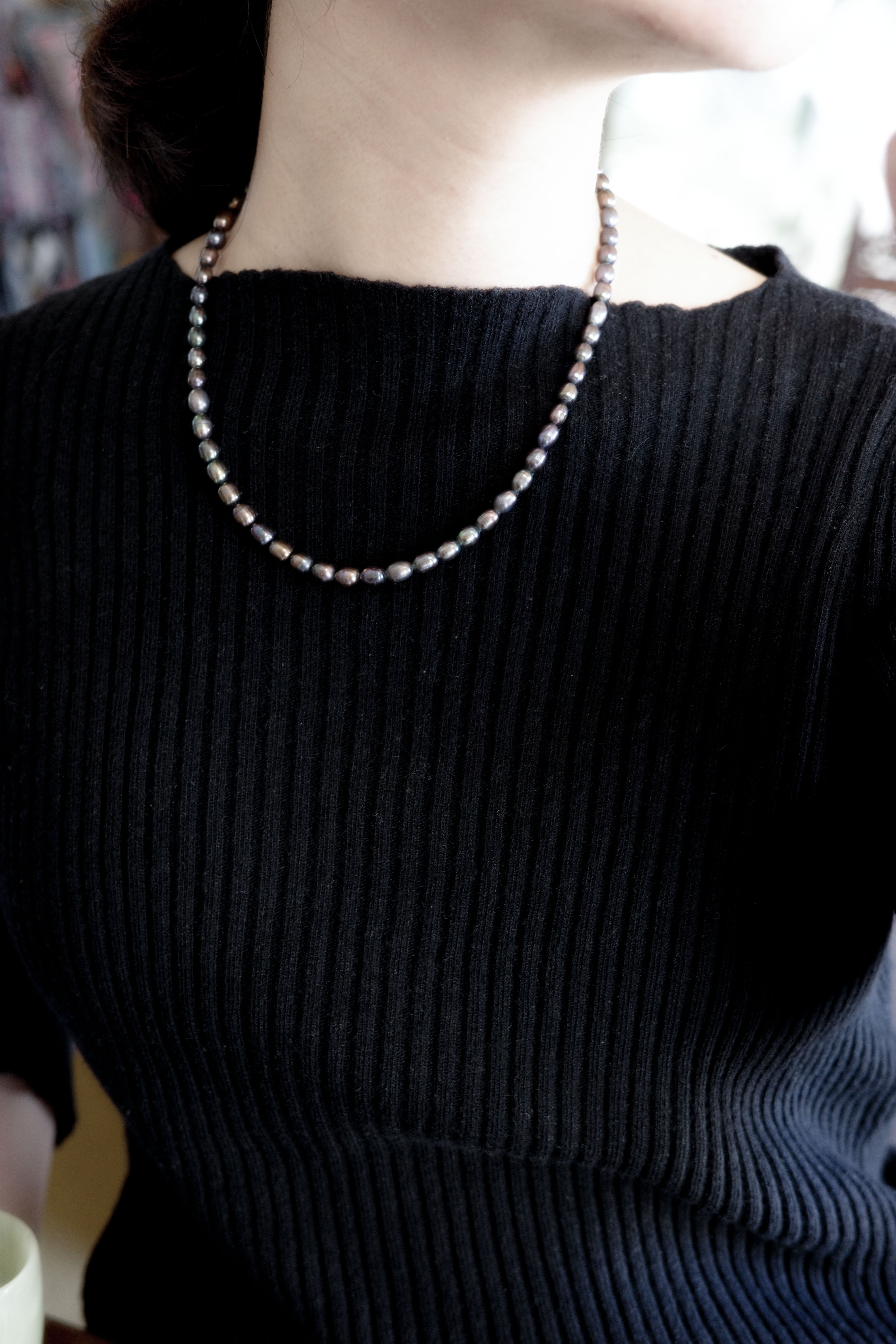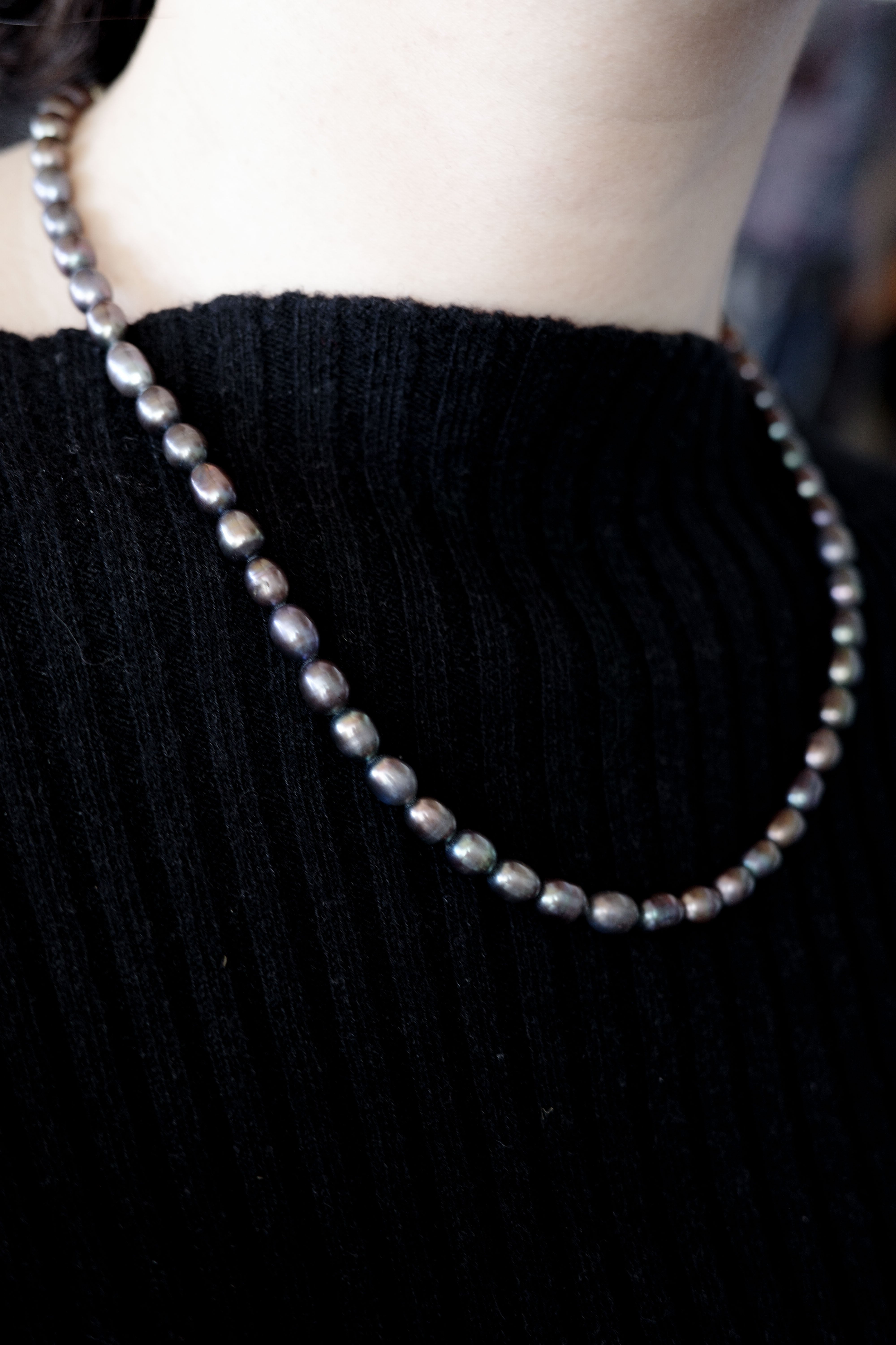 深い湖面のような光沢をまとう、ブラックカラーの淡水パールネックレス。