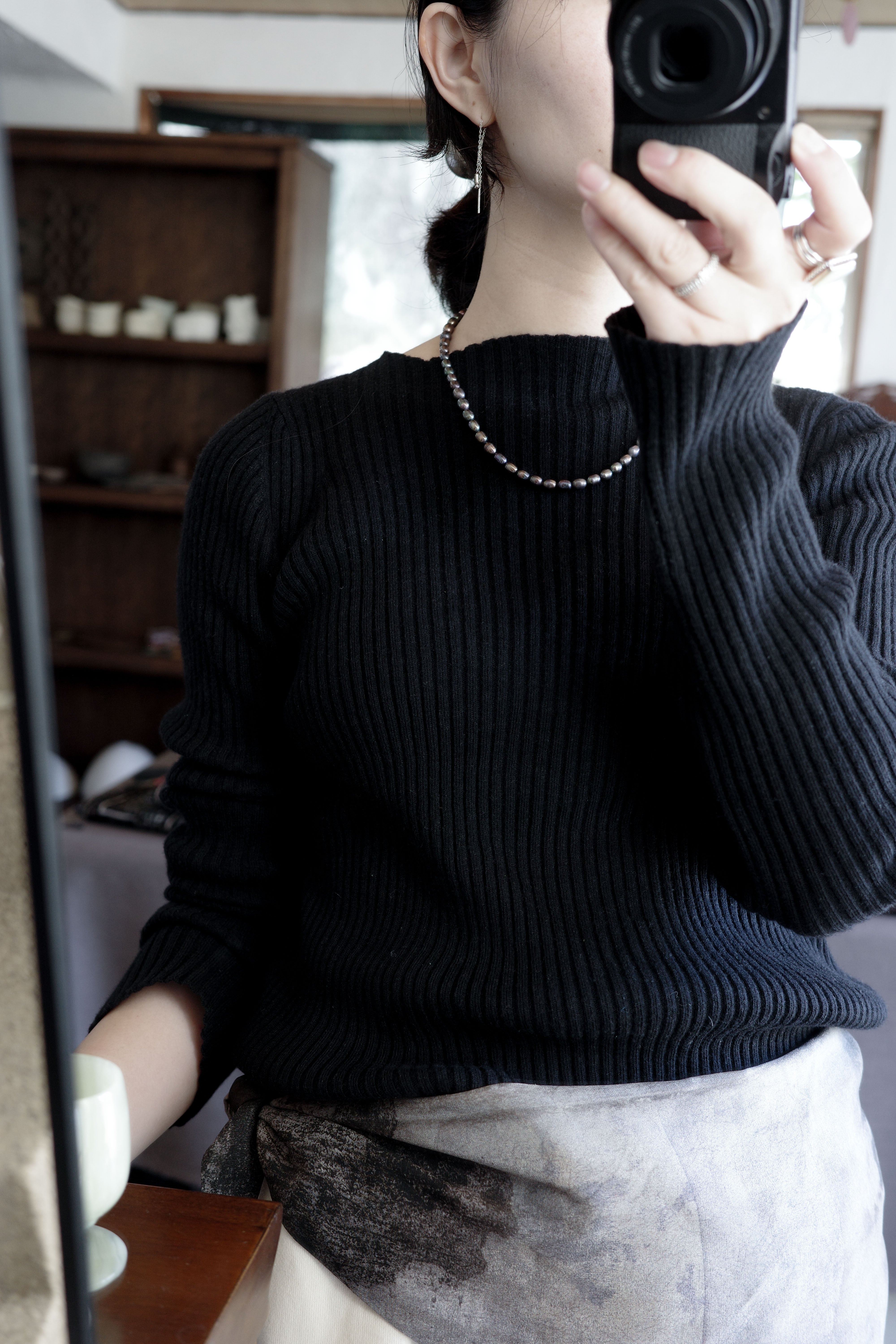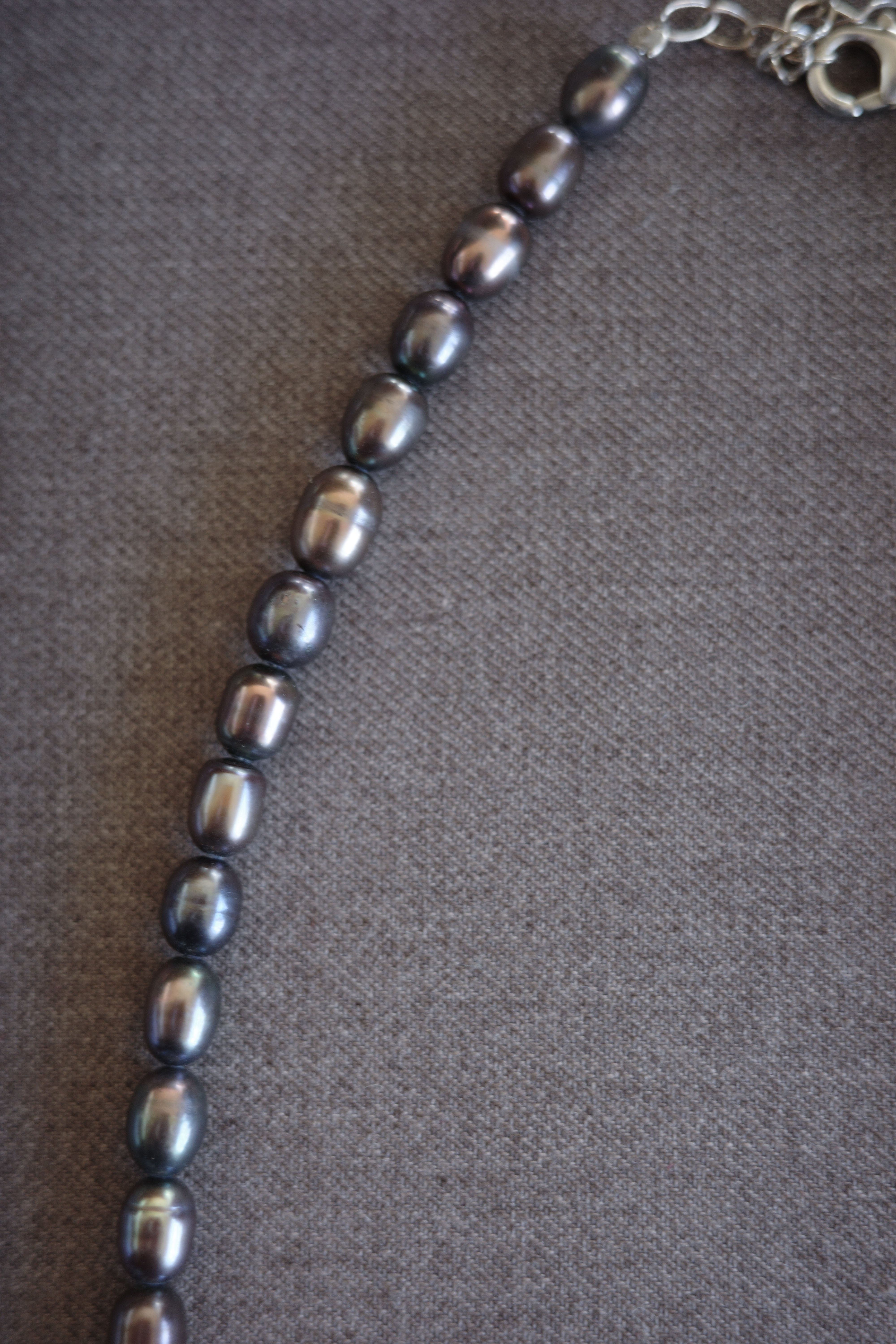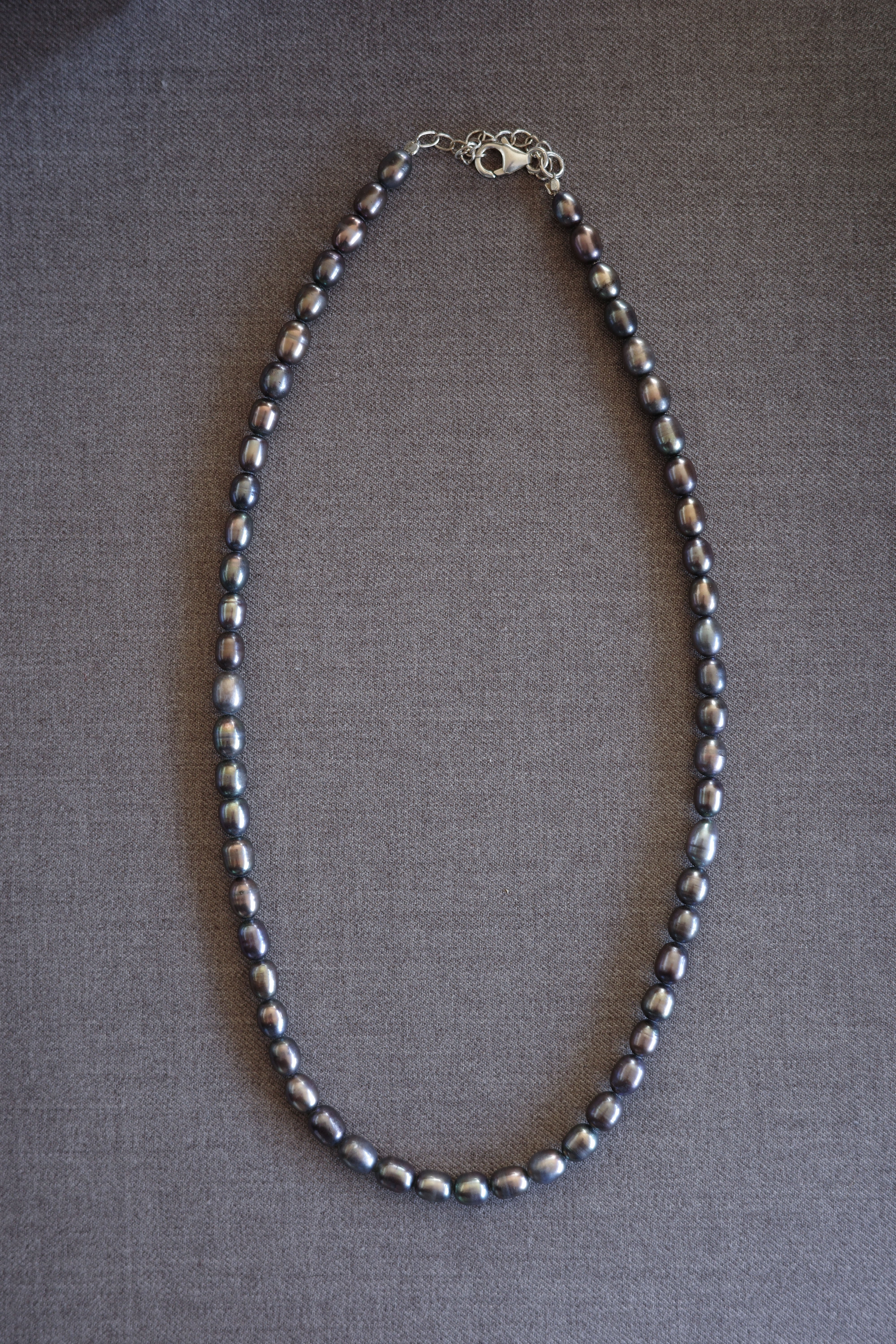 深い湖面のような光沢をまとう、ブラックカラーの淡水パールネックレス。
