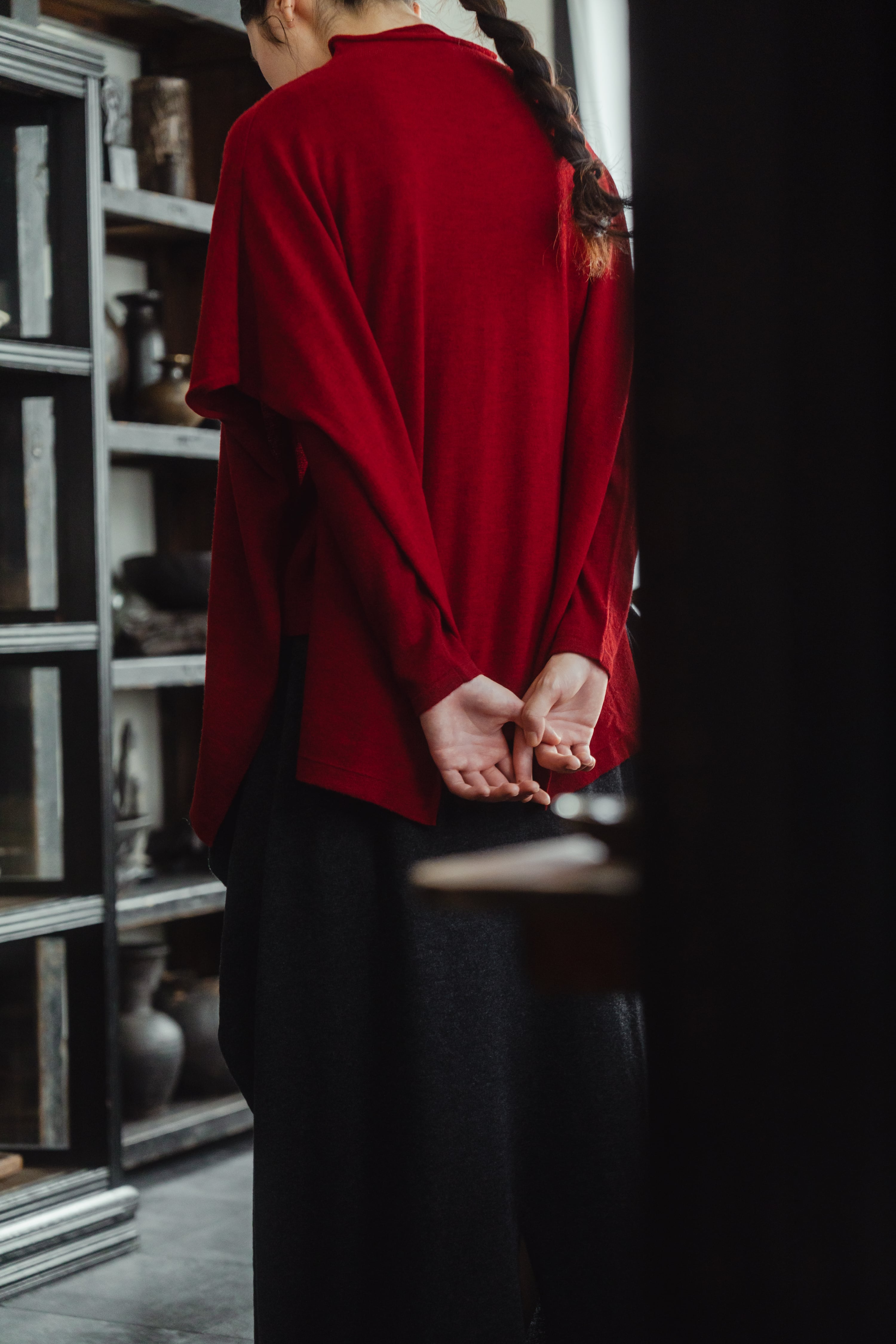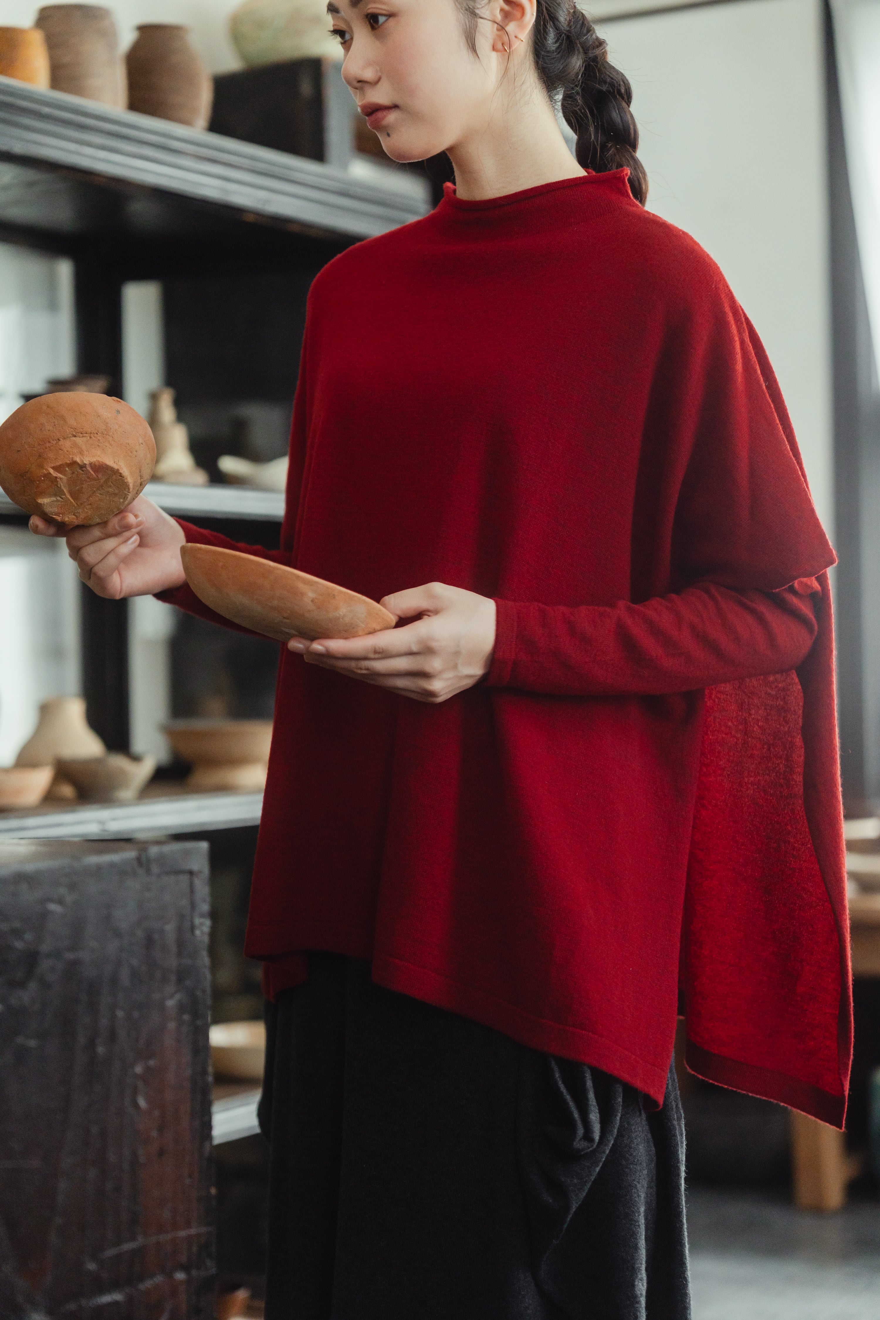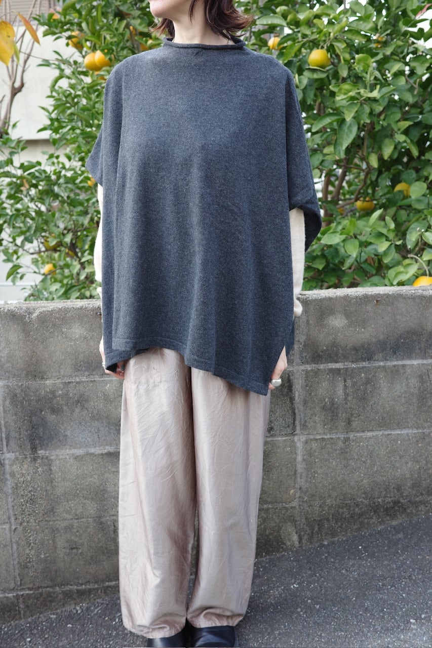 肩にそっと落ちる布のように、静かな存在感をもたらすニットのケープマント。