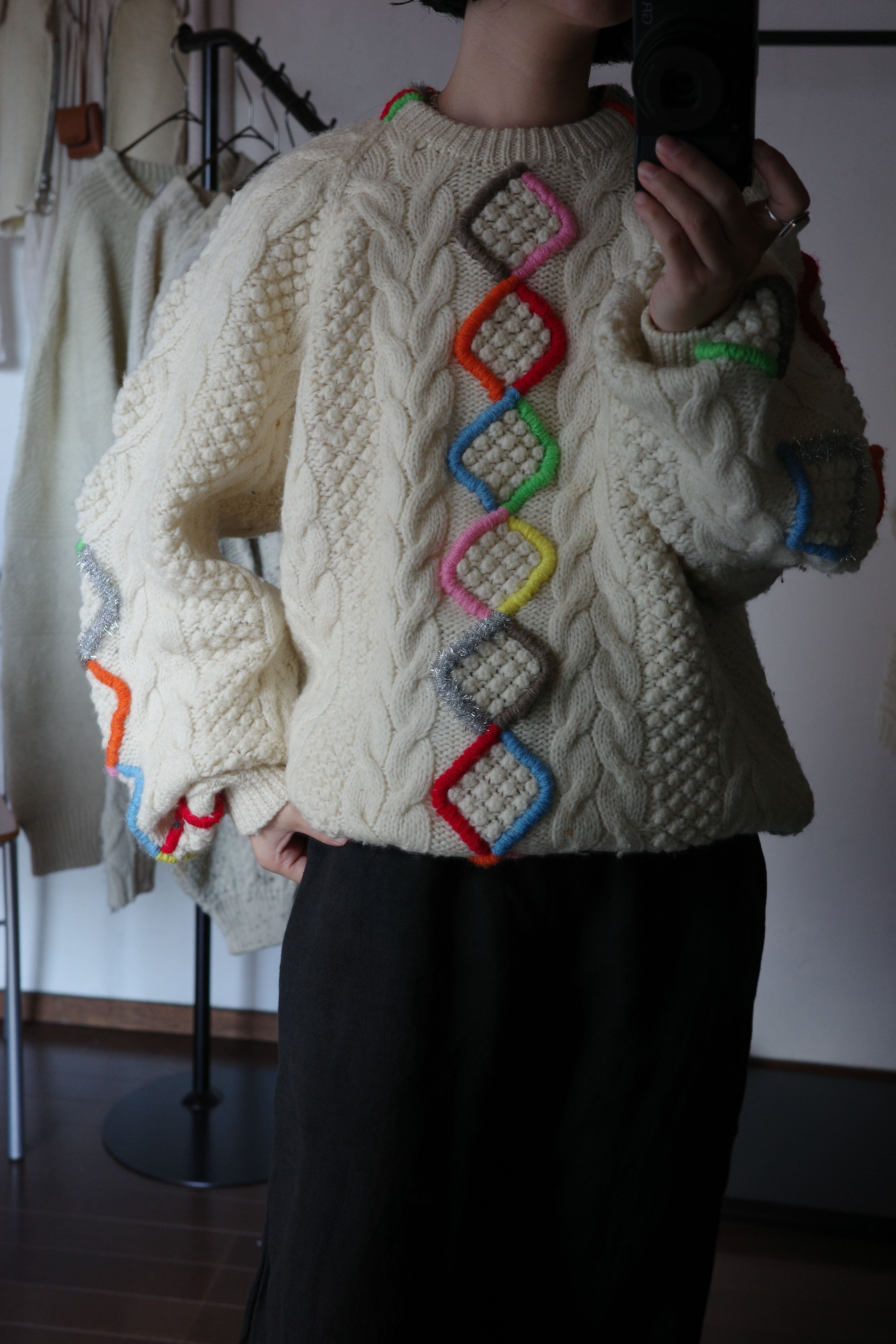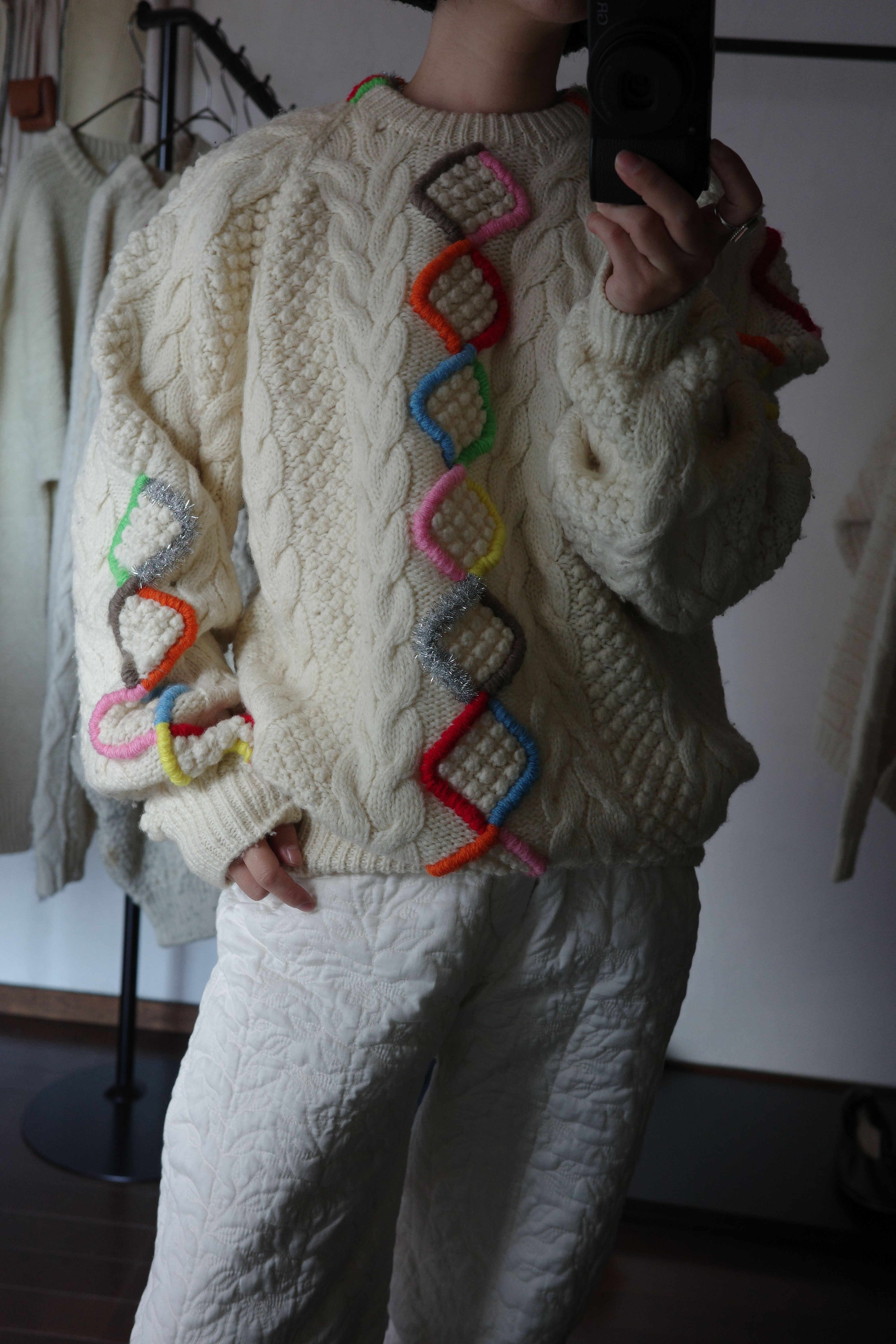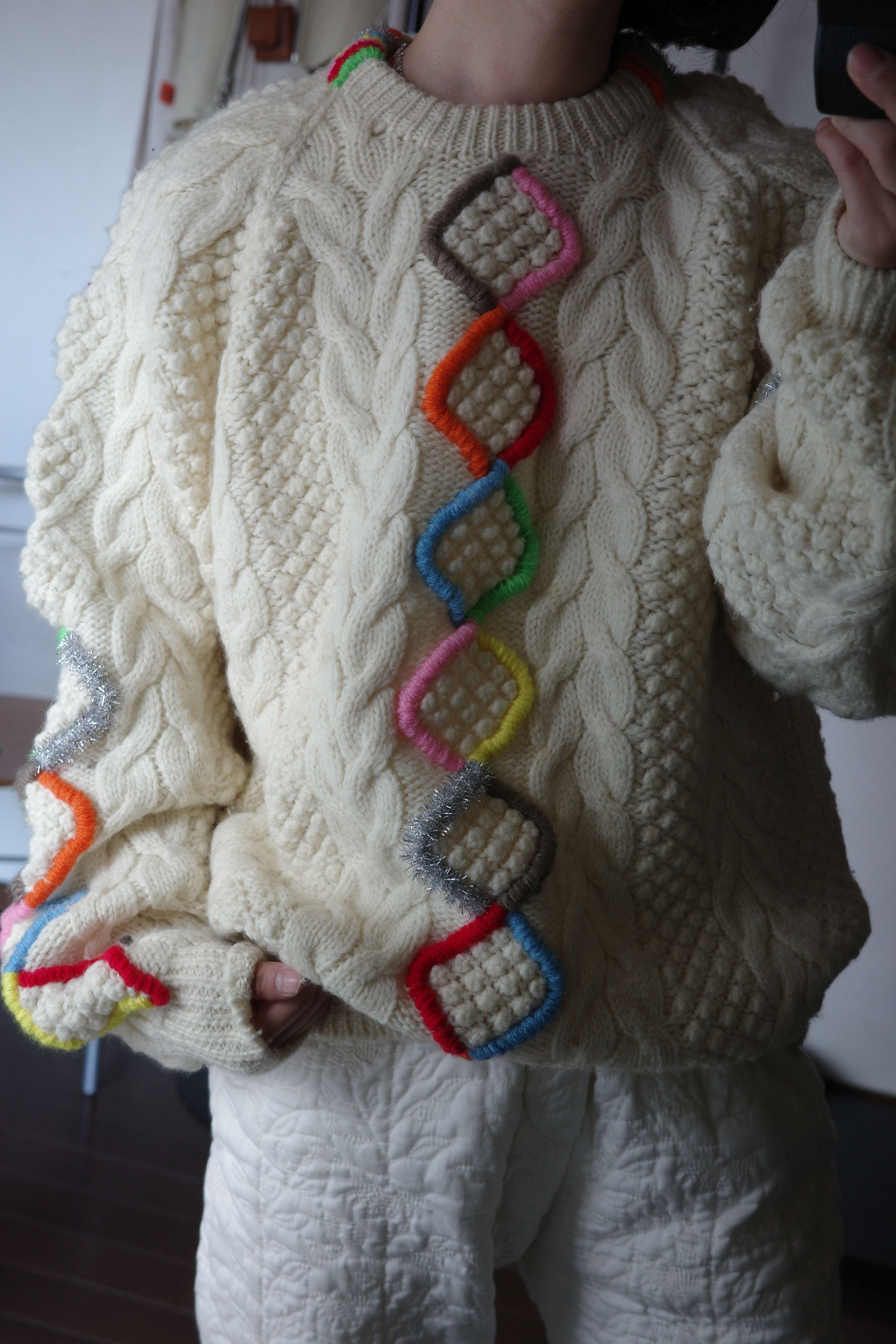 フィッシャーマンニットにひと針ずつハンドステッチを加えた