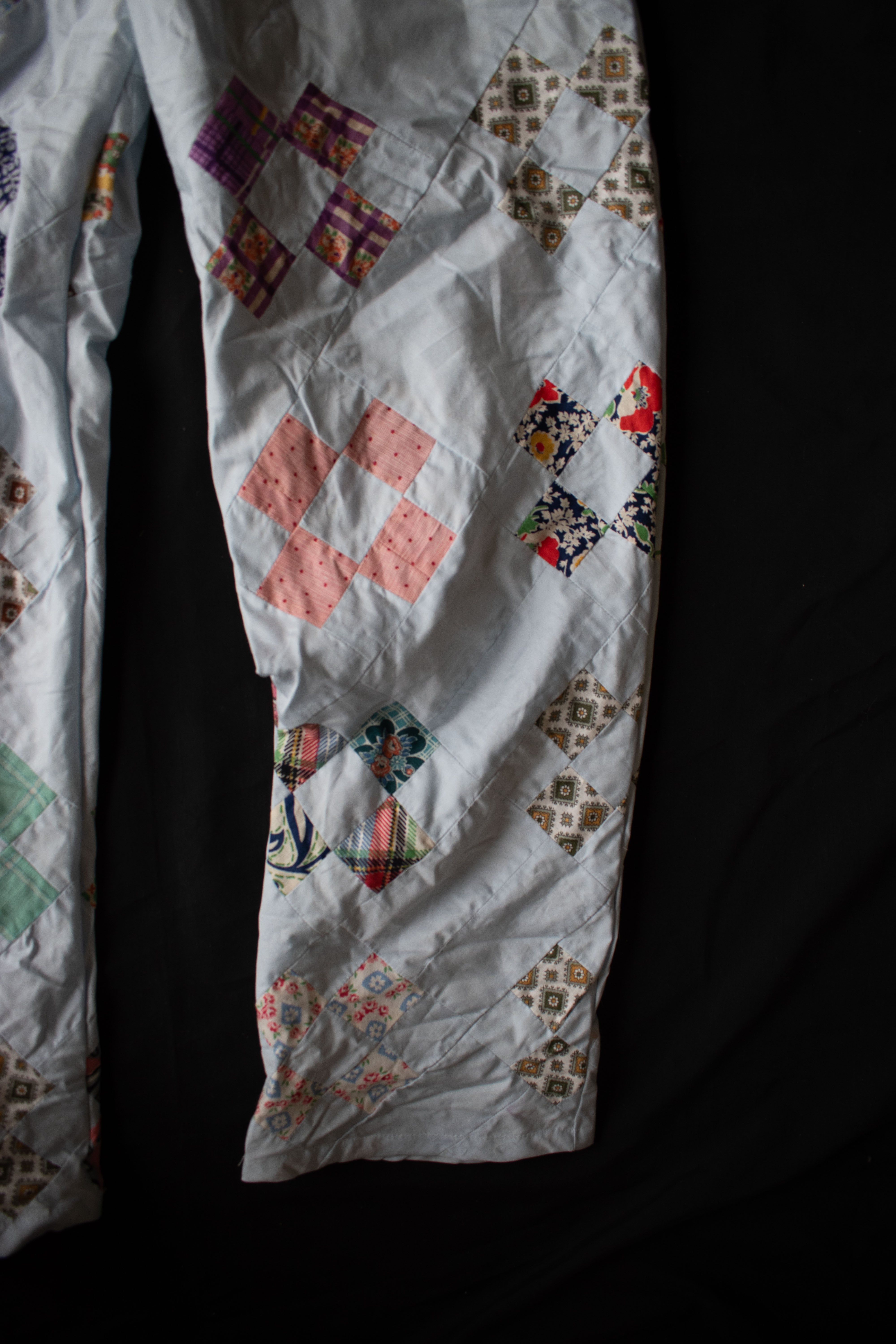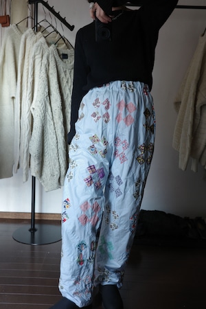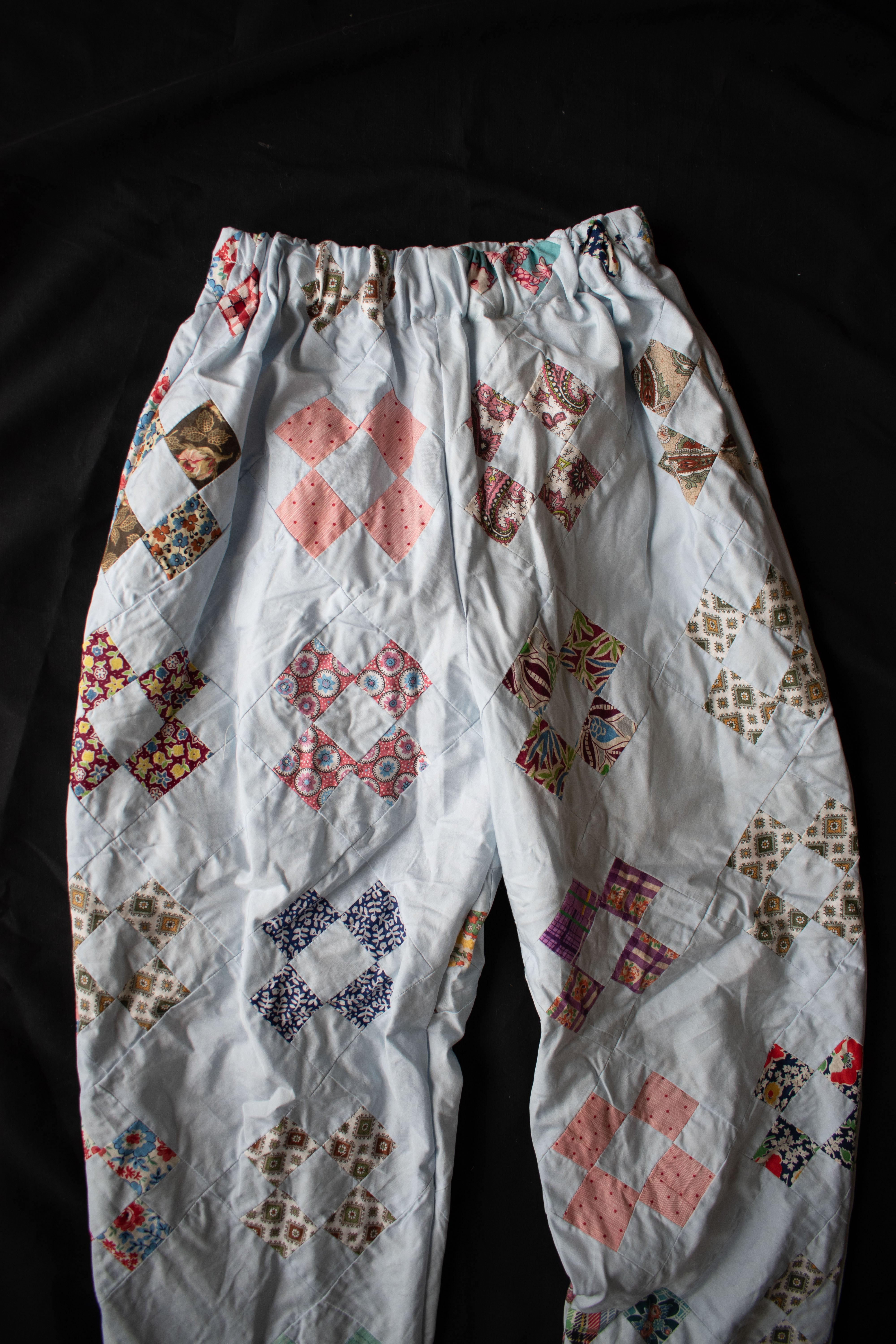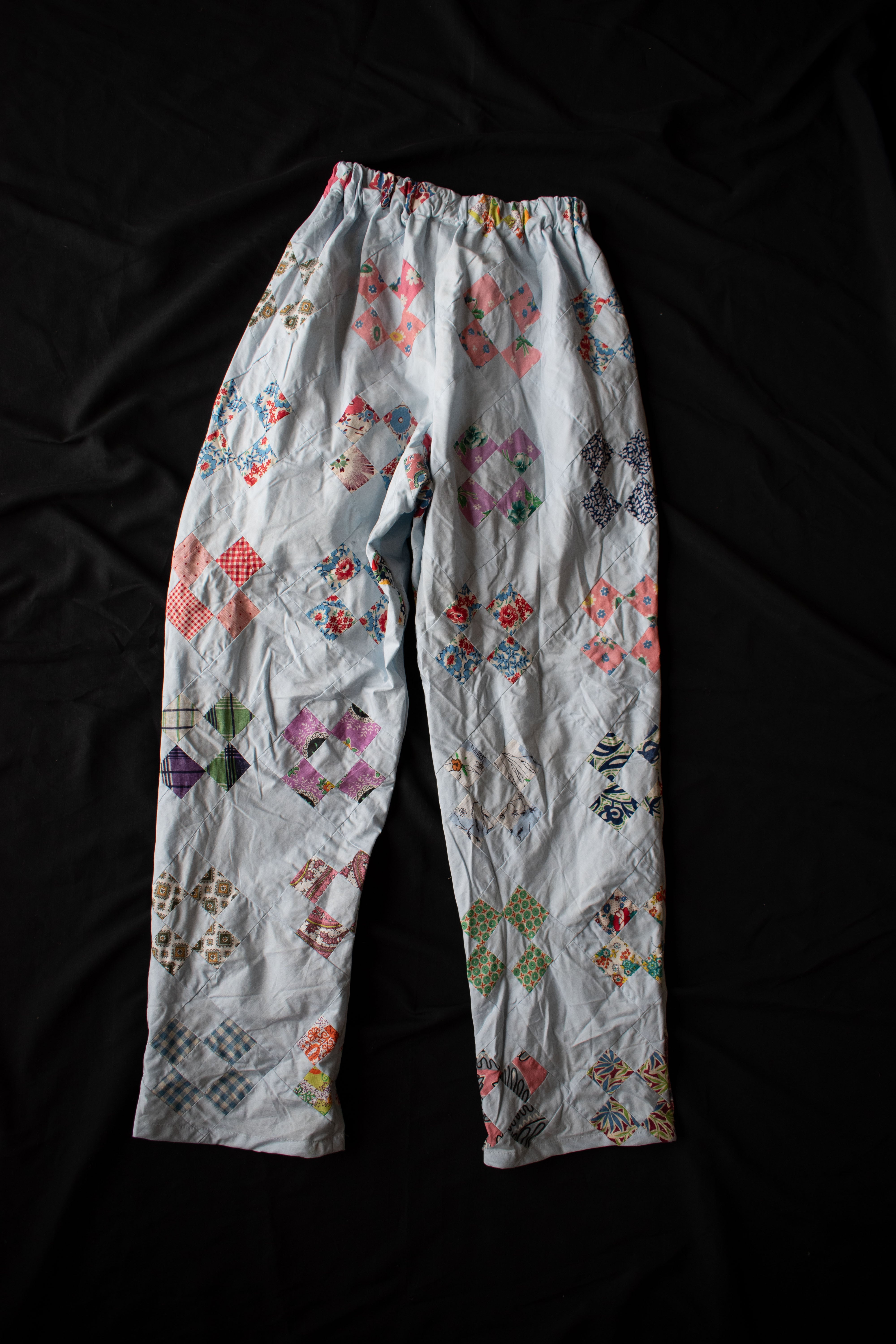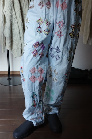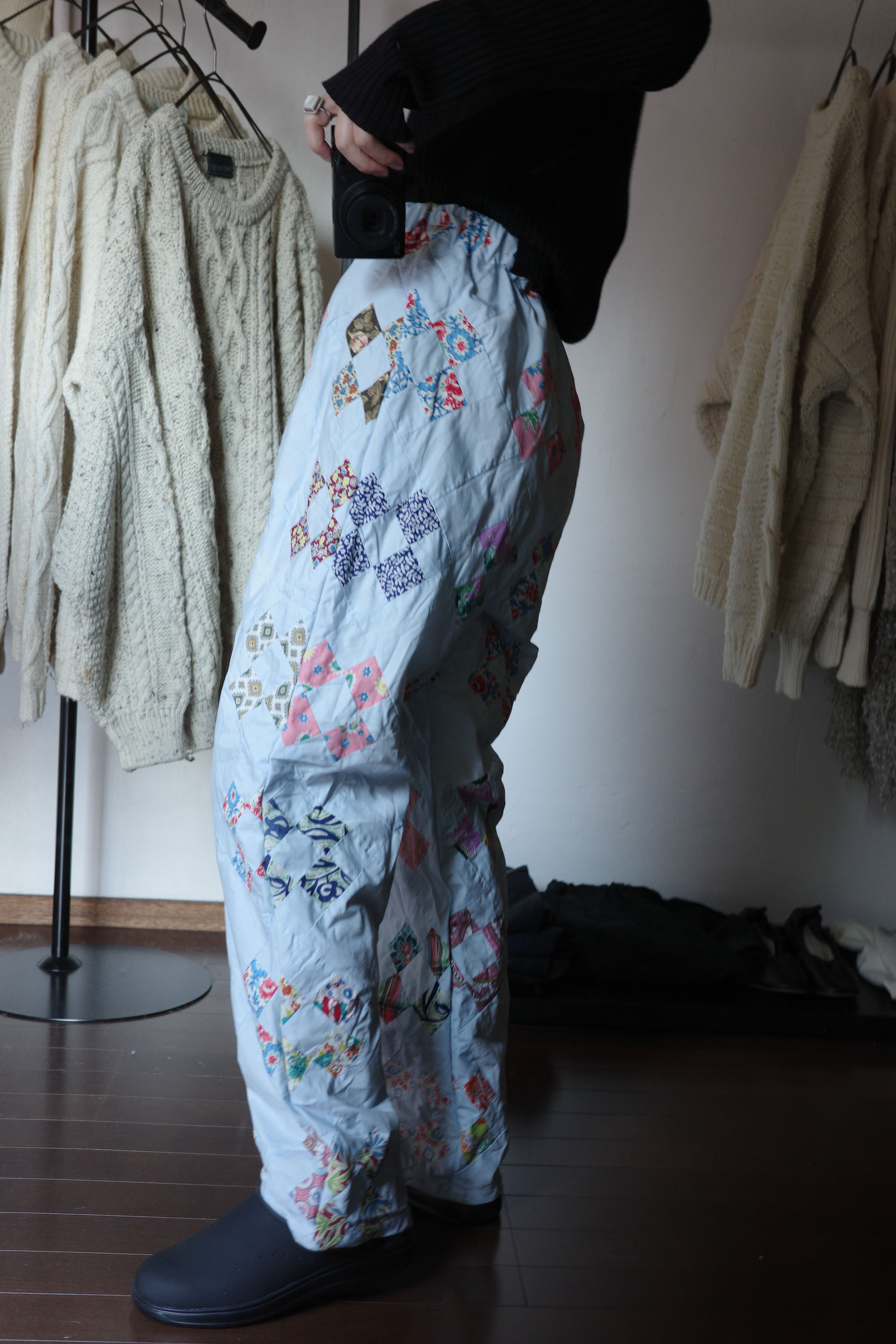 今回は、ヴィンテージのパッチワークキルトを仕立て直したパンツや、