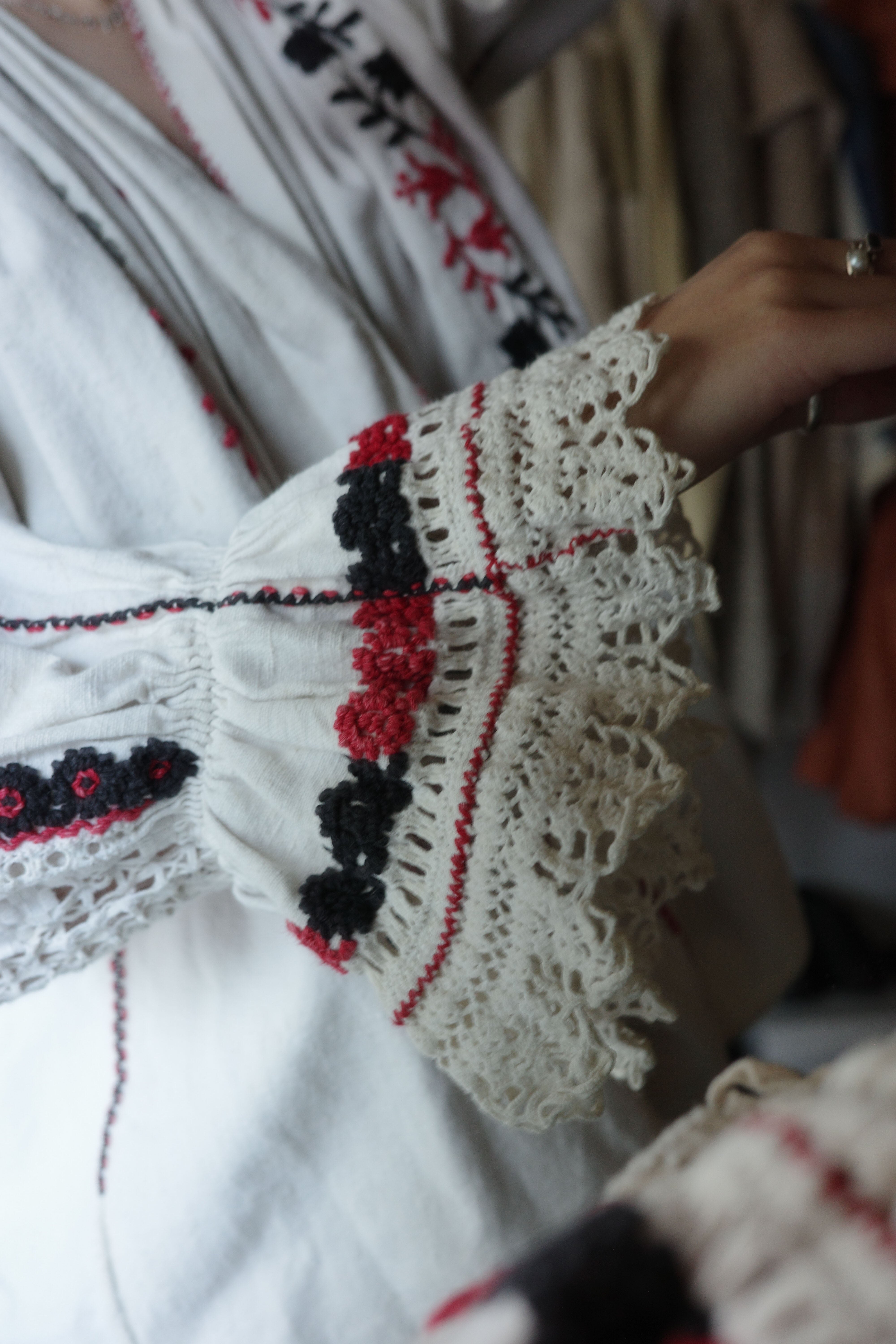 特に袖口のレースと、そこへ重ねられた手刺繍のボリュームは、ルーマニアやハンガリーの民族衣装にみられるクラフトマンシップを色濃く残しています。