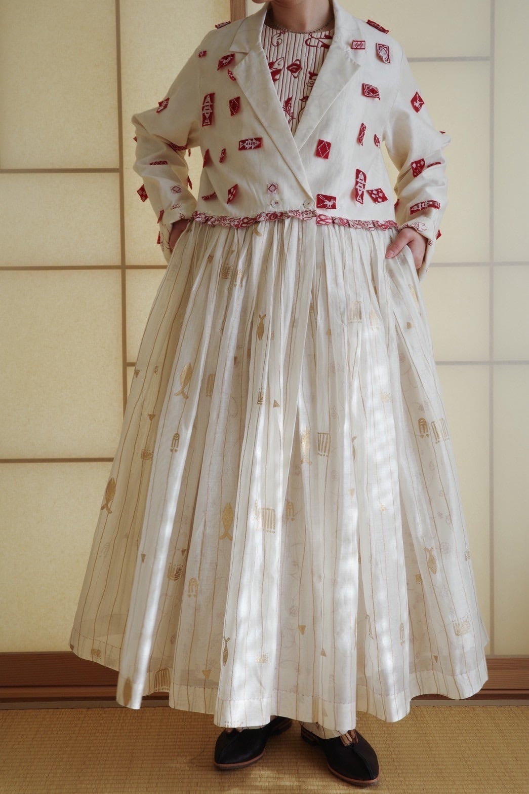 アイボリーの余白に、茜の赤と鈍い金が重なり、
