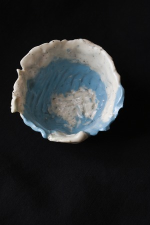 子どもの頃の自由な感覚で、捨てられる服や異素材、漂流物など、いろいろな素材を組み合わせて一点ずつ、アートピースのような服づくりや絵や陶芸なども手掛けている。
