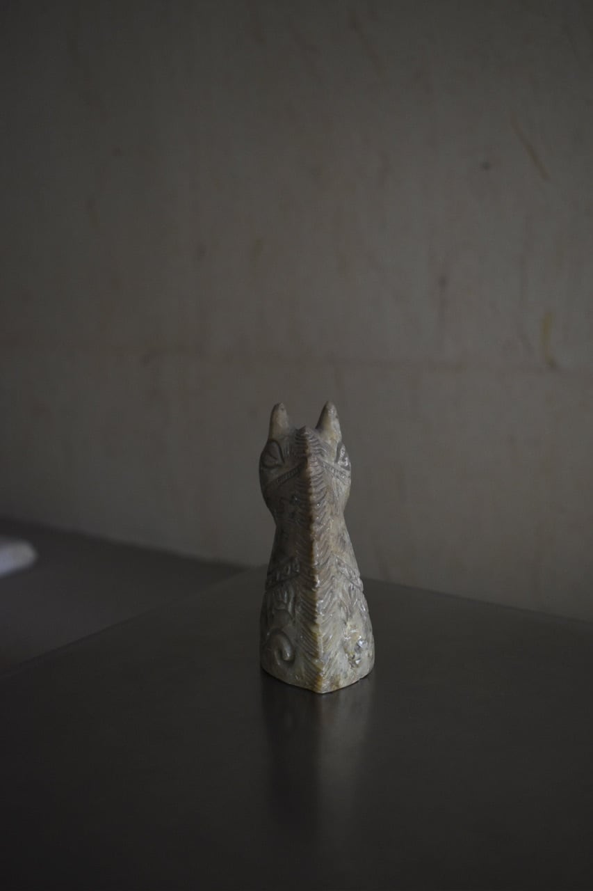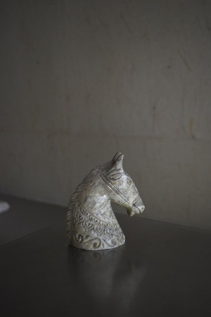 静かに首を傾けた姿が印象的な、馬頭の彫刻オブジェ。