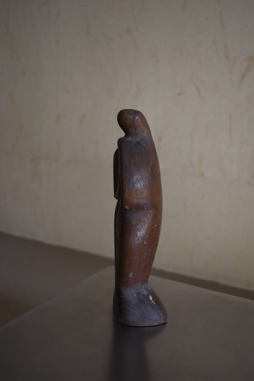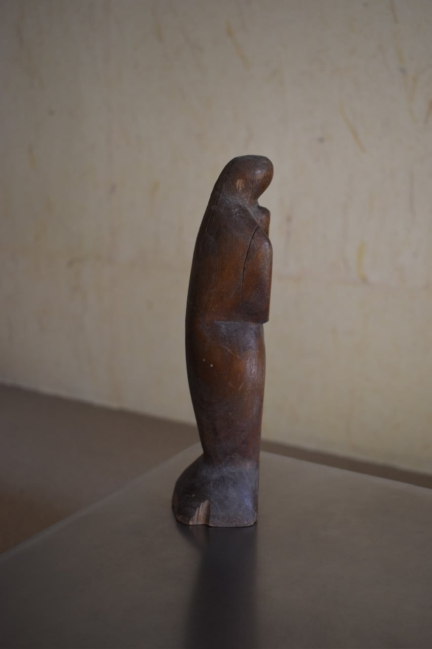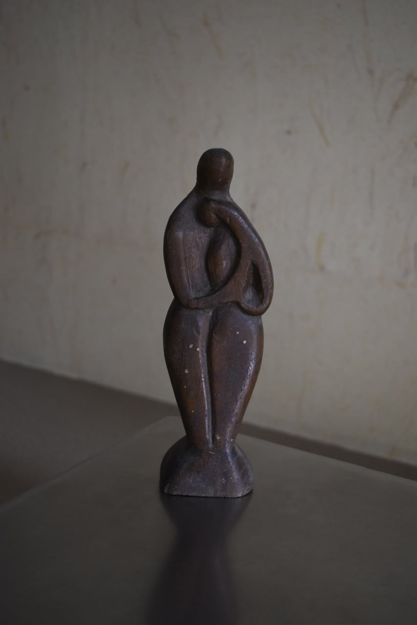 簡潔な線と量感で表現された、木彫りの人物像。