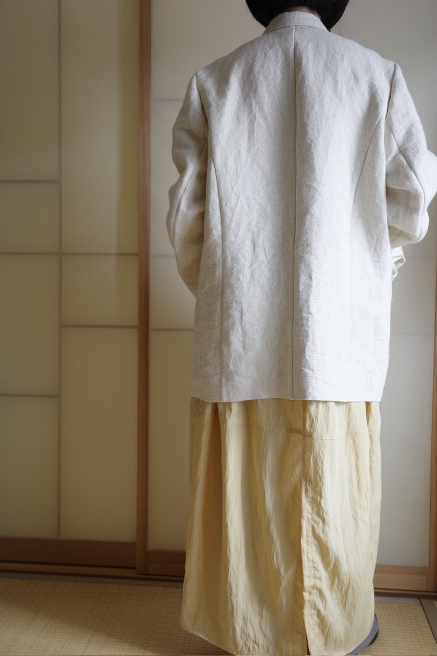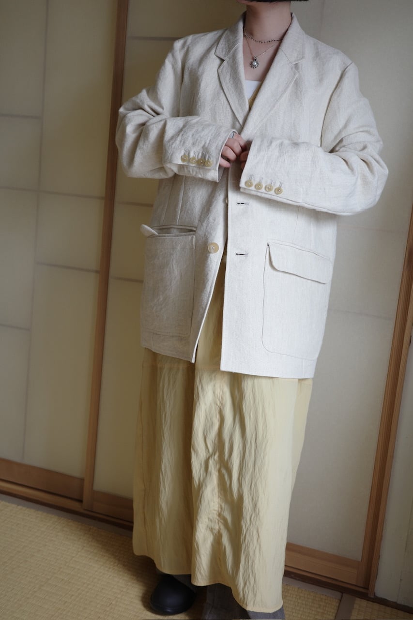 チュニジア紡績の高級ヘンプの生成と、極太の特殊紙糸で織っているヘンプ本来の混じり気のない黄金色がとても美しいです。着るほど、洗うほどに柔らかくなり皺があっても上品です。