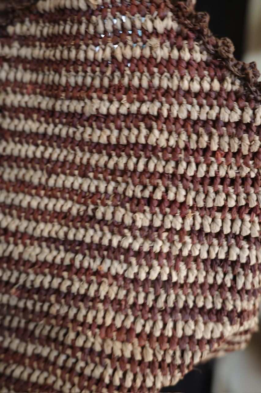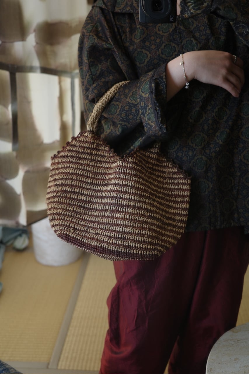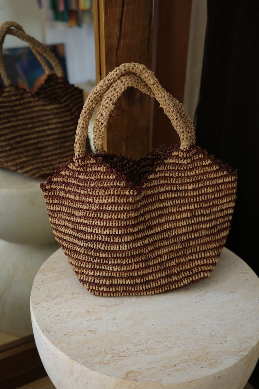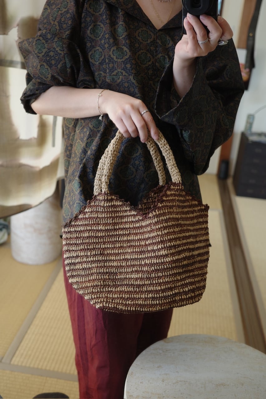 こげ茶x紅茶の細かいボーダー柄のラフィアミニバッグです。四角底で自立して、身の回りのものがしっかり入れられます。素材は、しなやかで軽いマダガスカル産ラフィアを使用しています。熟練の編み子さんが、丁寧に編み上げているので、仕上がりが大変美しく、永くお使いいただけます。