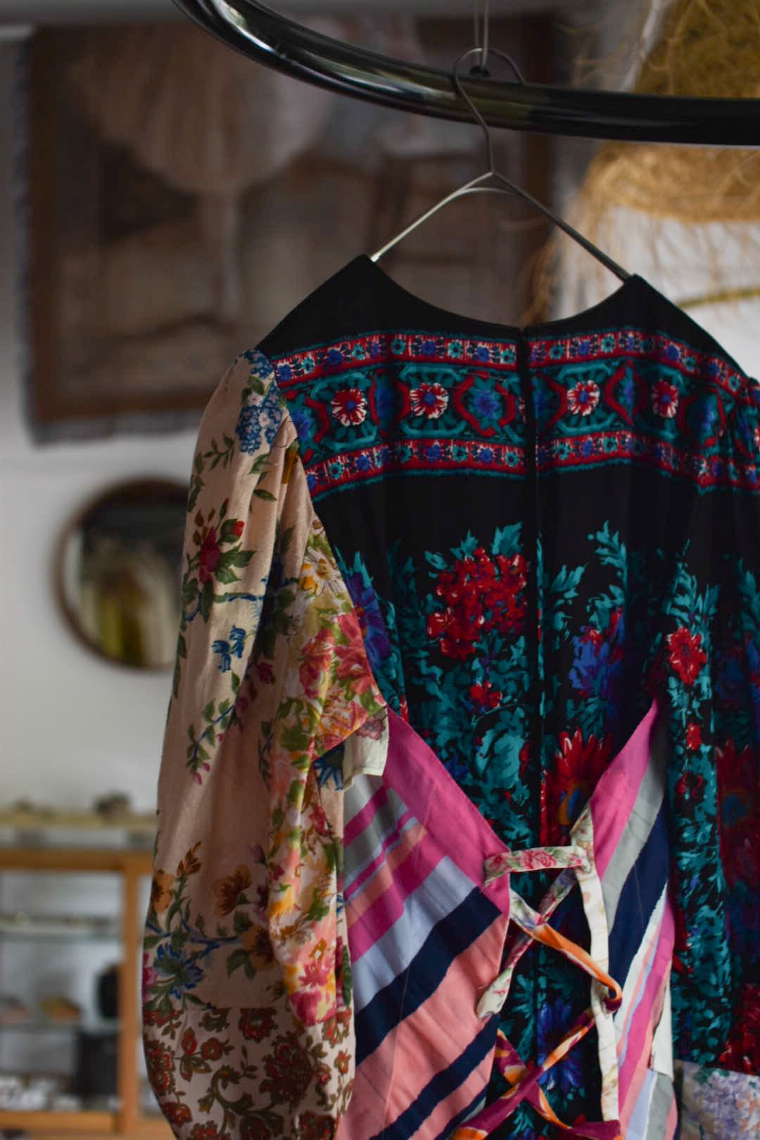 ヴィンテージのスカーフ、中古の生地を使った、色や柄を楽しむ服を制作している。