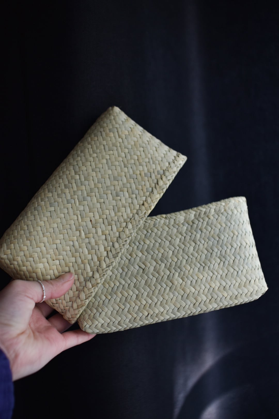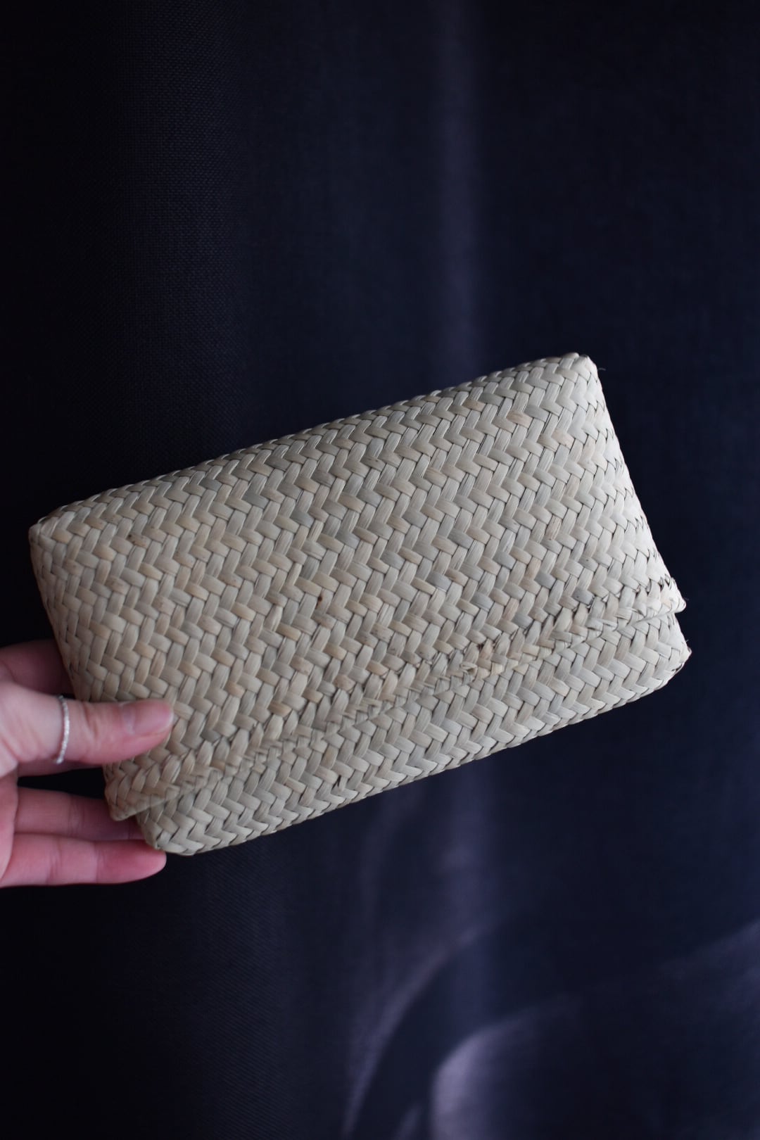 しなやかで軽い素材の「フルナ」と呼ばれる水草で、蓋をすっぽりとかぶせることができ、通帳や小物など収納できるポーチです。