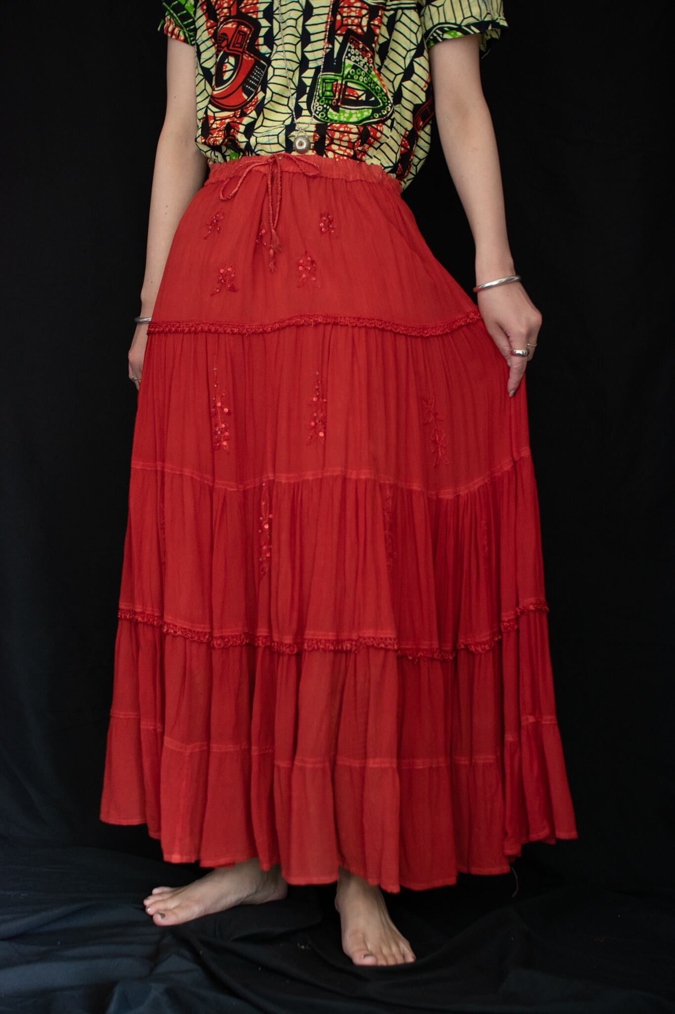 サラッとした質感の刺繍とスパンコールが施されたとろみのあるスカート。