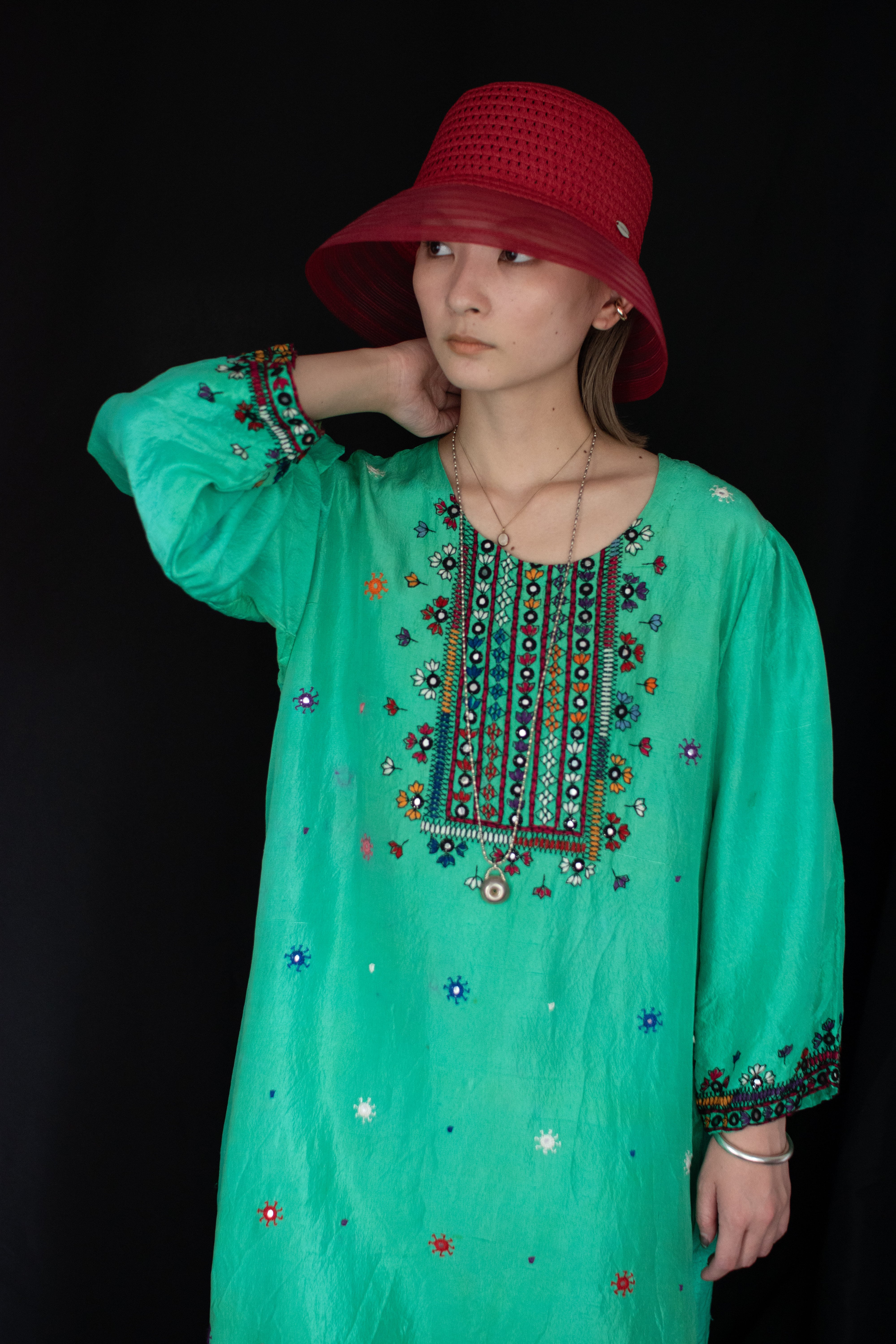 ミラーワークや刺繍が美しいインドのシルクワンピース。