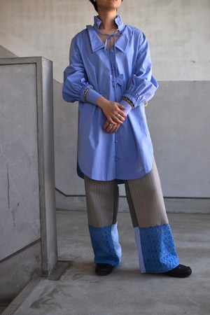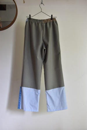 古布をパッチワークにしたものを土台にし、スカーフやオリジナルのスタンプなどでコラージュしたリラックス感のあるパンツ。