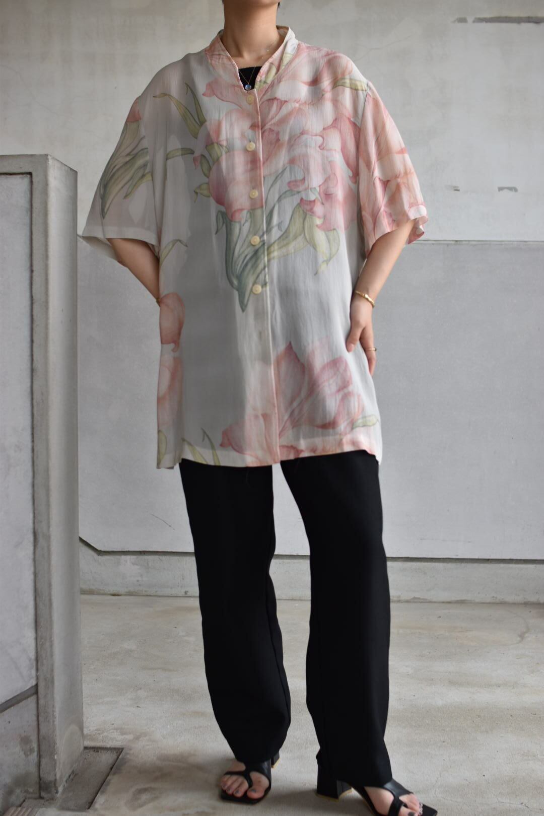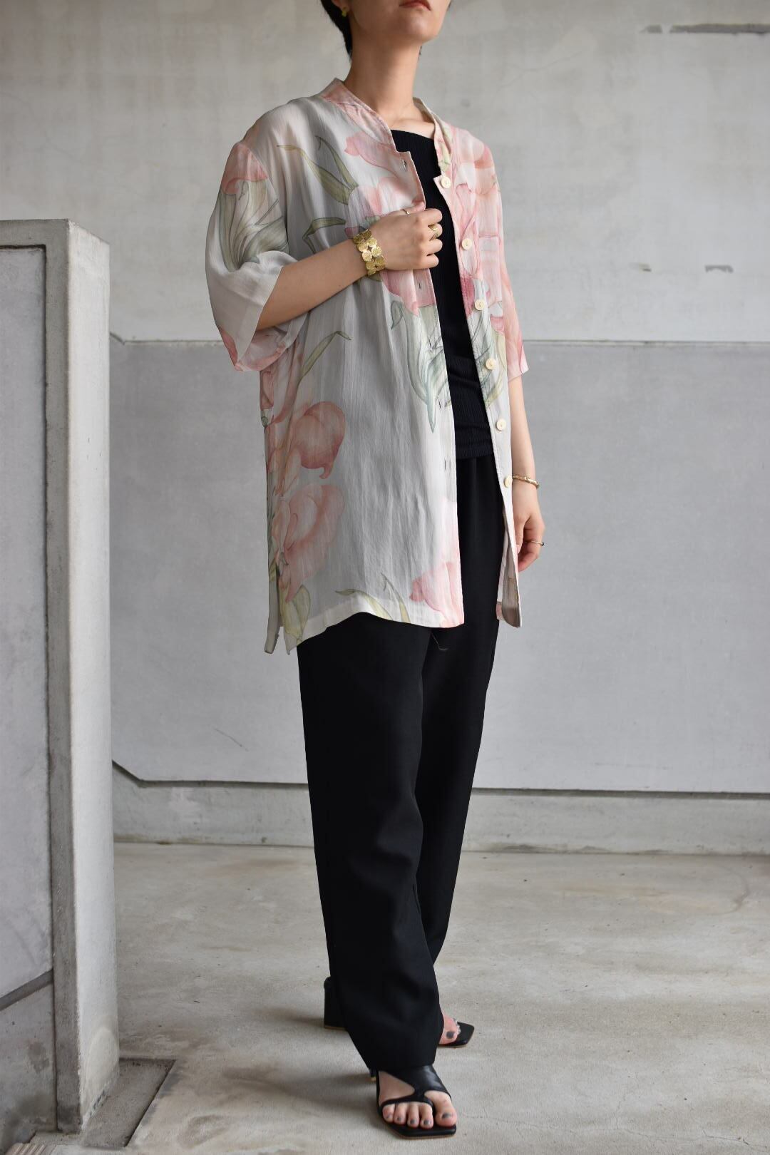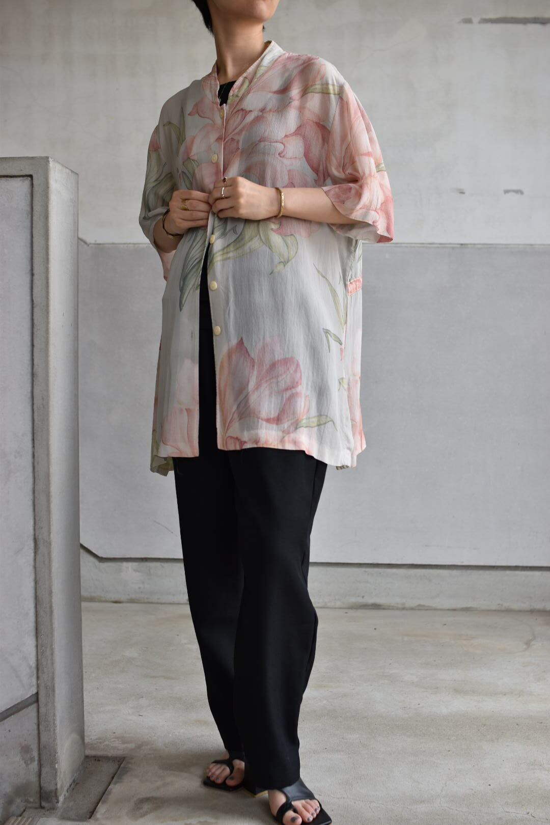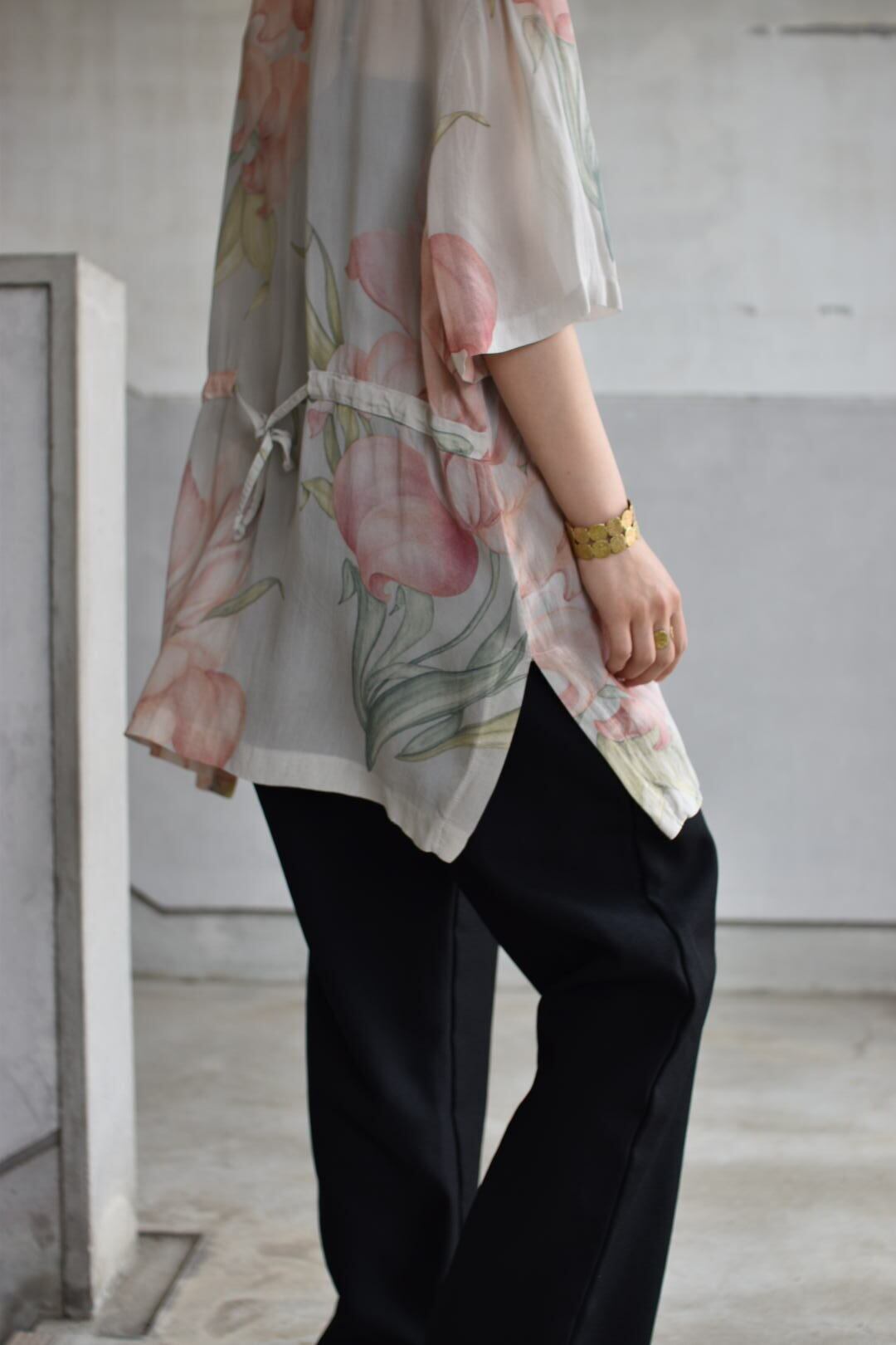 色鉛筆で描かれたような優しいお花のプリントが印象的な一枚。