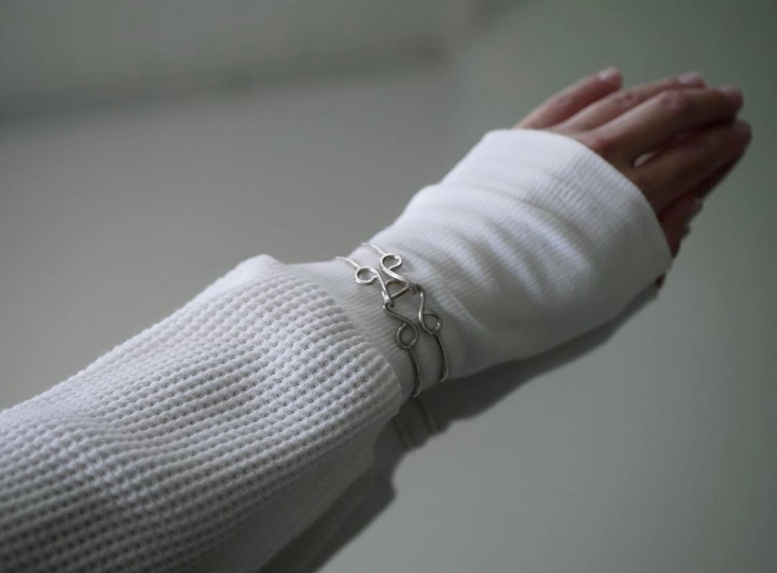 バングルの周囲は広げたり狭めたり多少でしたら動かしてサイズ調整が可能です。毎度開閉作業をしていくと折れてしまう可能性がございますのでご注意ください。