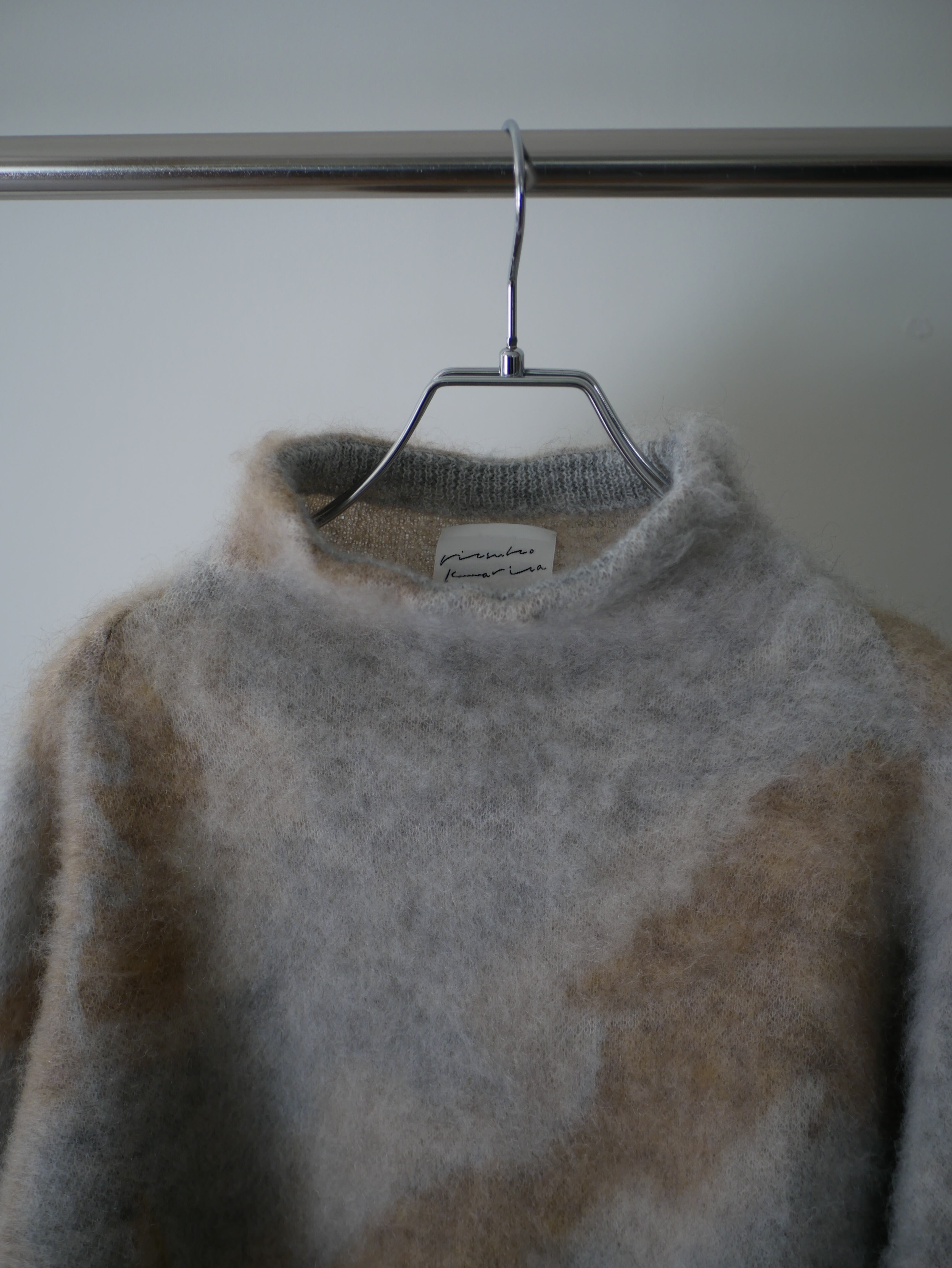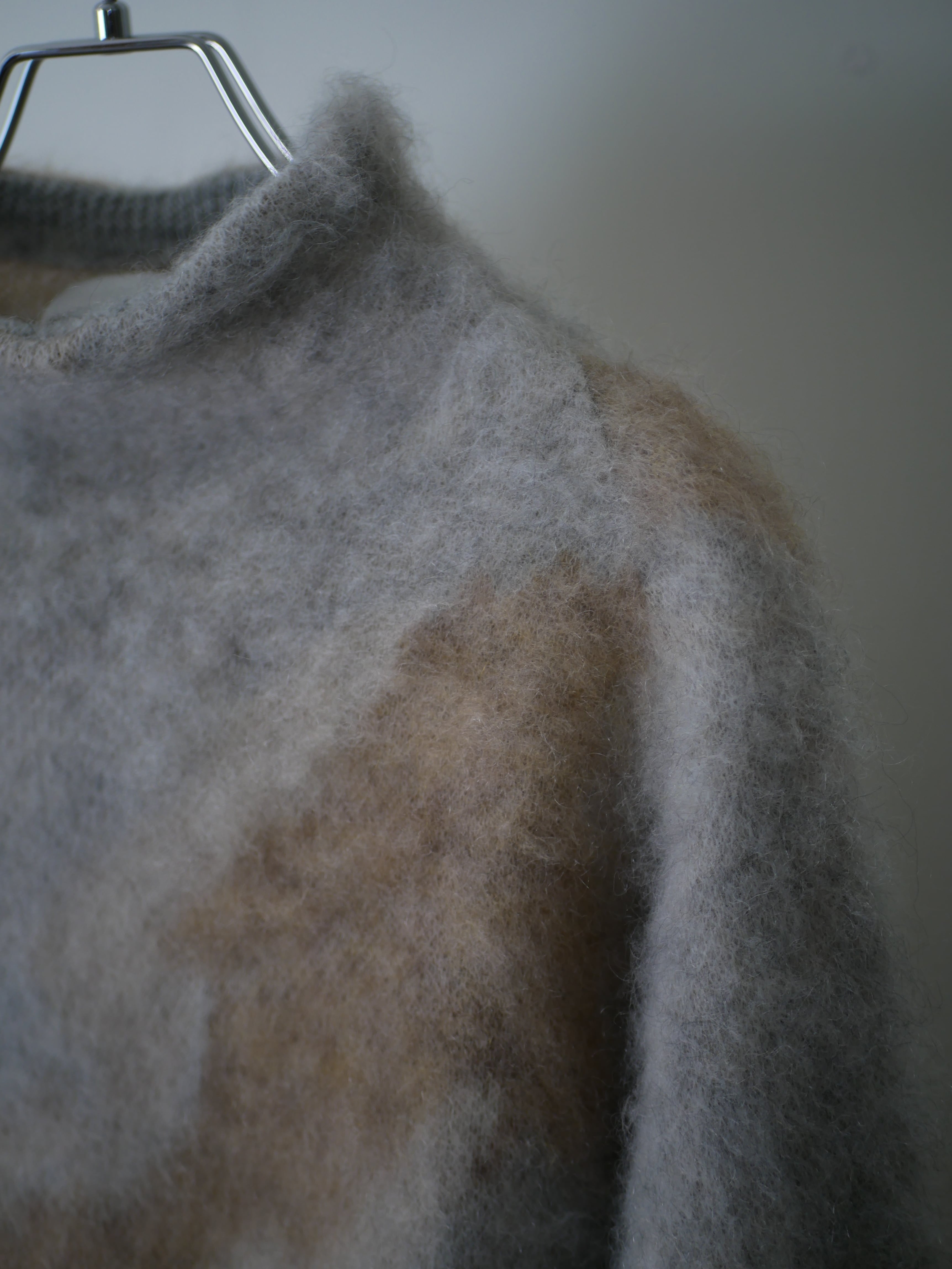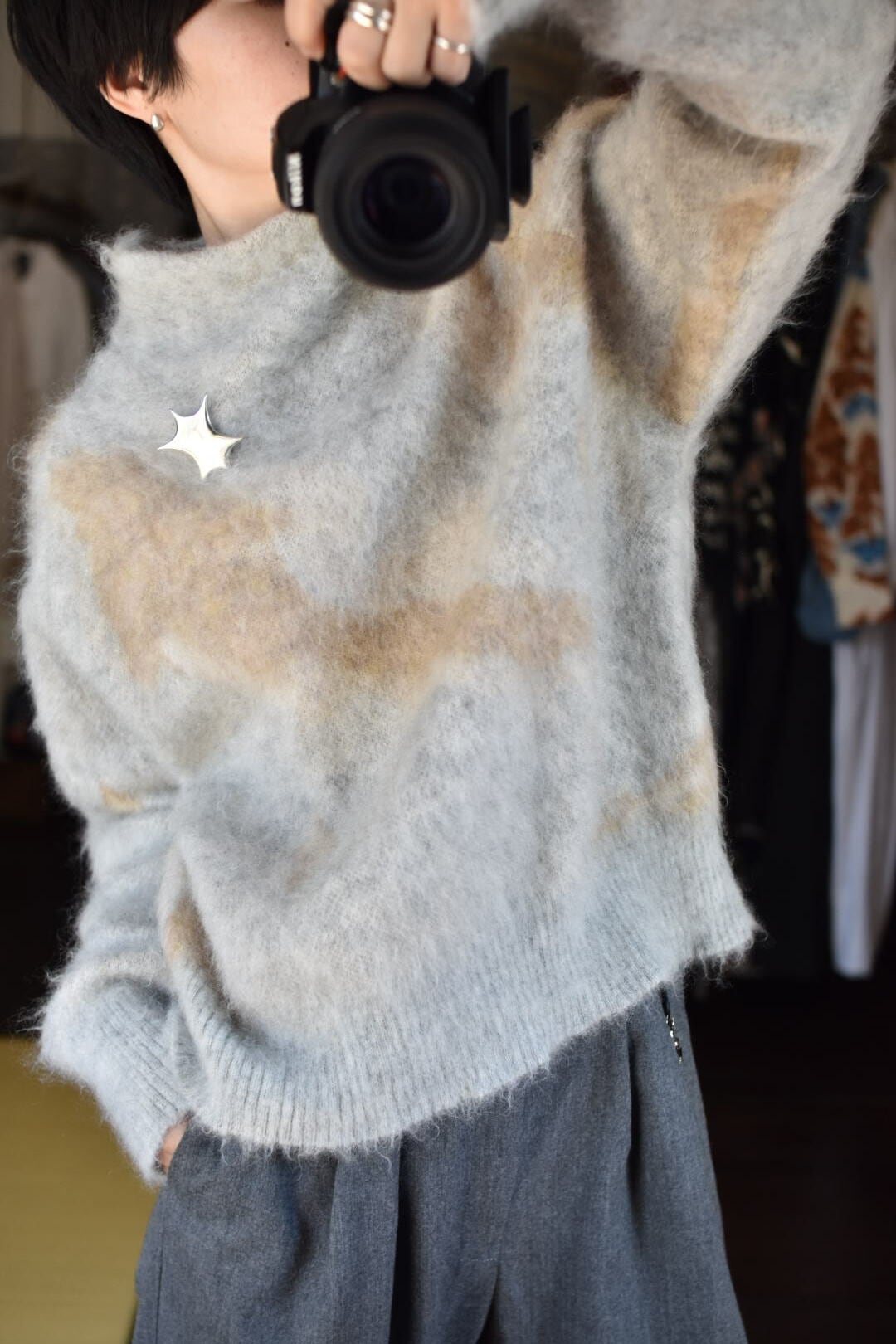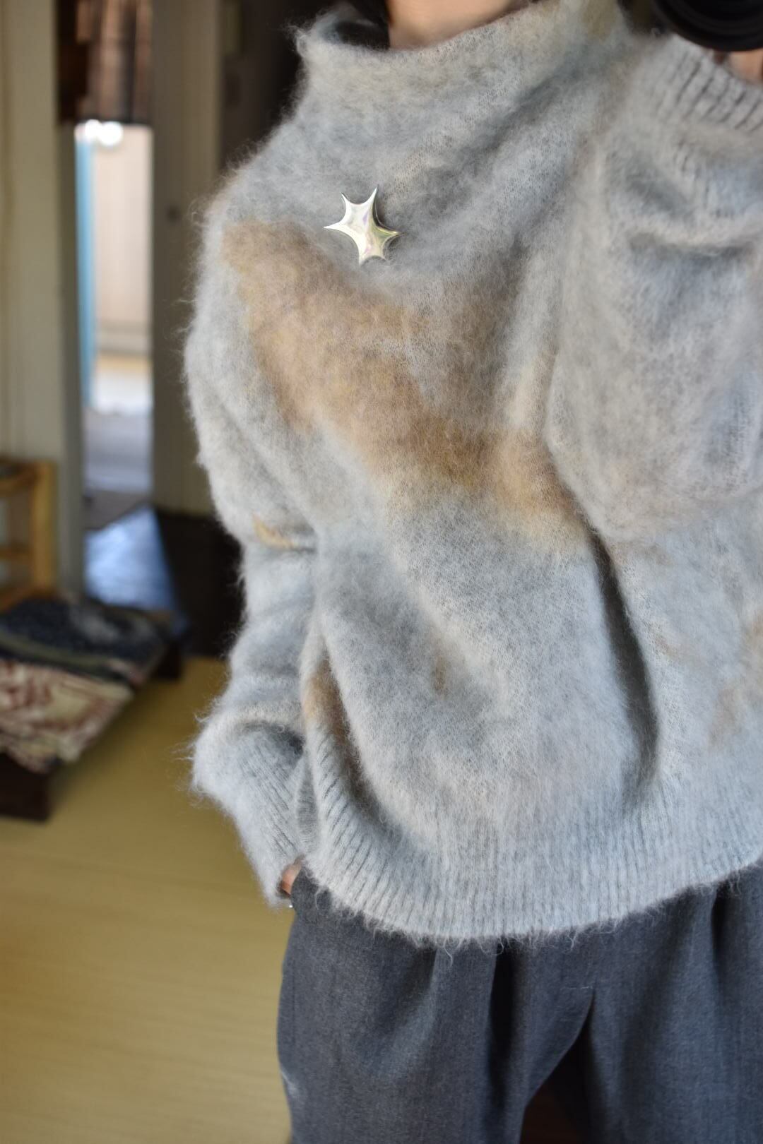土に横たわる馬の毛の汚れか模様か曖昧な色合いを自分の中で解釈し、纏えどのようなアイテムになるかニットアイテムで反映した1枚。キッドモヘアのプルオーバーに。