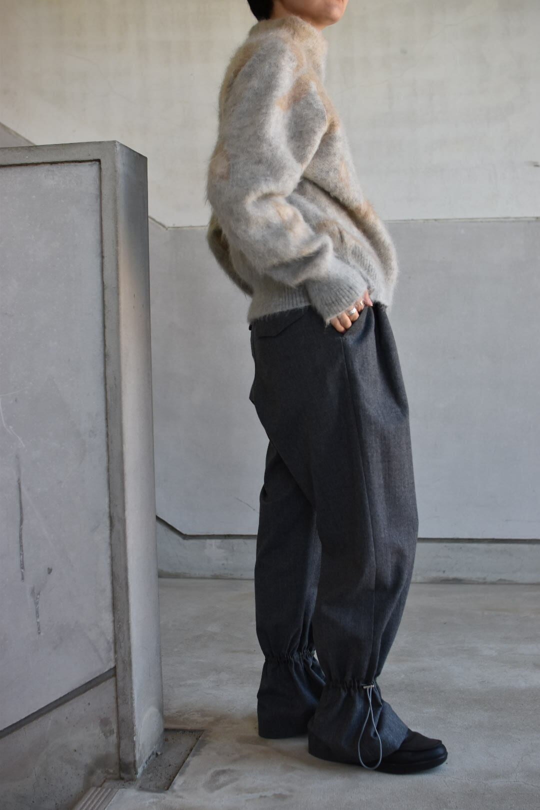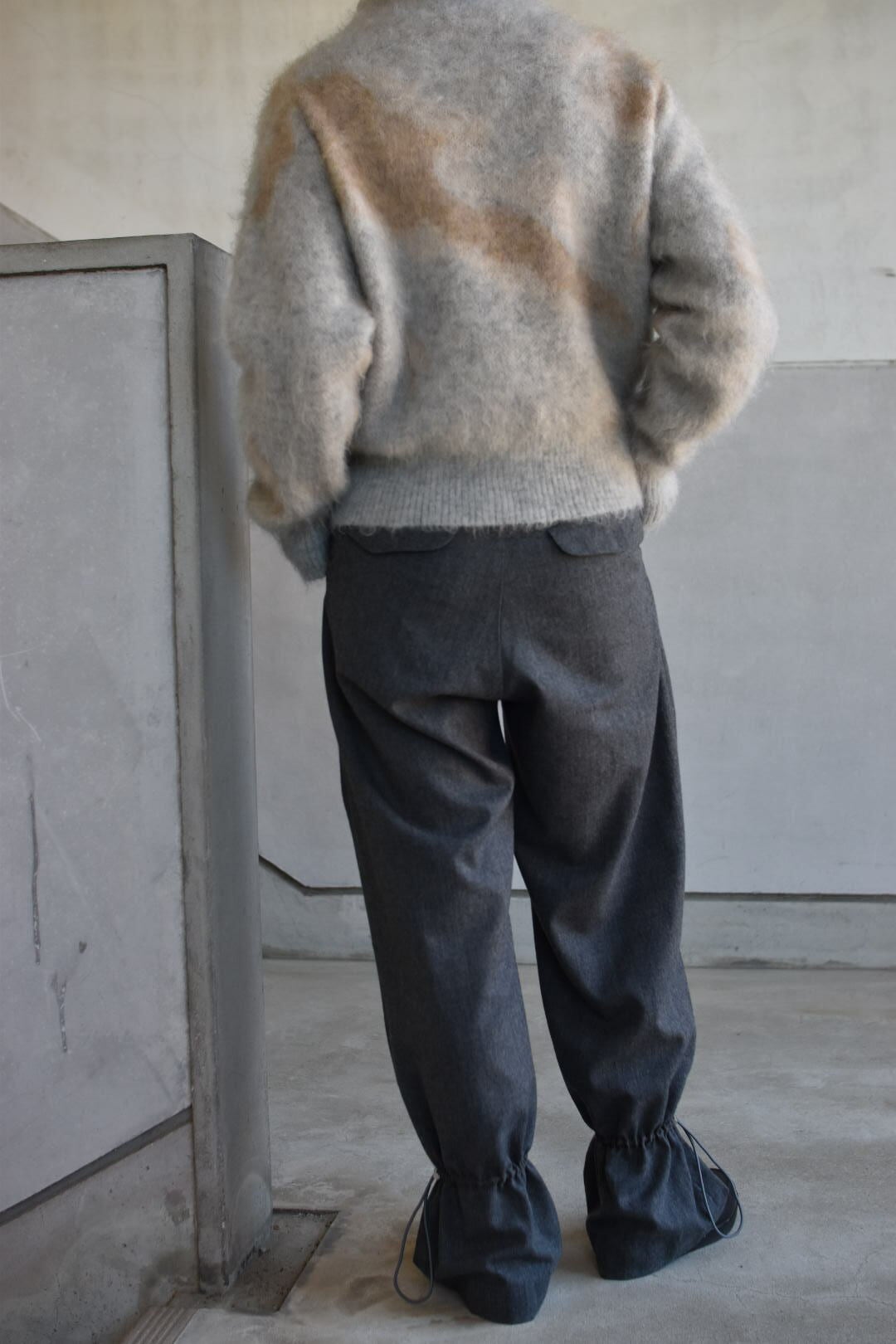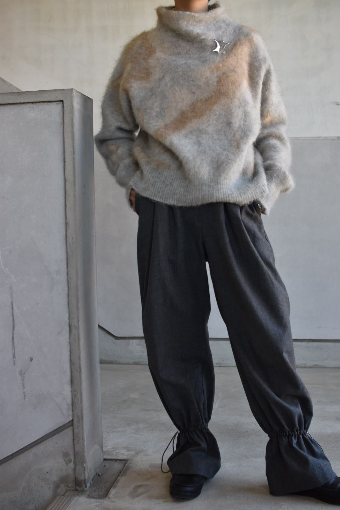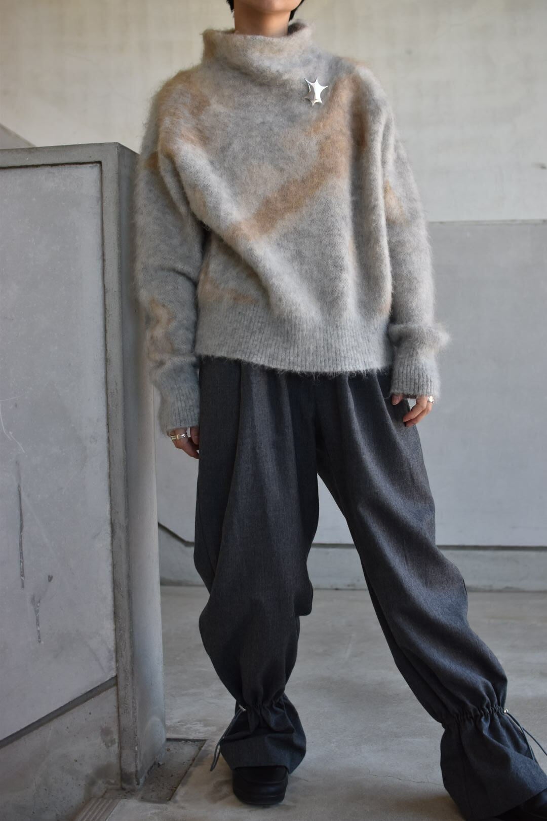 土に横たわる馬の毛の汚れか模様か曖昧な色合いを自分の中で解釈し、纏えどのようなアイテムになるかニットアイテムで反映した1枚。キッドモヘアのプルオーバーに。