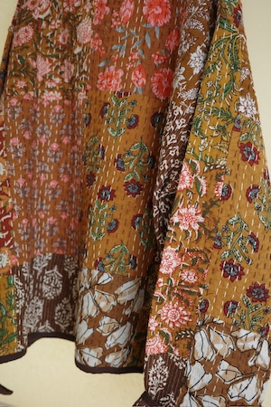 様々なお花の柄のテキスタイルのパッチワークに刺子が施されています。