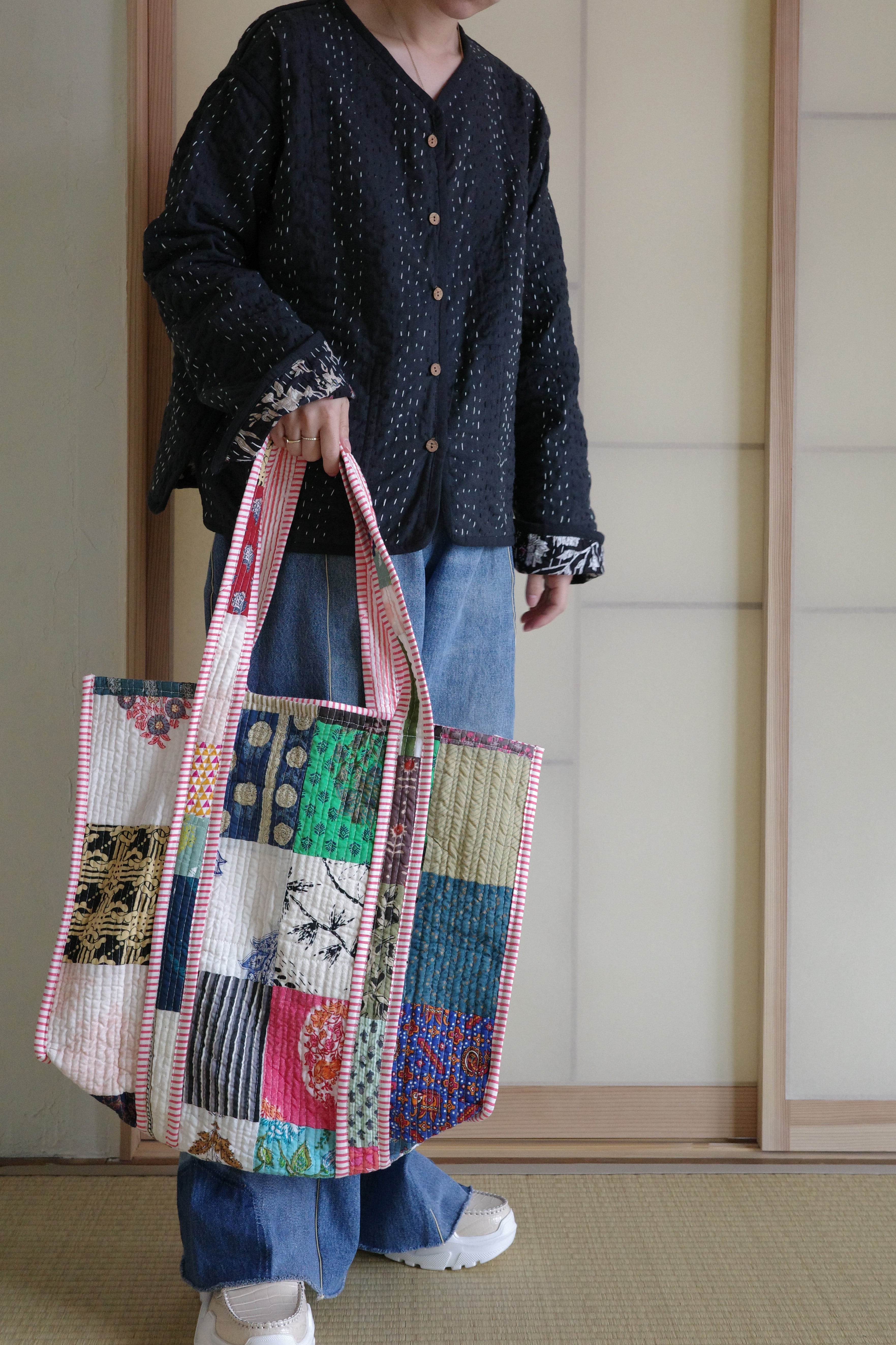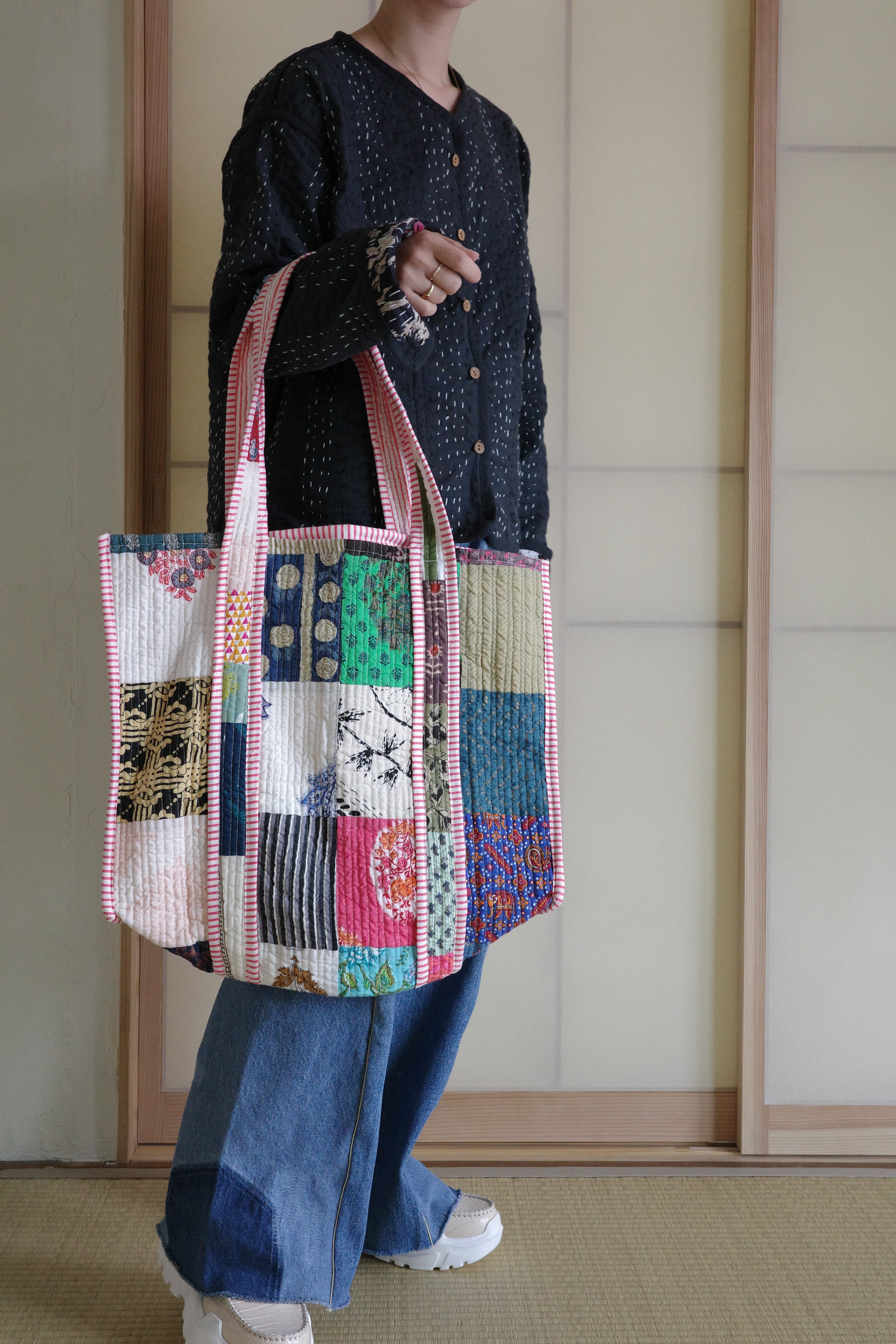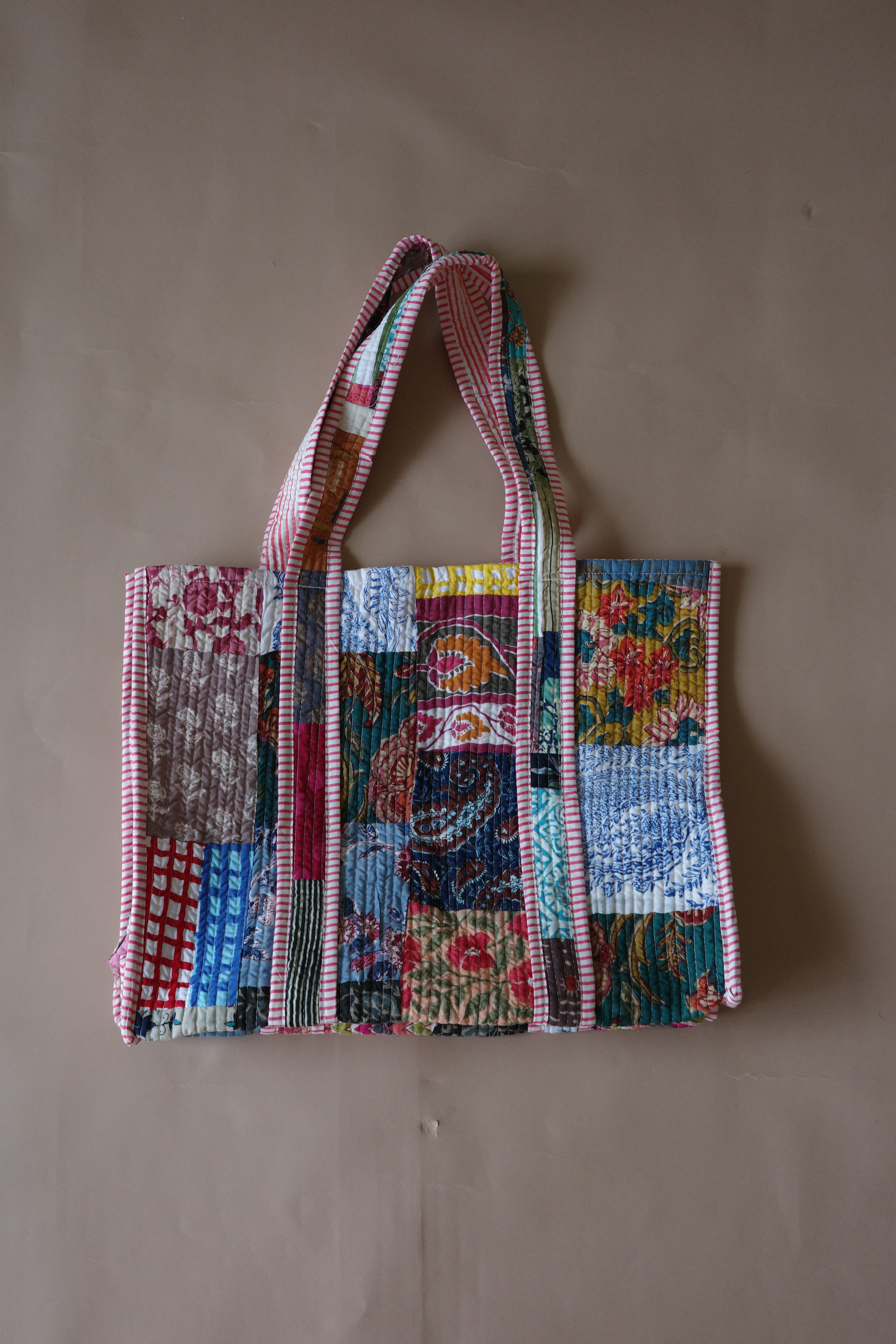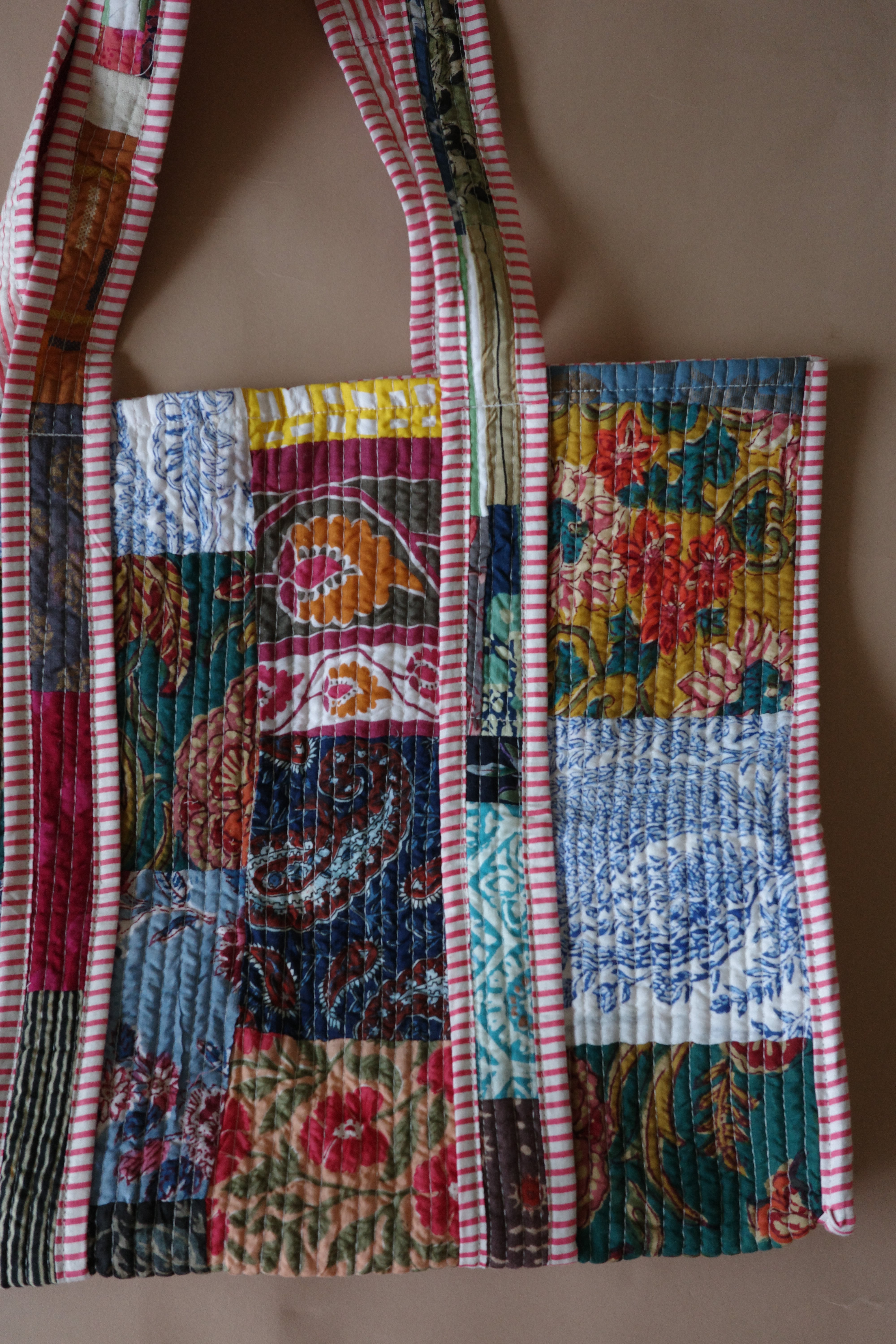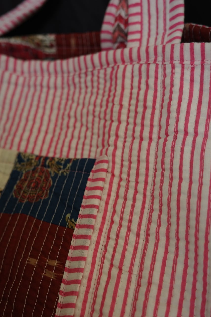 現在インドで制作されているキルティングのパッチワークトートバッグ。
