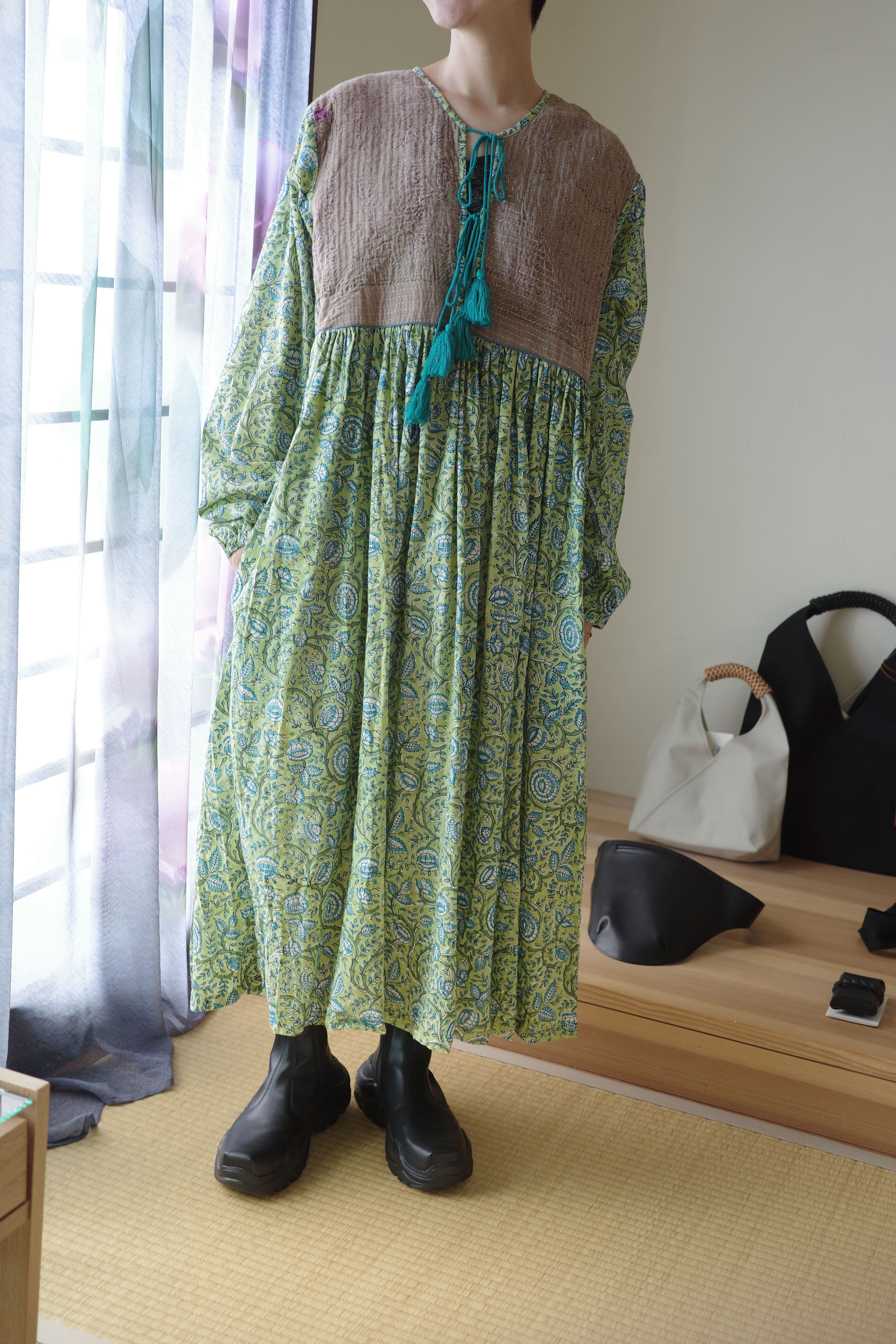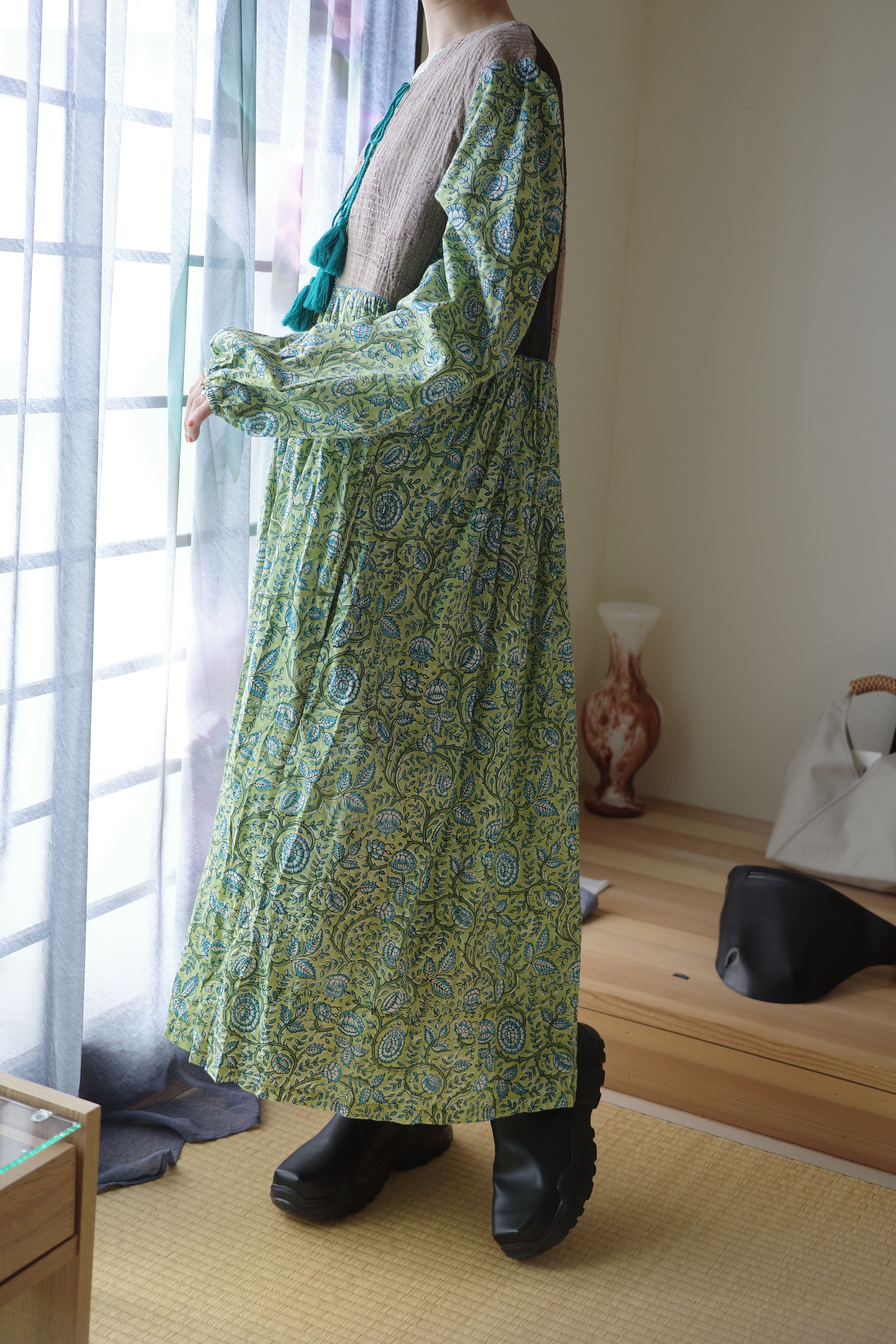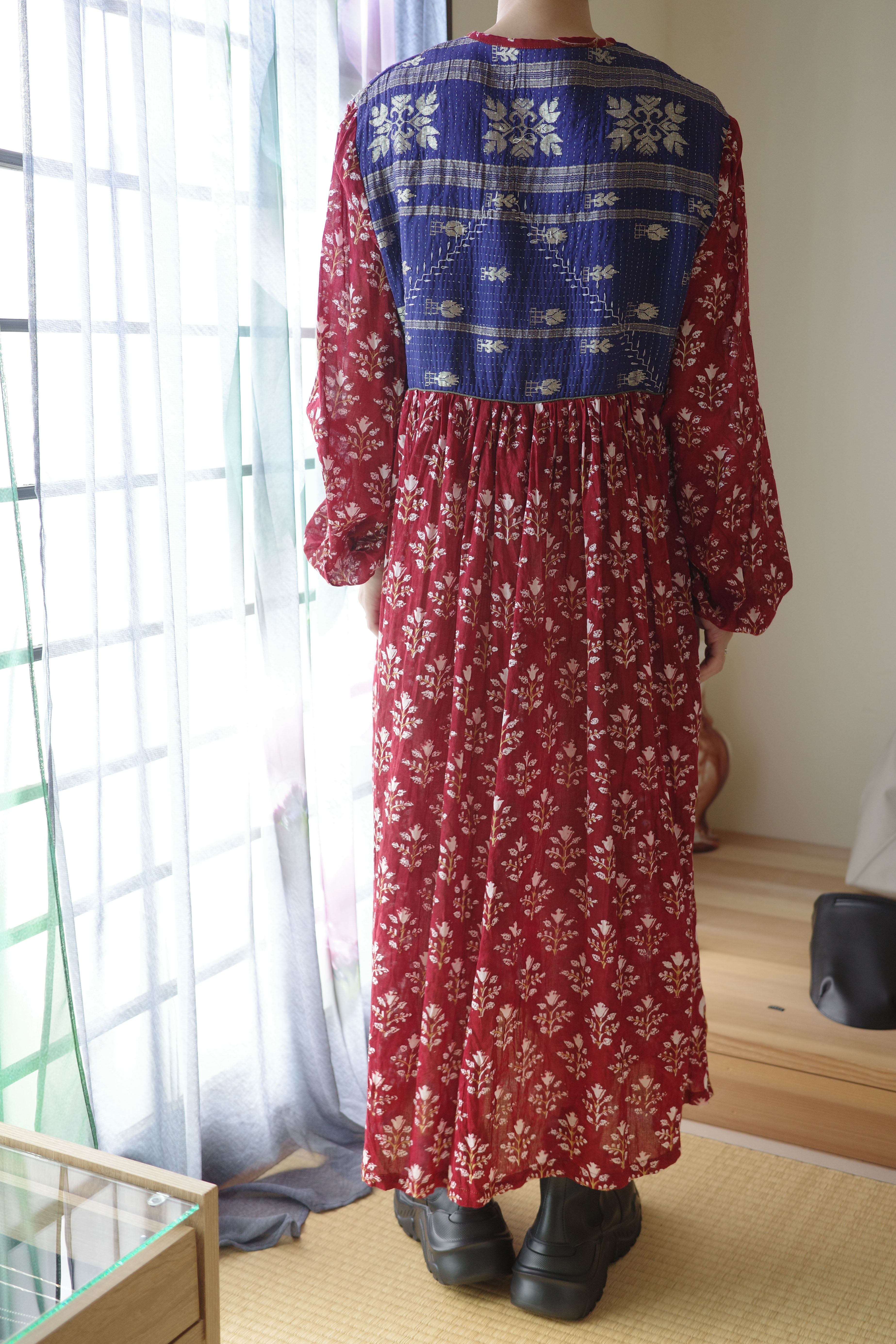 現在制作されているインド綿に美しいブロックプリントの布をドッキングしたワンピース。