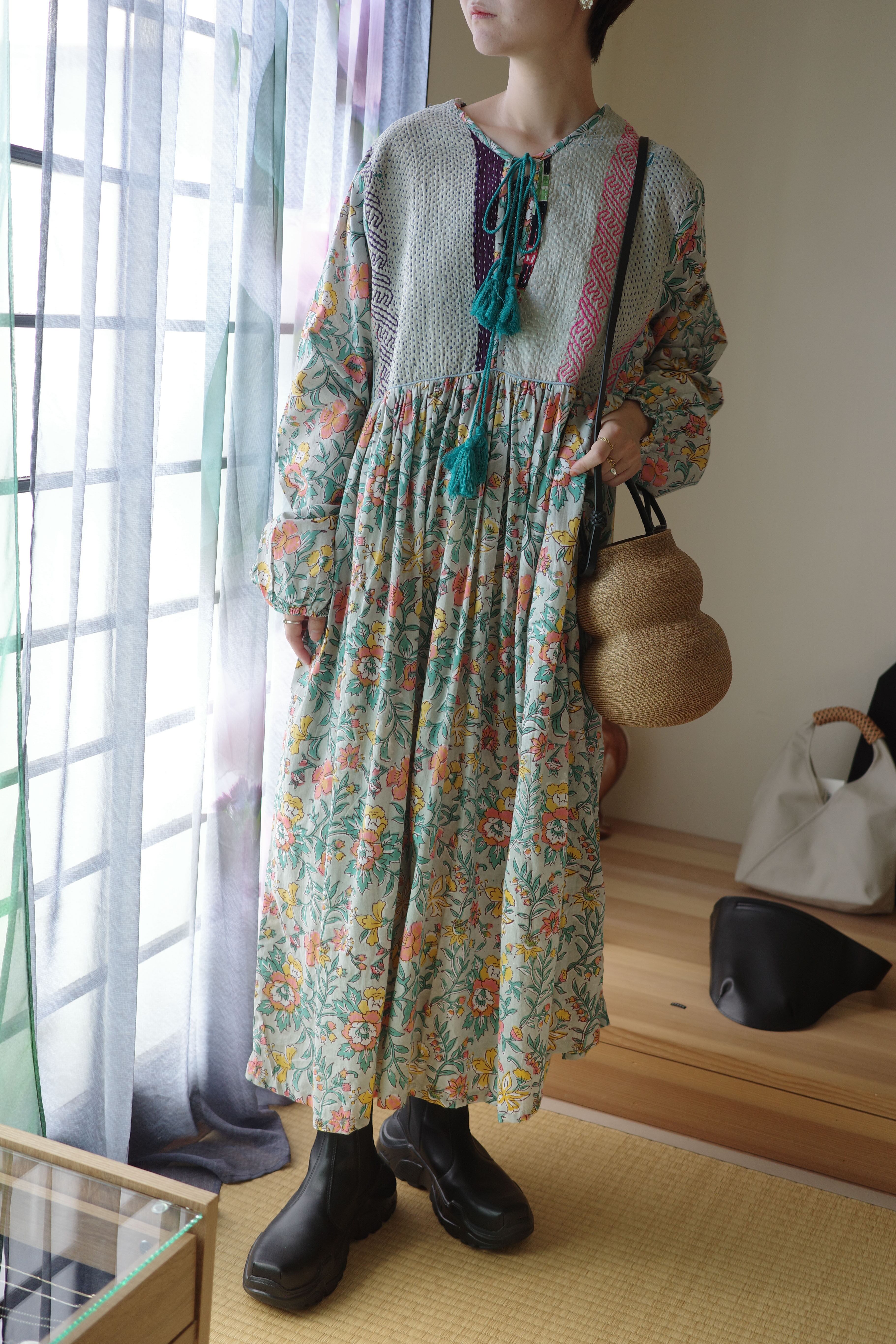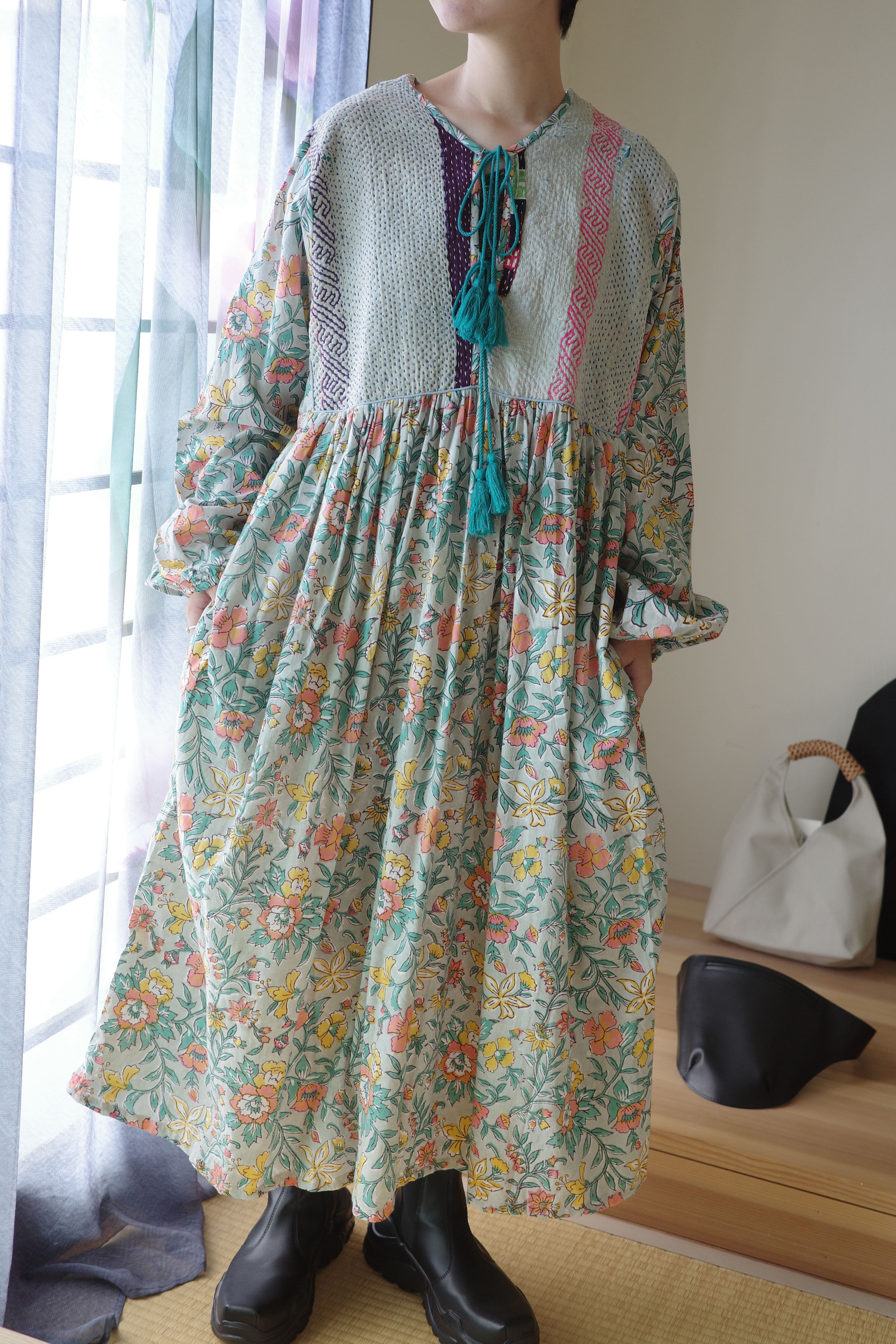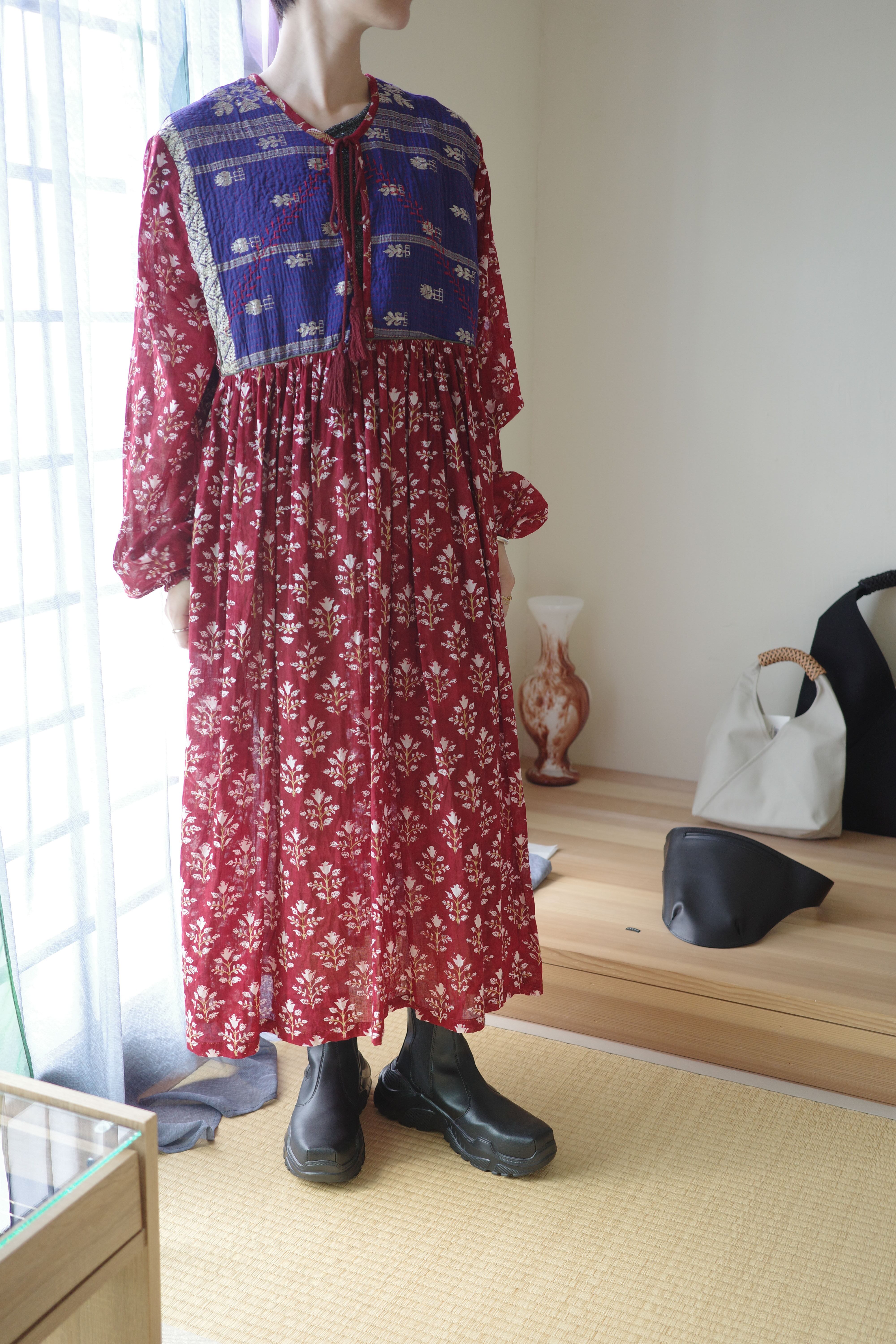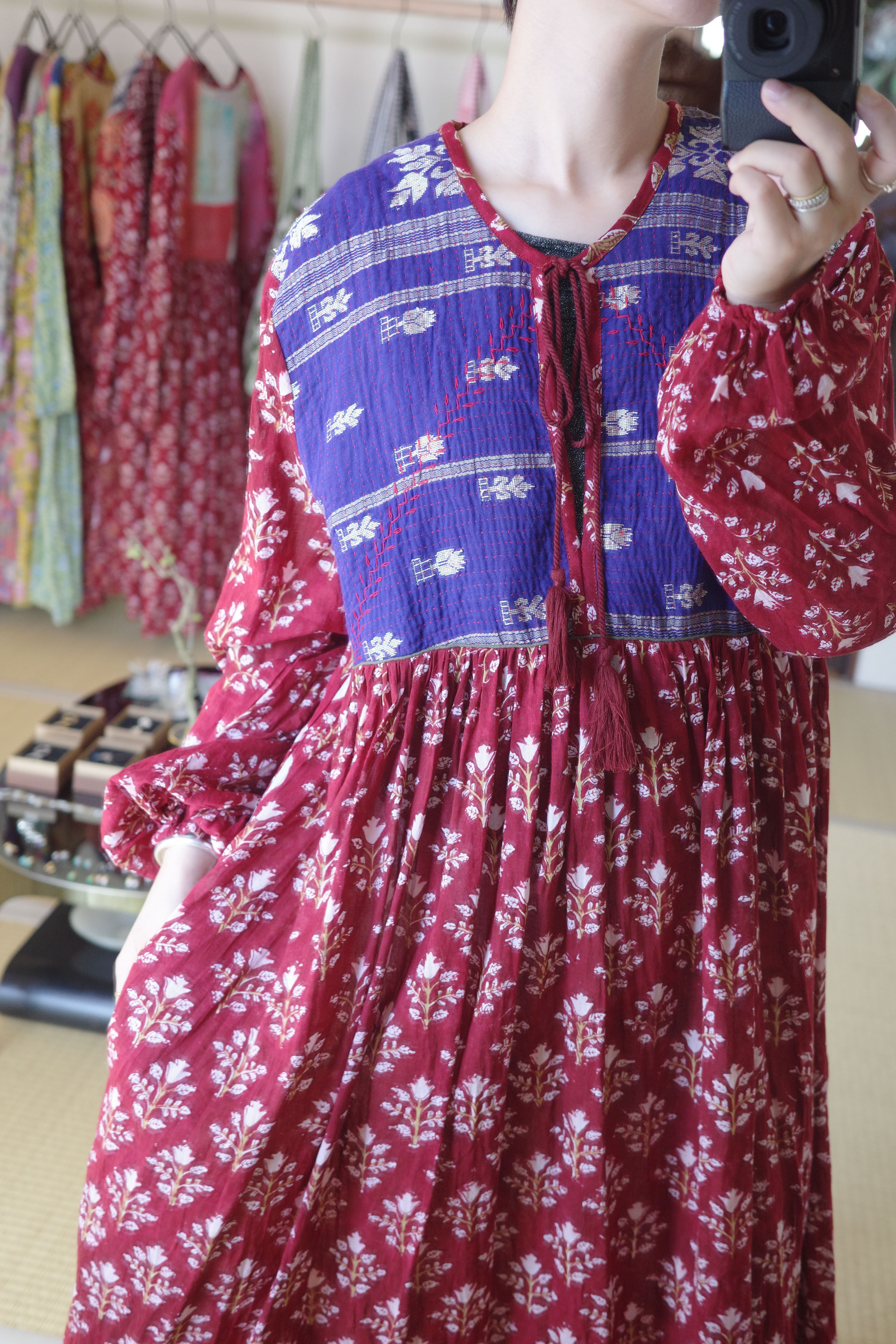 現在制作されているインド綿に美しいブロックプリントの布をドッキングしたワンピース。