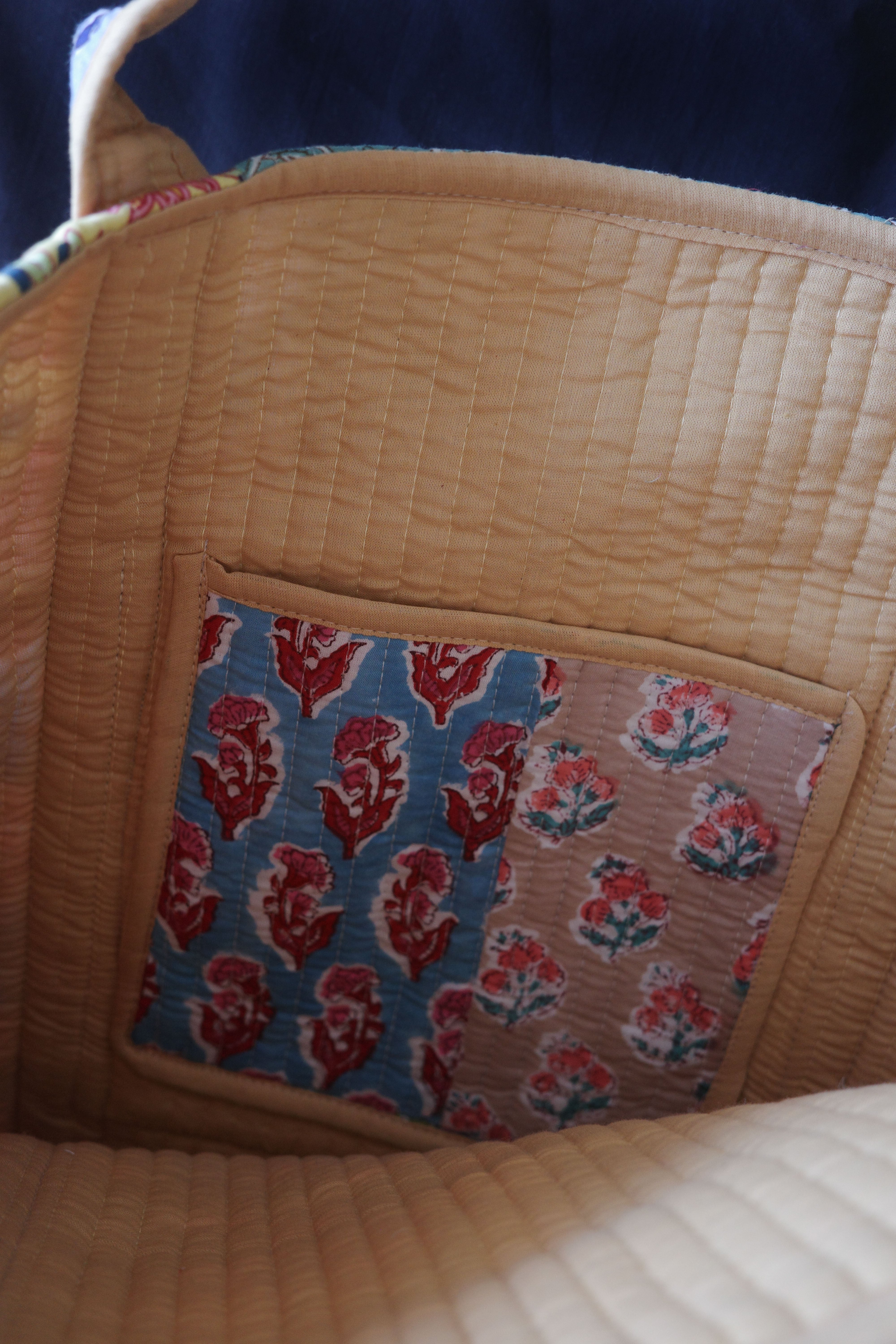 インドで制作されているキルティングのパッチワークトートバッグ。